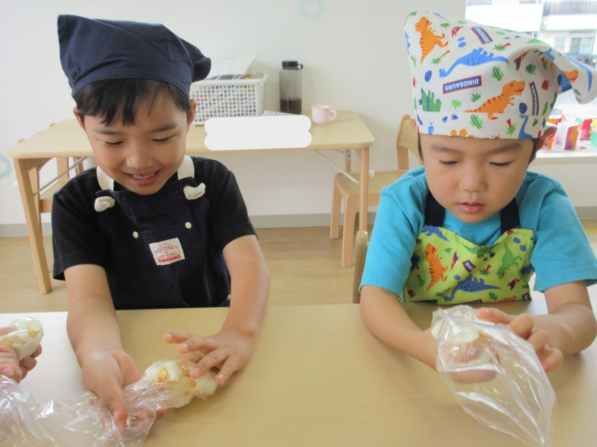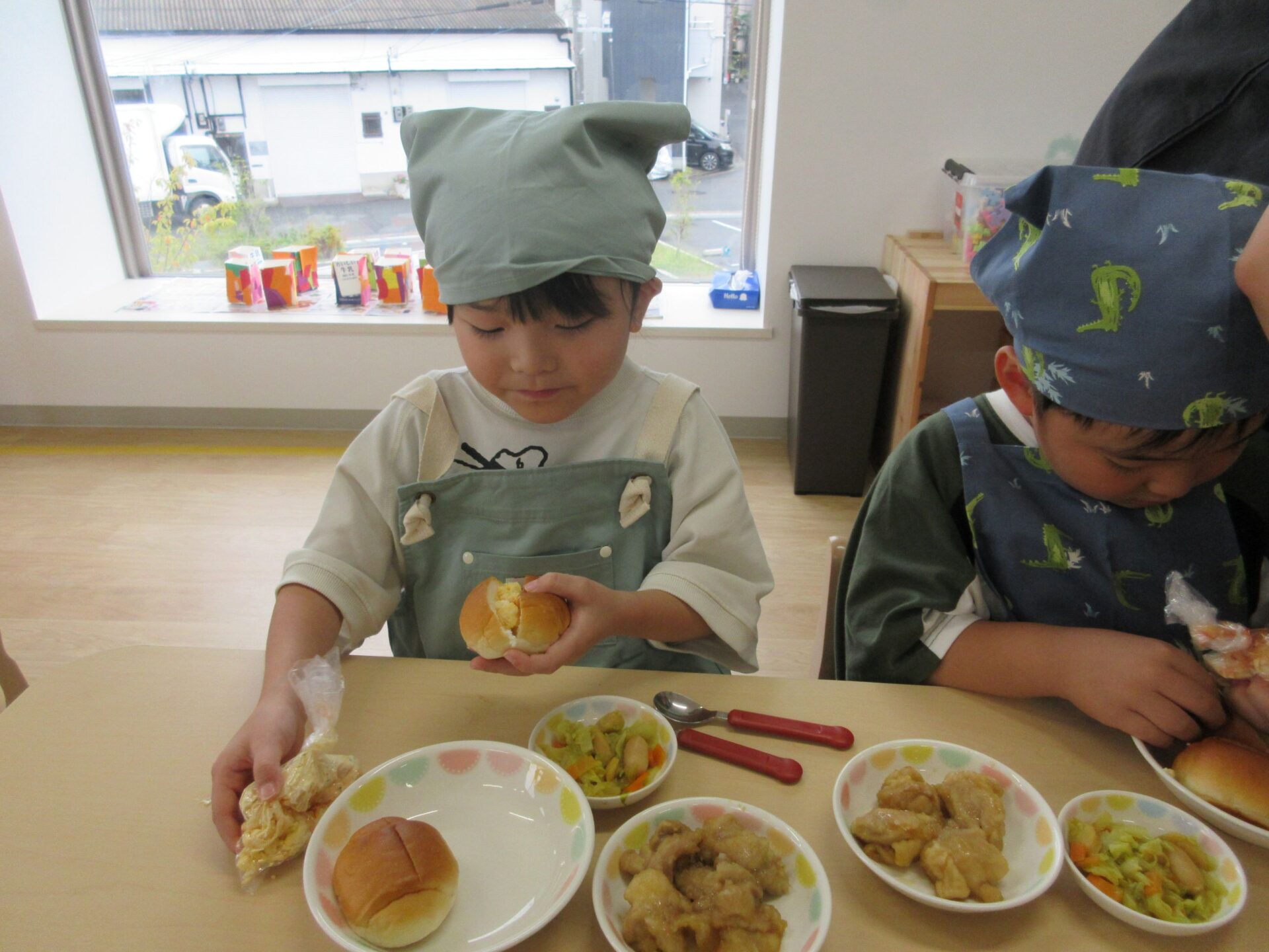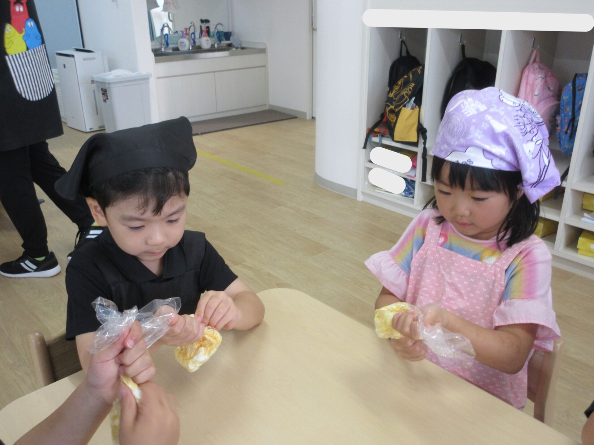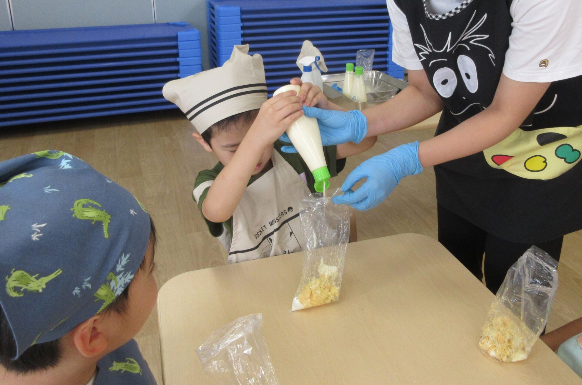 2025.10.27 ブログ 園だより クッキング~運動会頑張ったねパーティー✨~(5歳くじら組) 運動会が終わり、楽しみにしていたクッキング☆作るのは、ロールパンサンドです。タルタルソースも作りました♪ まずはゆで卵の殻をむいて、袋に入れます。小さな殻が残らないようにみんな真剣です…! 今回は園長先生も一緒にクッキング♪前日に園長先生にはみんなで作った招待状を渡しに行きましたよ(^▽^)/ 次に卵を潰していきます。 調味料と、パセリに刻んだ玉ねぎを入れてさらに、もみこみます。 美味しくできますように! このタルタルソースは、この日の給食、チキン南蛮にもかけます(o^―^o) タルタルソース出来上がり! 具材を自由に盛り付け、自分だけのオリジナルサンドを作っていきます☆ サプライズで、乾杯用のカルピスを用意してもらいました♡ 運動会お疲れさまー!!カンパーイ!! ロールパンサンドも美味しいね✨ 楽しいクッキングは、「運動会頑張ったねパーティー」でした🎉 一覧へ戻る