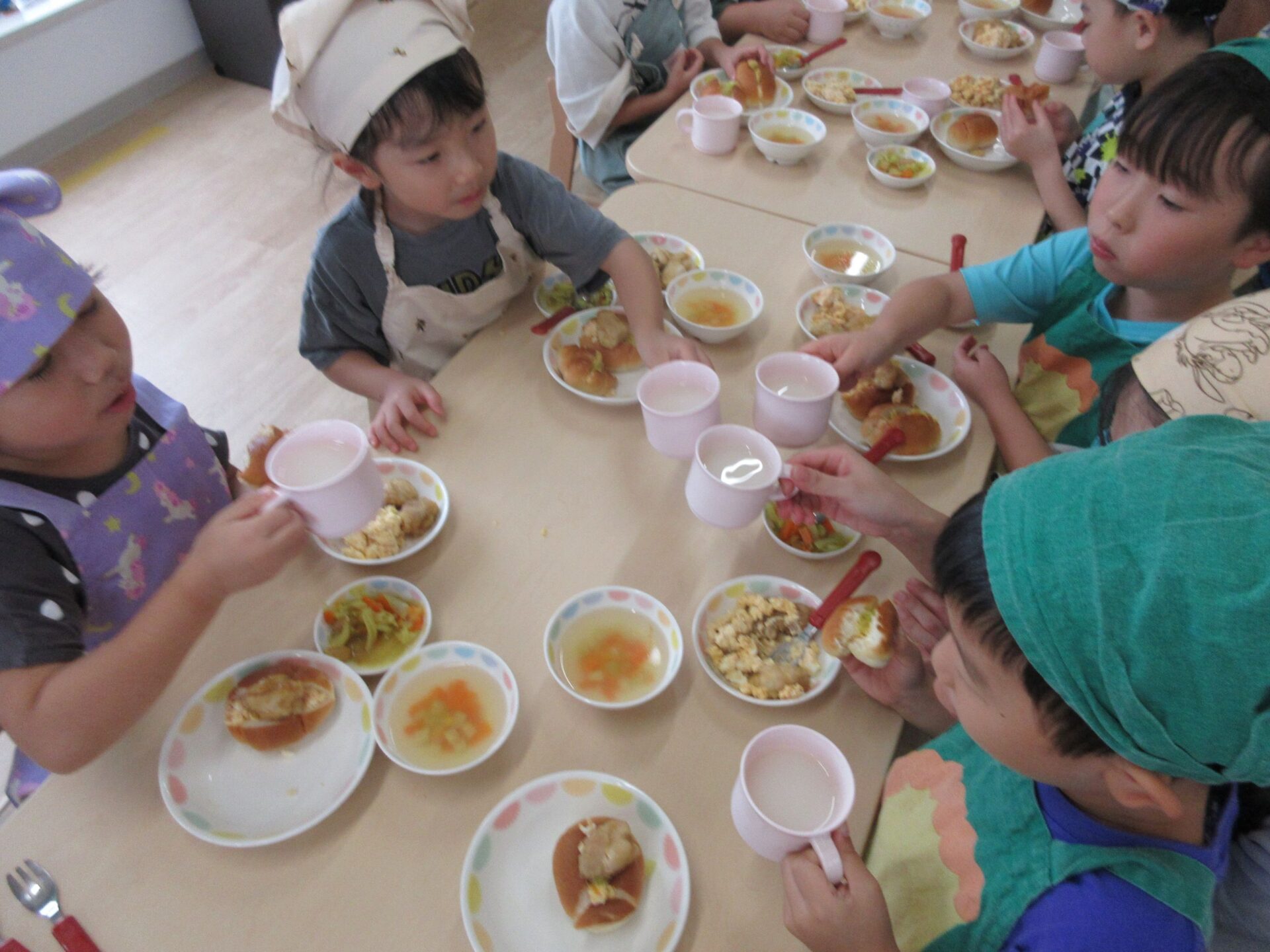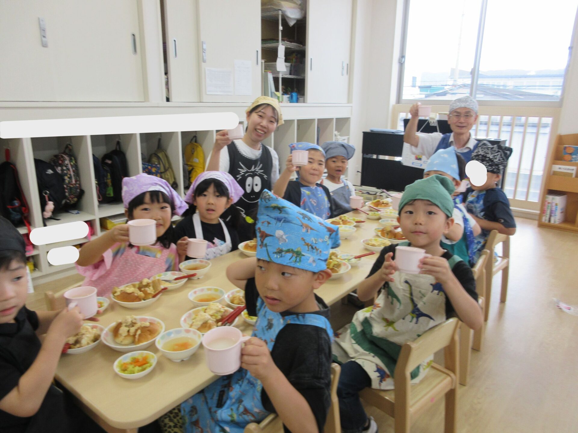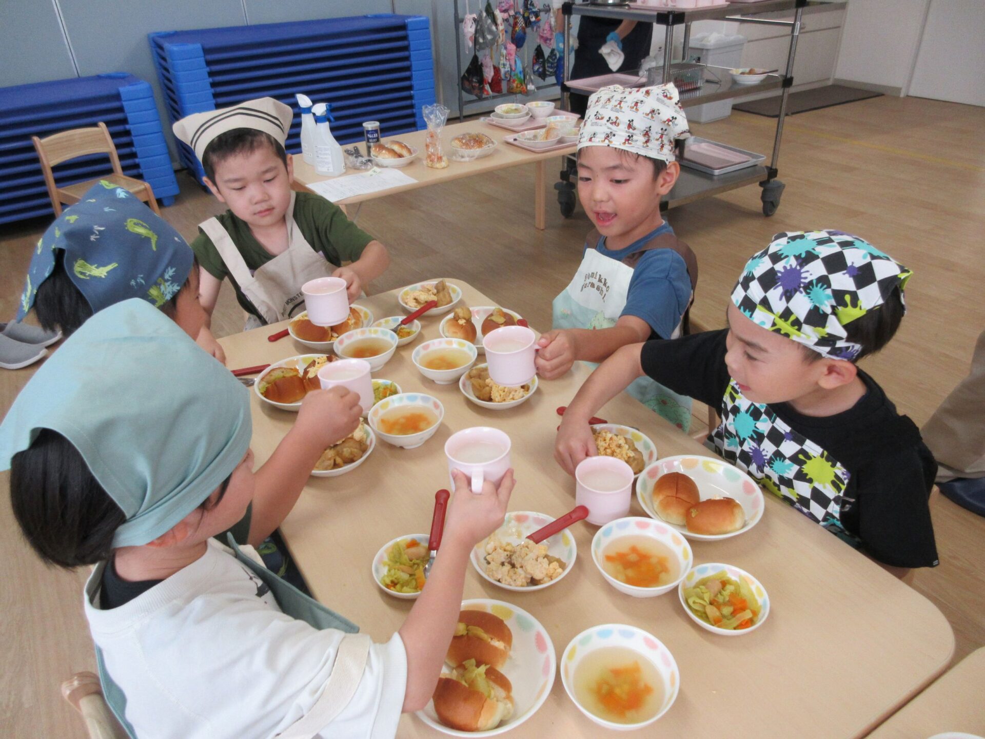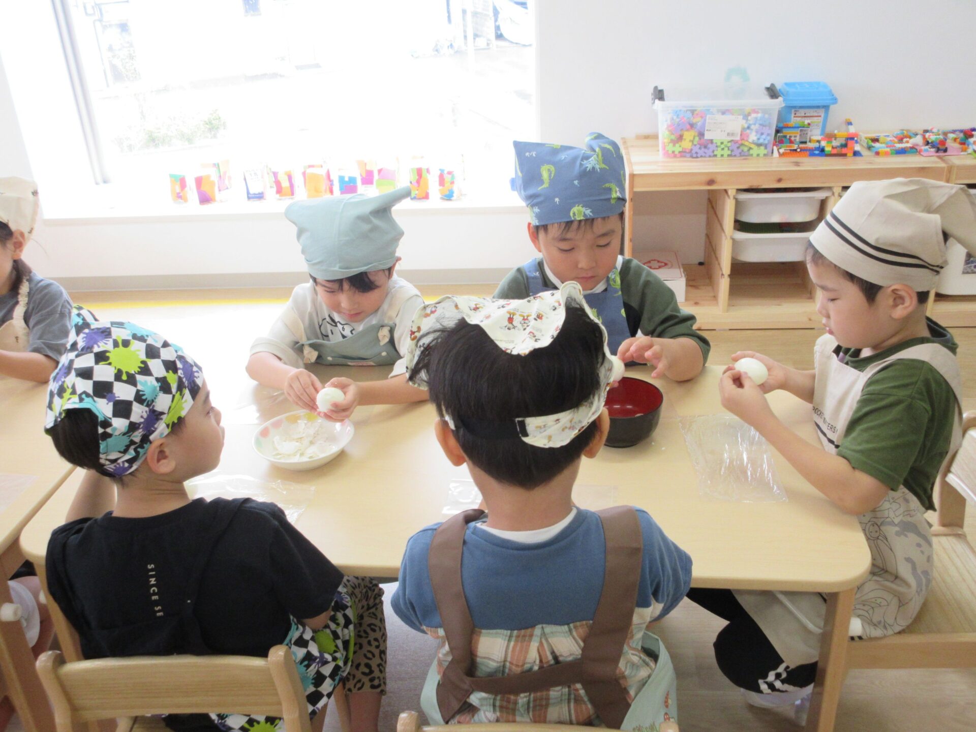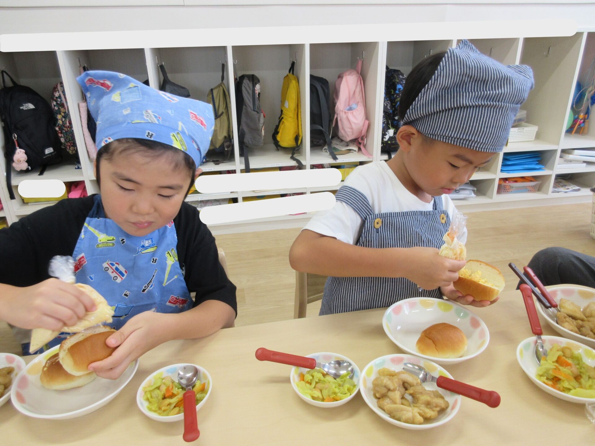 2025.10.27 ブログ 園だより クッキング~運動会頑張ったねパーティー✨~(5歳くじら組) 運動会が終わり、楽しみにしていたクッキング☆作るのは、ロールパンサンドです。タルタルソースも作りました♪ まずはゆで卵の殻をむいて、袋に入れます。小さな殻が残らないようにみんな真剣です…! 今回は園長先生も一緒にクッキング♪前日に園長先生にはみんなで作った招待状を渡しに行きましたよ(^▽^)/ 次に卵を潰していきます。 調味料と、パセリに刻んだ玉ねぎを入れてさらに、もみこみます。 美味しくできますように! このタルタルソースは、この日の給食、チキン南蛮にもかけます(o^―^o) タルタルソース出来上がり! 具材を自由に盛り付け、自分だけのオリジナルサンドを作っていきます☆ サプライズで、乾杯用のカルピスを用意してもらいました♡ 運動会お疲れさまー!!カンパーイ!! ロールパンサンドも美味しいね✨ 楽しいクッキングは、「運動会頑張ったねパーティー」でした🎉 一覧へ戻る