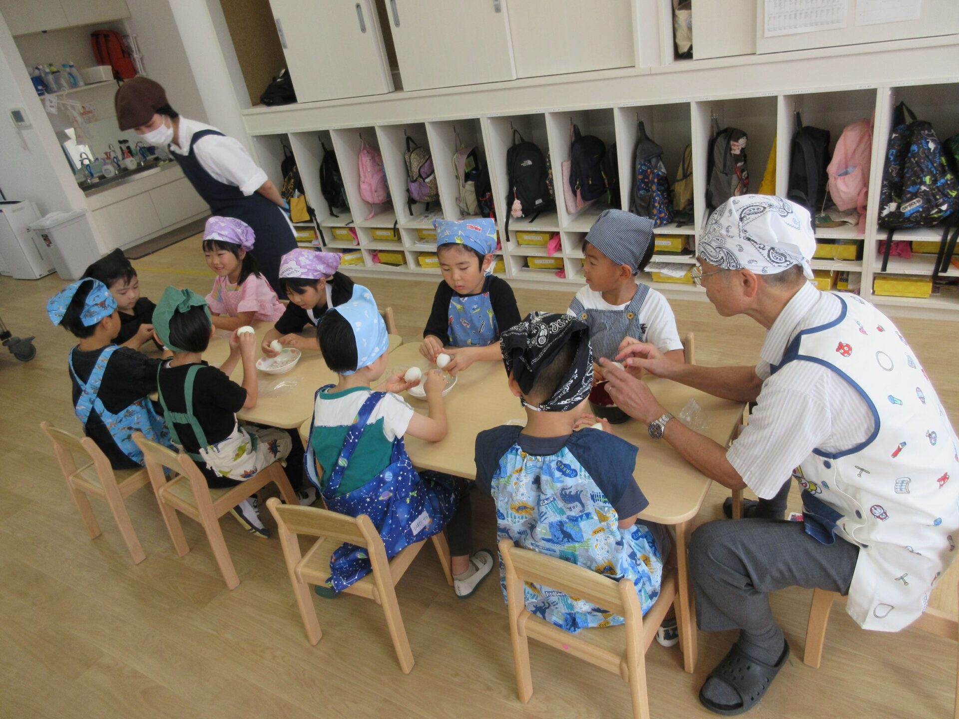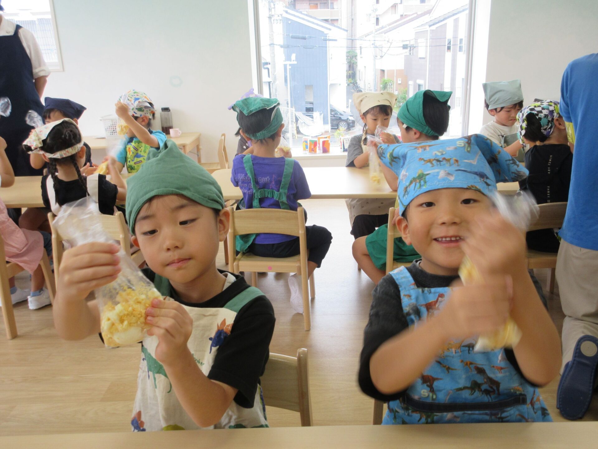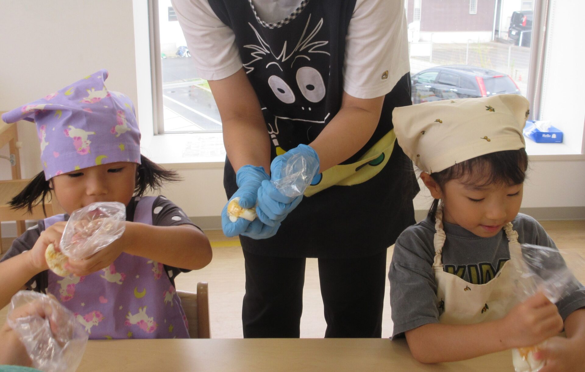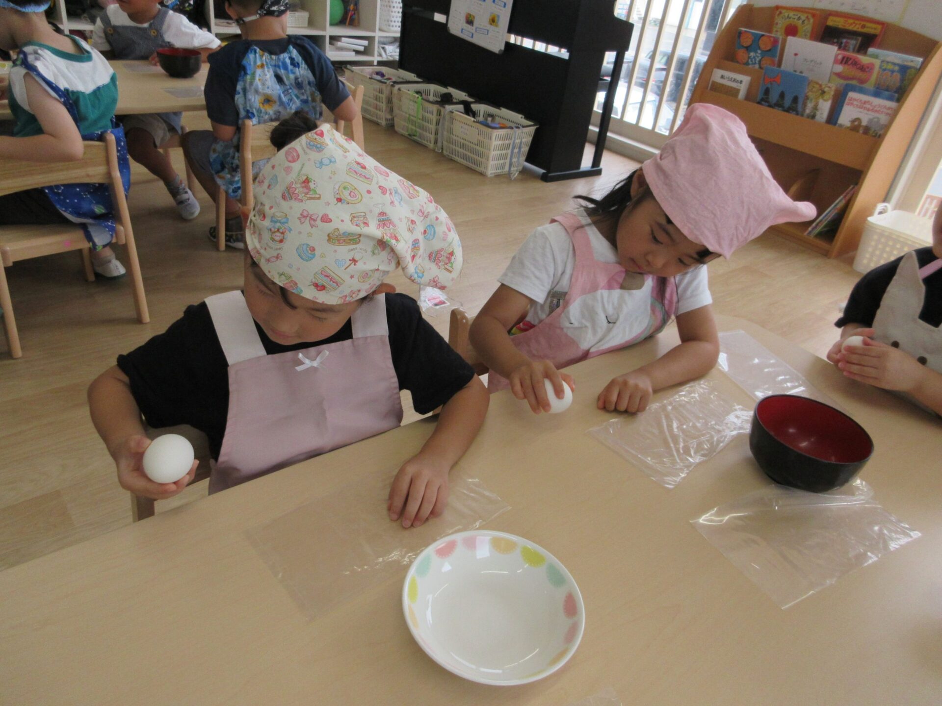2025.10.27 ブログ 園だより クッキング~運動会頑張ったねパーティー✨~(5歳くじら組) 運動会が終わり、楽しみにしていたクッキング☆作るのは、ロールパンサンドです。タルタルソースも作りました♪ まずはゆで卵の殻をむいて、袋に入れます。小さな殻が残らないようにみんな真剣です…! 今回は園長先生も一緒にクッキング♪前日に園長先生にはみんなで作った招待状を渡しに行きましたよ(^▽^)/ 次に卵を潰していきます。 調味料と、パセリに刻んだ玉ねぎを入れてさらに、もみこみます。 美味しくできますように! このタルタルソースは、この日の給食、チキン南蛮にもかけます(o^―^o) タルタルソース出来上がり! 具材を自由に盛り付け、自分だけのオリジナルサンドを作っていきます☆ サプライズで、乾杯用のカルピスを用意してもらいました♡ 運動会お疲れさまー!!カンパーイ!! ロールパンサンドも美味しいね✨ 楽しいクッキングは、「運動会頑張ったねパーティー」でした🎉 一覧へ戻る