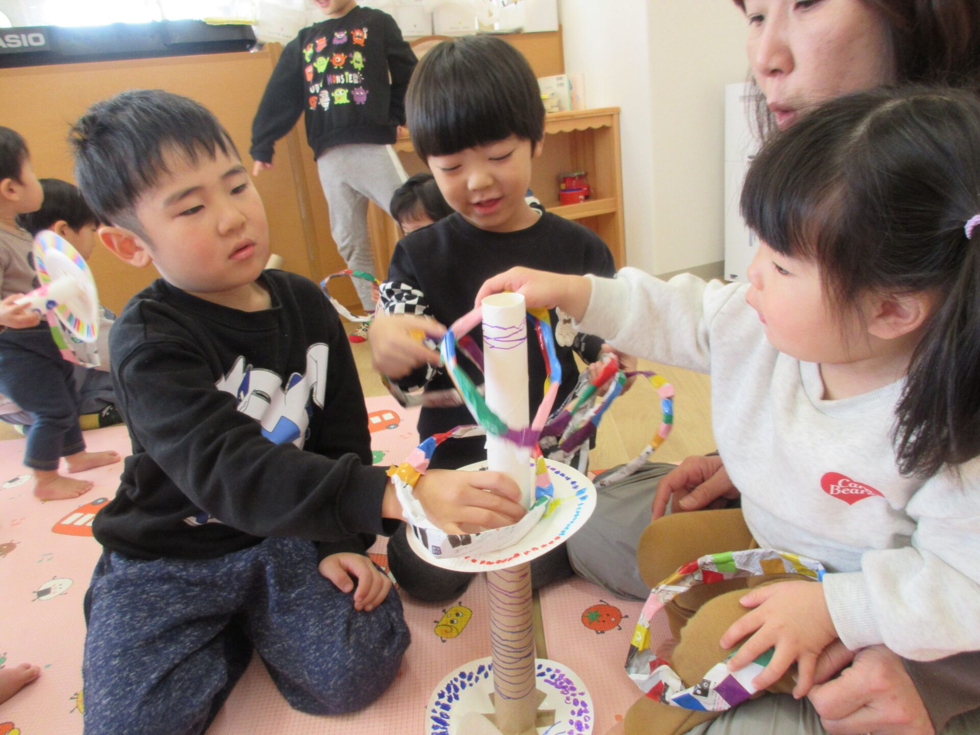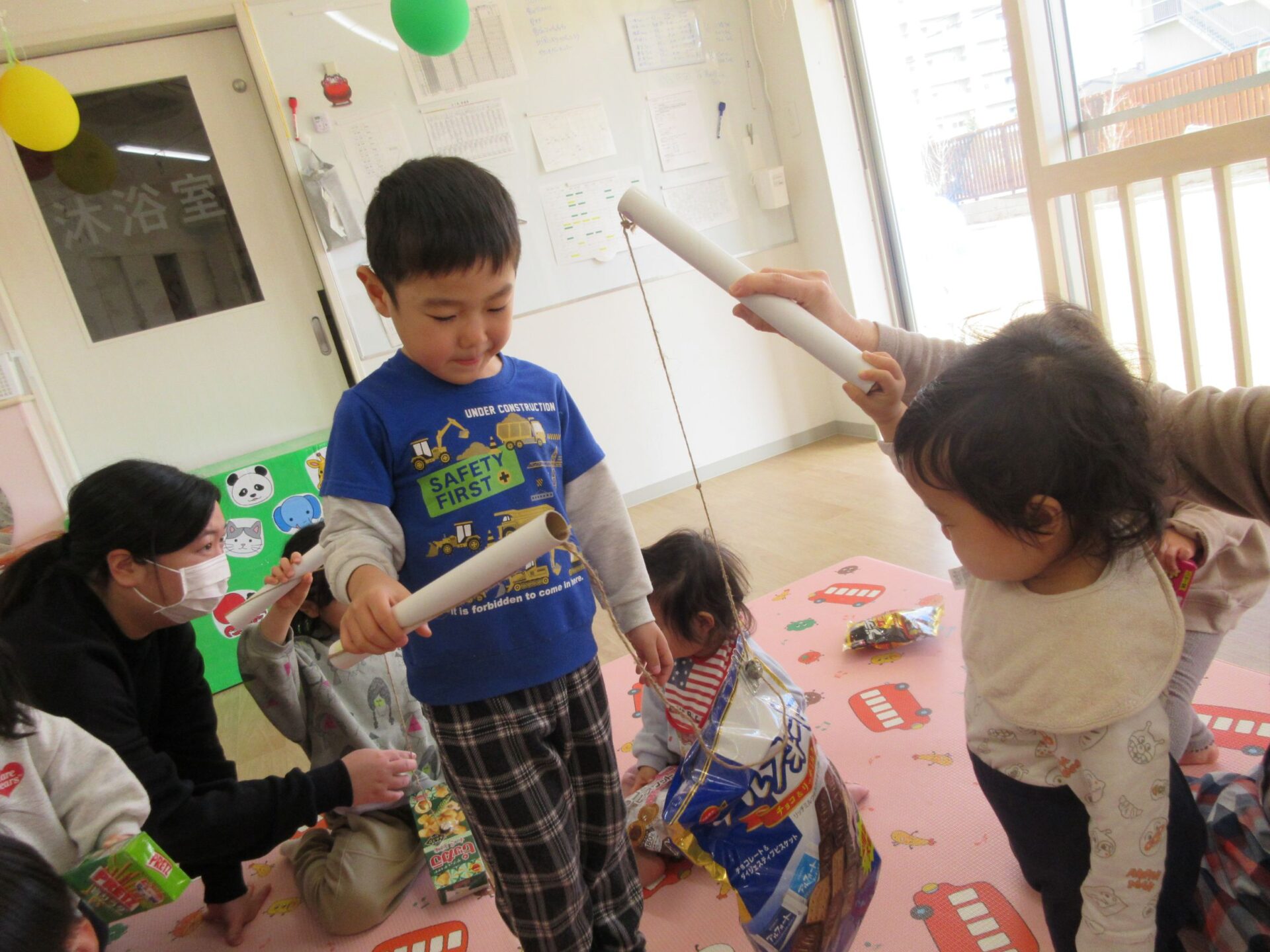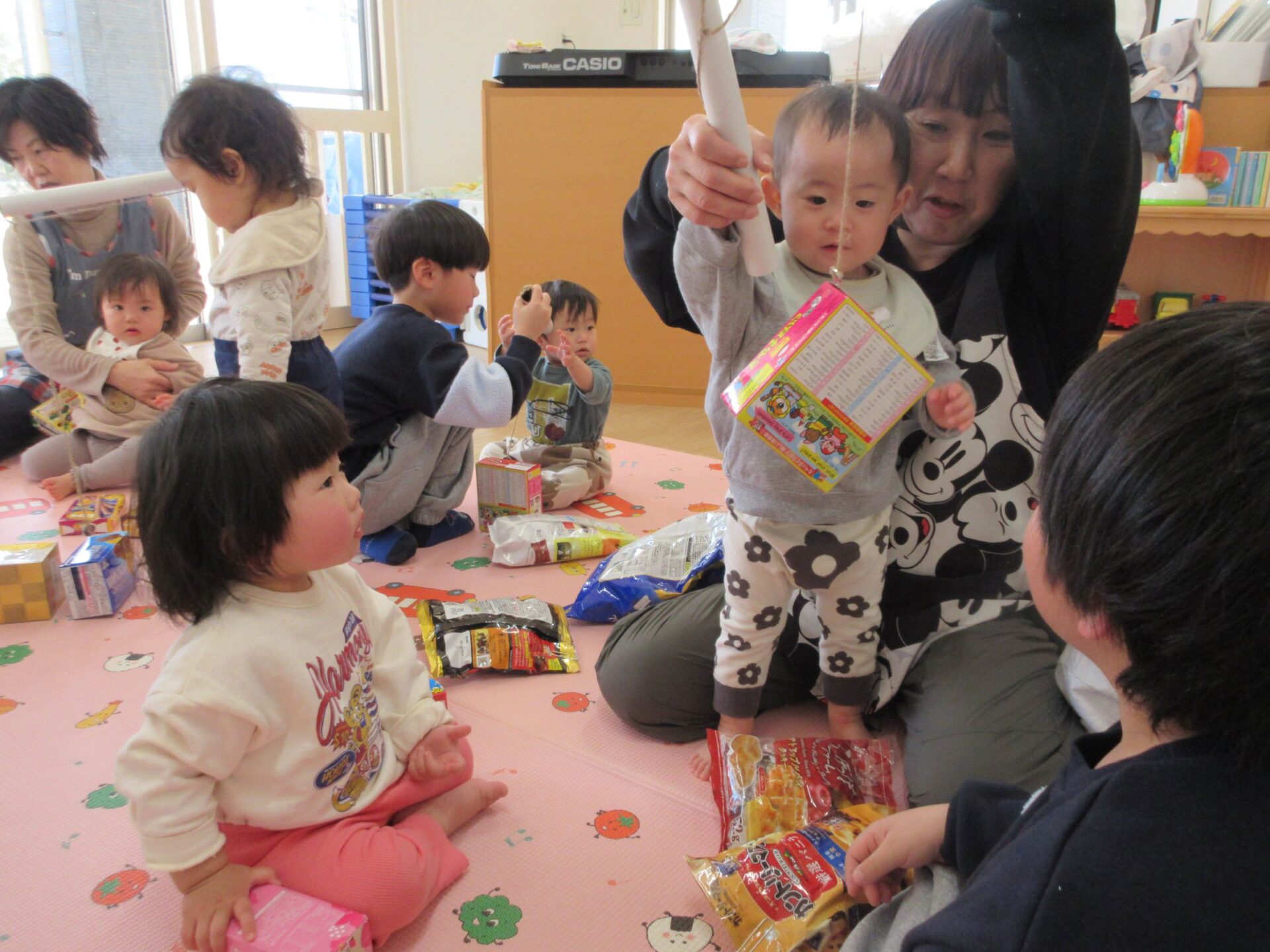 お祭りごっこで作ったお菓子釣り、輪投げも一緒に楽しむことができました!