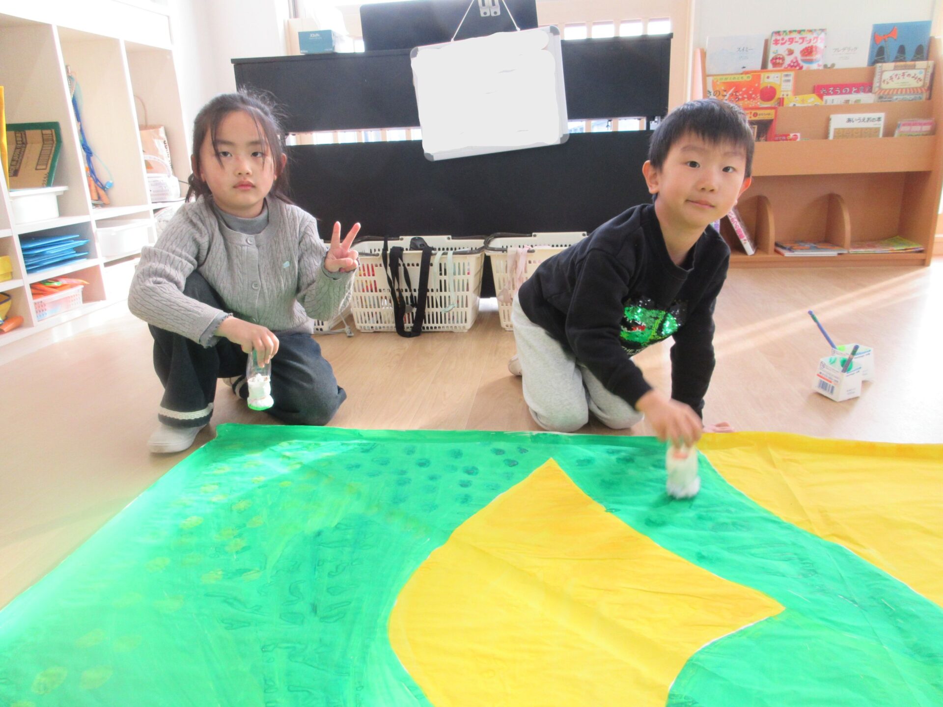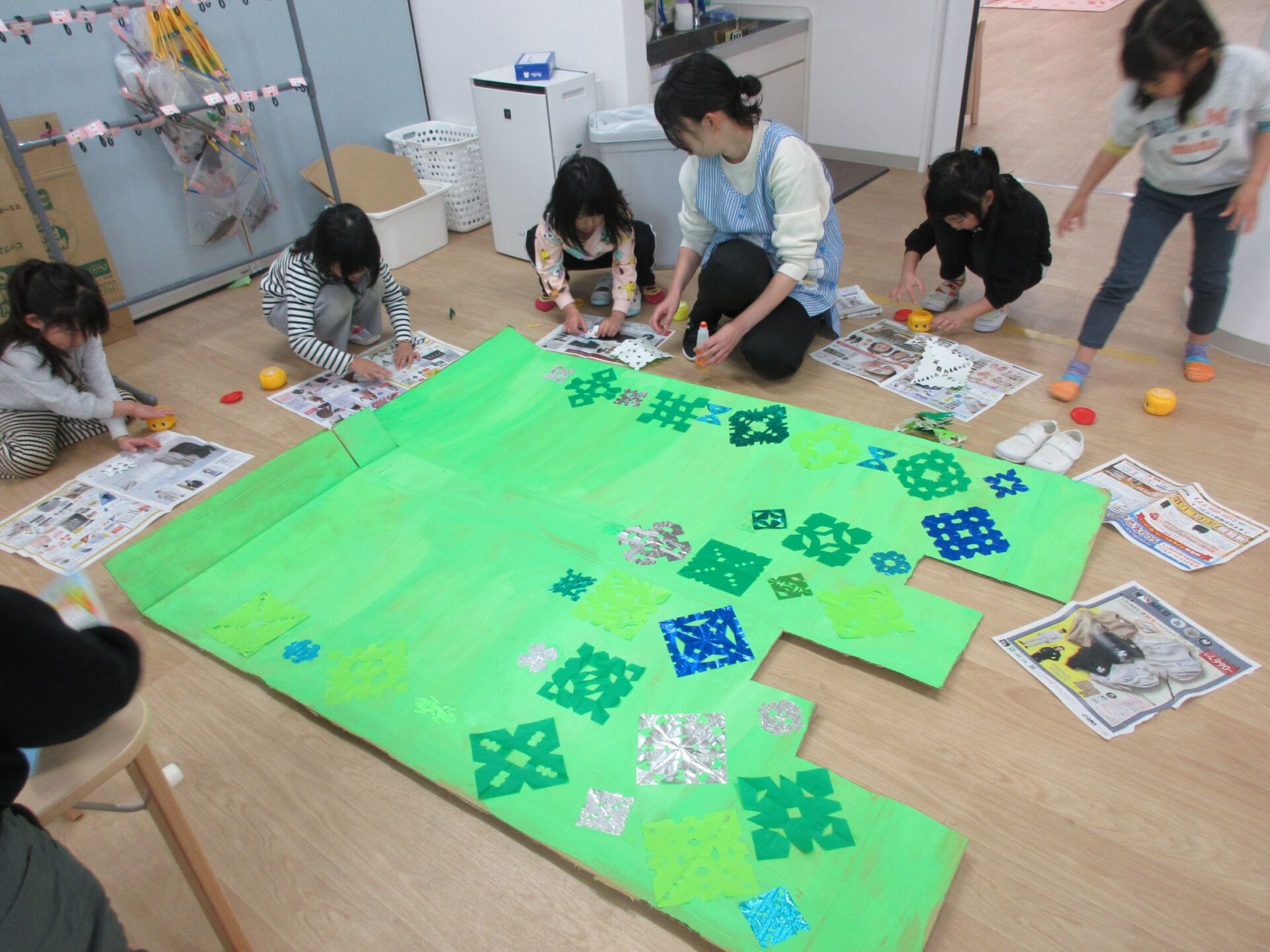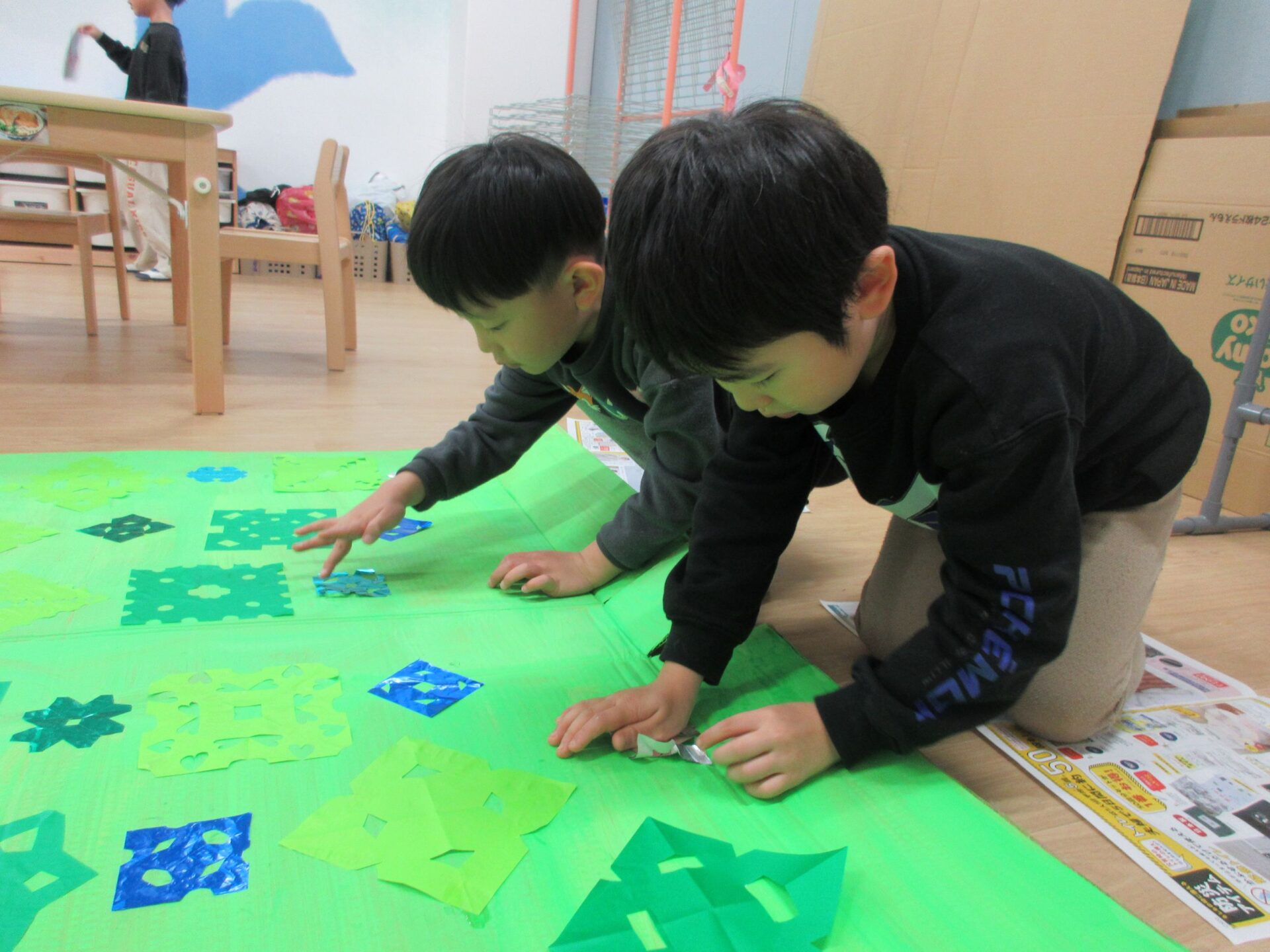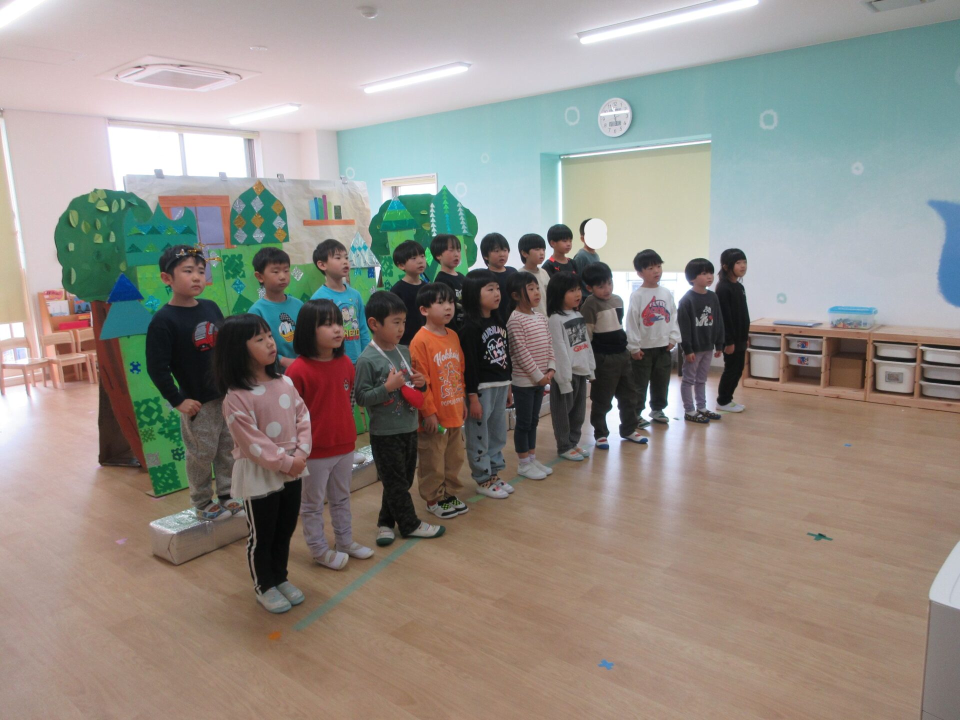 2026.02.10 ブログ 園だより 発表会準備~オズの世界ができるまで🌈~ (5歳 くじら組) 年末頃から少しずつ進めていた、発表会大道具製作。その一部は子どもたちで作りました! 劇中でも印象強い、オズの魔法使いがいる「エメラルドの都」を作りました。折り紙を自由に切り絵していきます。 切ったものを破れないように貼っていきます✨同じ模様は一つもありません!ちなみに、エメラルドの都では、住んでいる人も緑色で包まれているのです!(^^)!本番はかわいいダンスにもご注目くださいね♪ こちらはエメラルドの都に向かう、黄色いレンガの道の背景作りの様子です✨ タンポで立体感を出しています(^▽^)/ そして、黄色い道にレンガの模様を1つずつスタンプしていきます。 隣に、また隣に…地道にスタンプしていきました。ずれないように真剣です…!綺麗な背景は本番をお楽しみに☆ こちらは大きな虹の背景作りです。皆で一つひとつ丁寧に貼っていきながら、完成させることができました🌈 遊んでいる最中に、劇中に出てくる船を作ってくれました🚢 小道具として出てきますので、お見逃しなく♪ かかしに関係のある「けしの花」です🌹折り紙得意!という子たちが率先して折ってくれました♪ 大道具の木の幹に付いている枝は、秋のどんぐり探しと共に拾ってきたものを付けました!葉っぱも自分たちで手作りしましたよ🍃 こうして出来上がったオズの世界の中で、セリフや動きの練習に一生懸命取り組んでいます!本番まで、あとわずかとなりました🌟くじら組でお届けするオズの魔法使い、お楽しみに!!✨🌈 一覧へ戻る