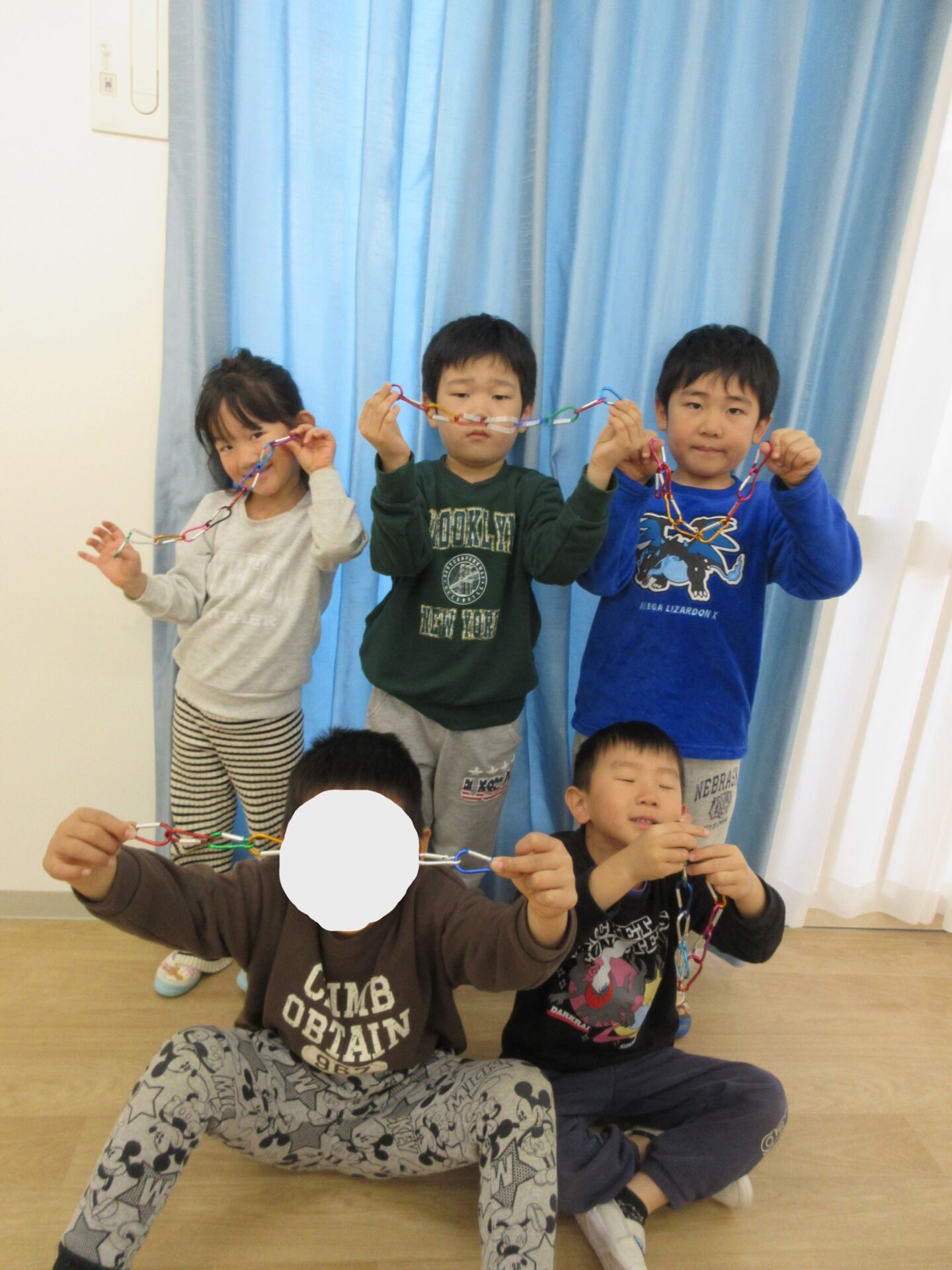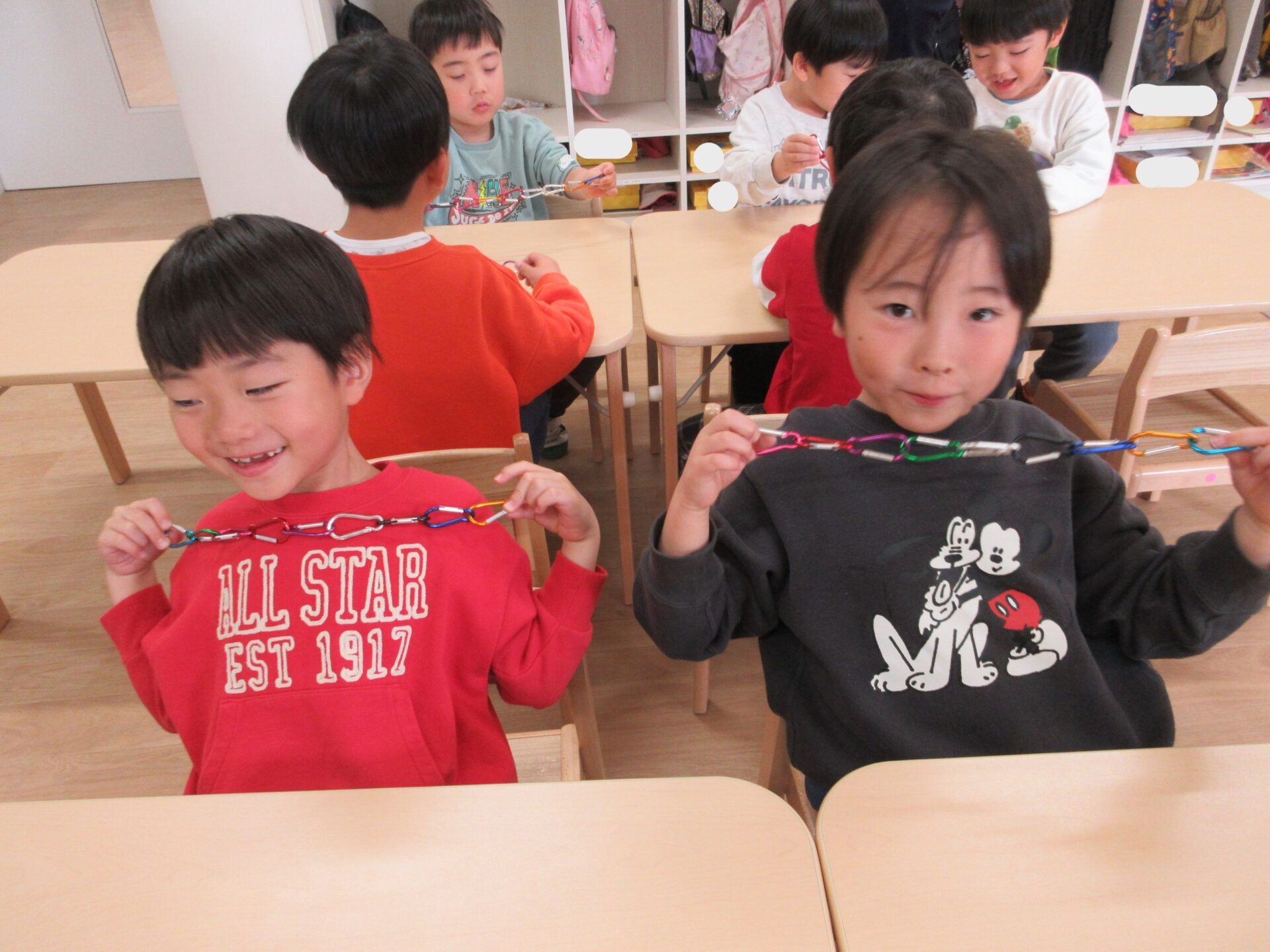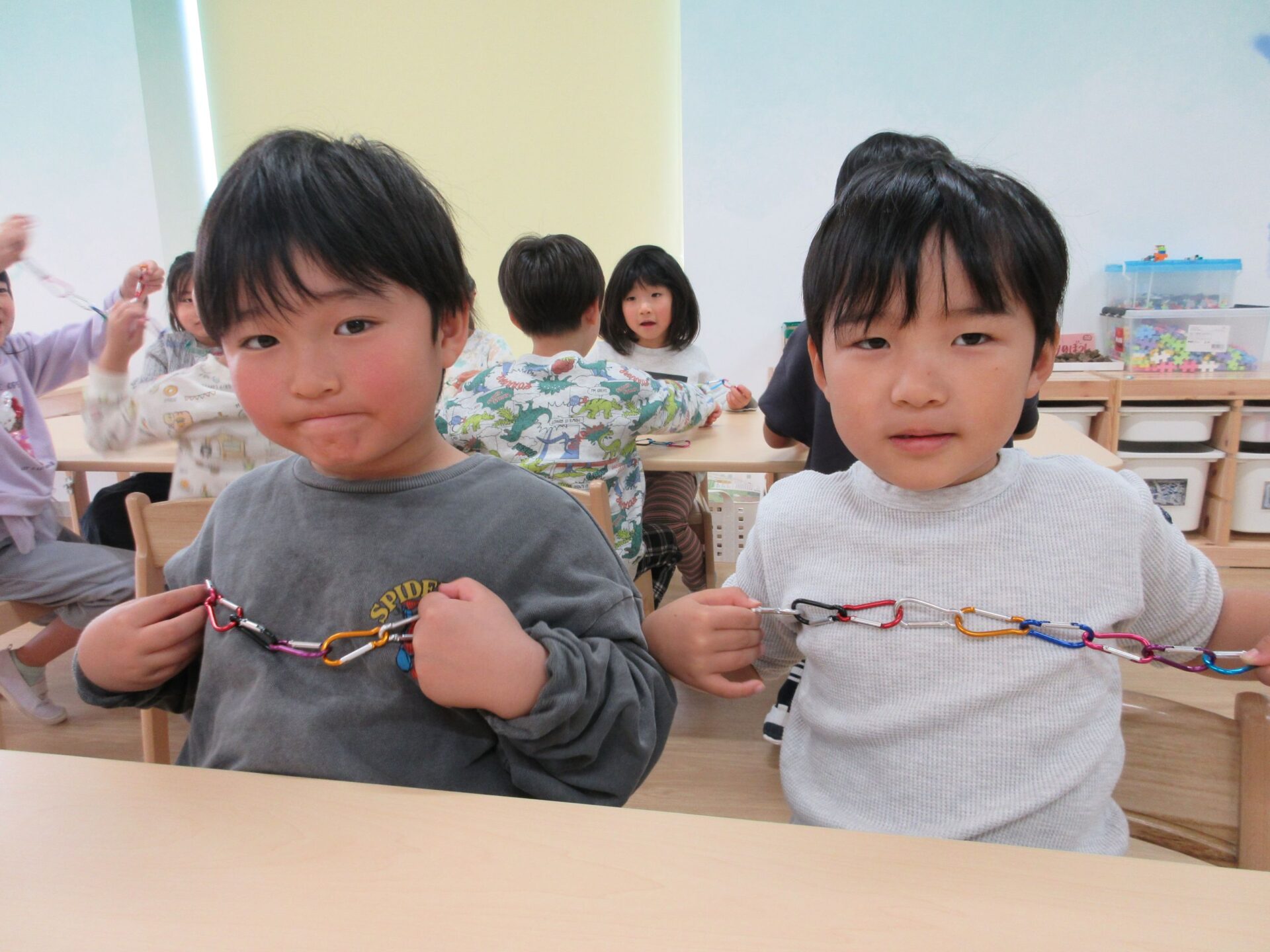 2026.02.20 ブログ 園だより 未来のゲルニカ製作🐳🌟 (5歳 くじら組) 12月頃、くじら組で未来のゲルニカ製作をしました🐳園長先生から子どもたちにゲルニカについてのお話をしてもらいました! 子どもたちに渡されたのは、10本程の「カラビナ」 カラフルなカラビナを一本につなぎ合わせていきます。 平和へのメッセージを込めて…という思いから始まった、くじらゲルニカ。今回のテーマは「未来」です✨ 全国のくじらの園の子どもたちが繋げたものが集まり、今年は此処、美園くじらこども園に飾られます。 3月、思いが込められた大きなくじらを見られるのが私たちも楽しみです🐳🌟 「できたっ!✨」 自分で繋げたカラビナは、くじらのどの部分になるのかな?☺ 「じゃーん!!」 当日、おやすみしていた子たちは別日に行いました♪ これからも様々な形で、平和への思い、子どもたちの未来へ向けた取り組みへ、繋がることができたらと思います🌈 未来のゲルニカ、お楽しみに!!🐳🌟 一覧へ戻る