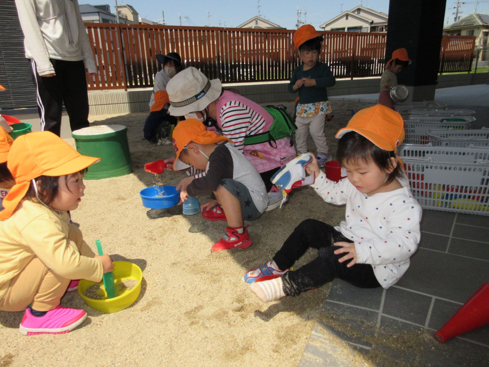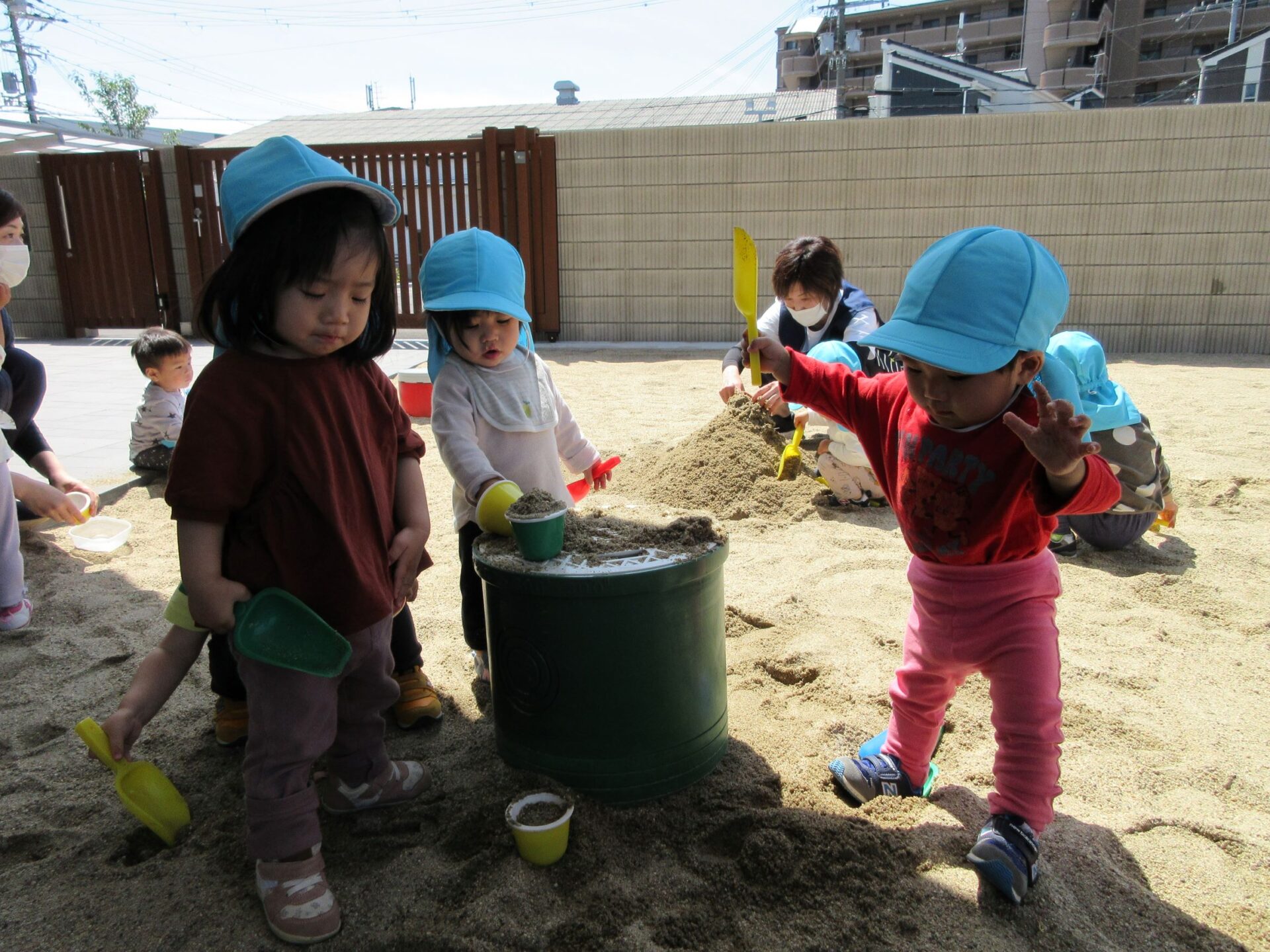 2歳あめ組も、砂場で遊びました。今日は、とてもいいお天気です。