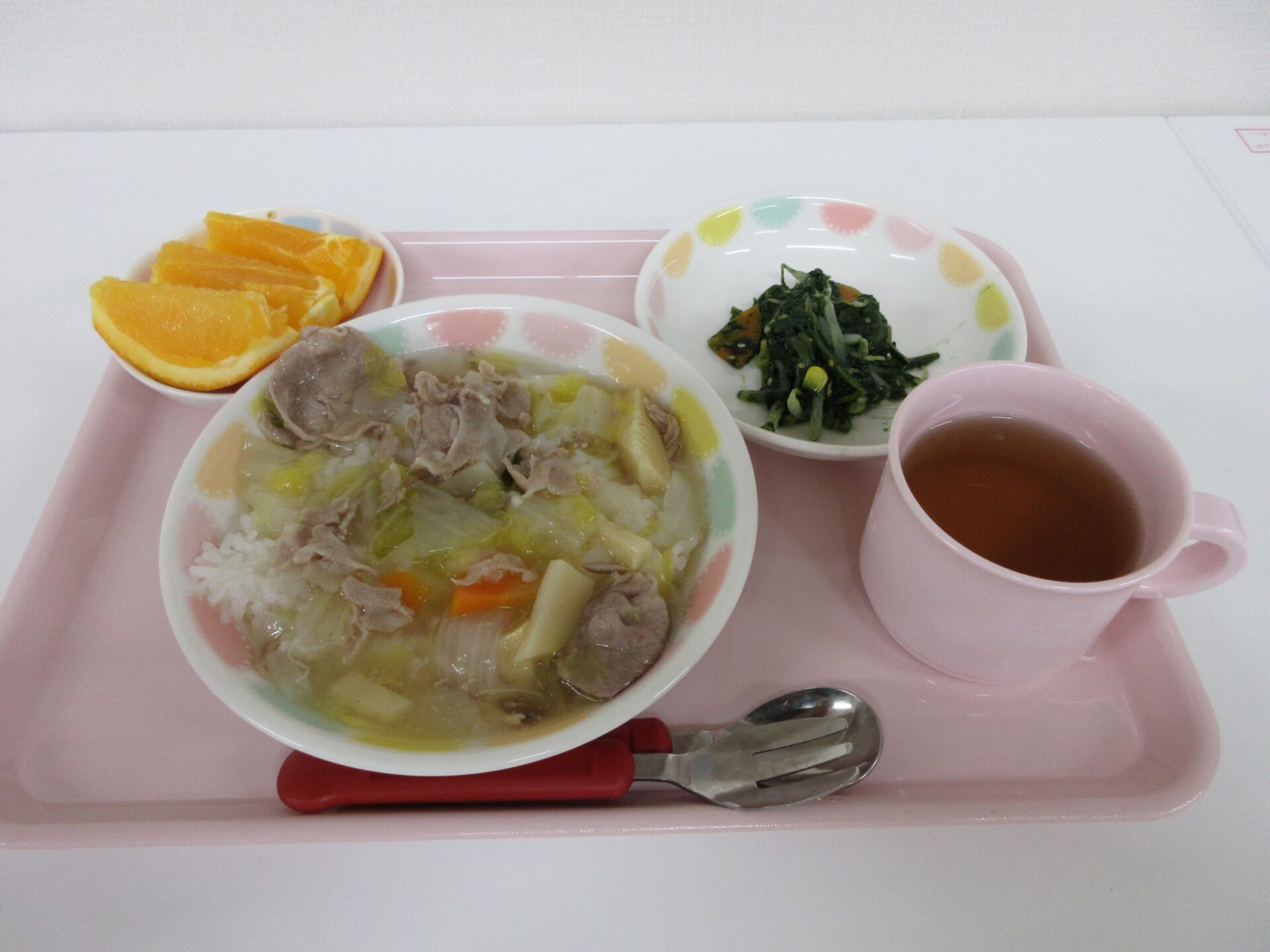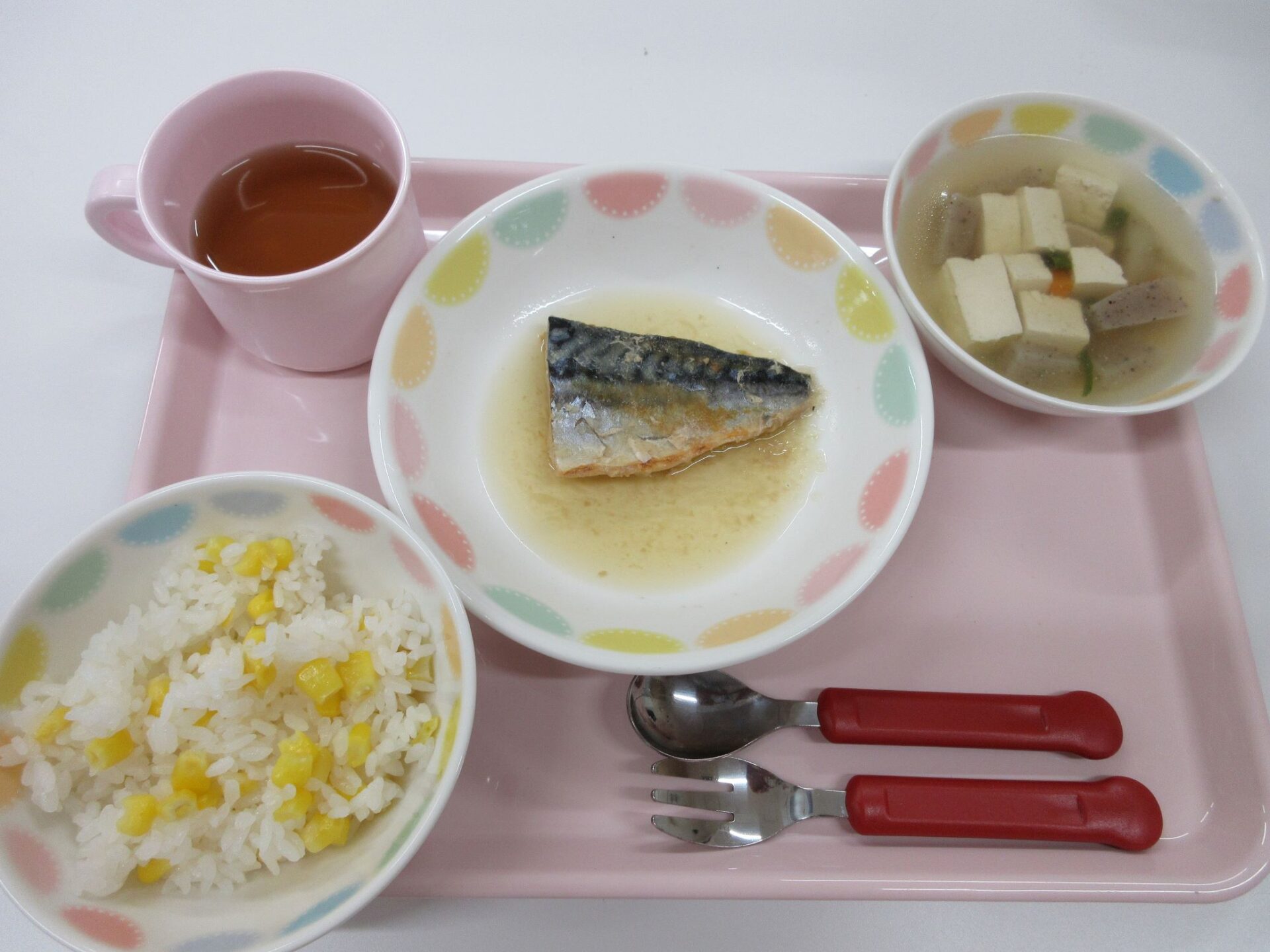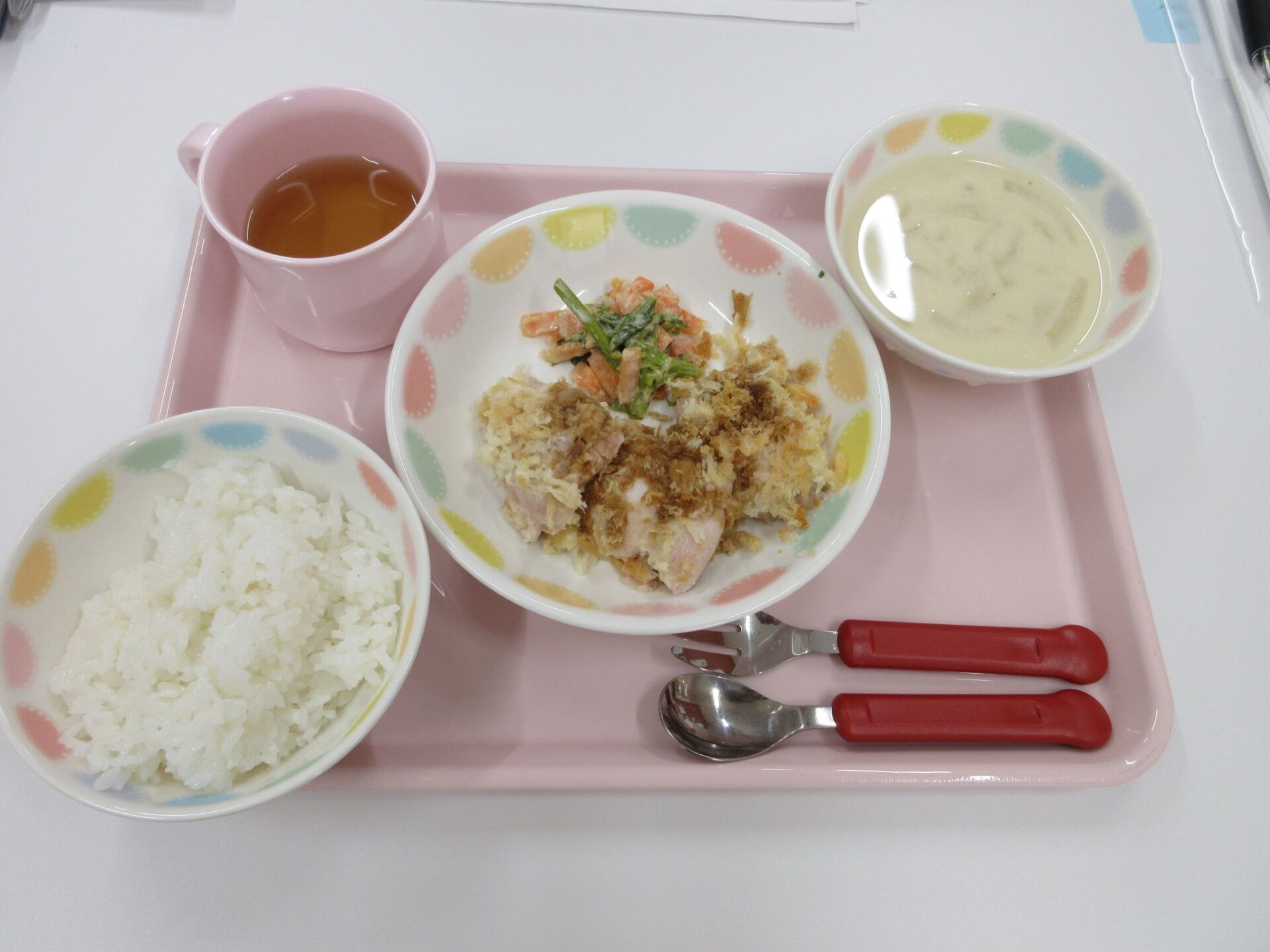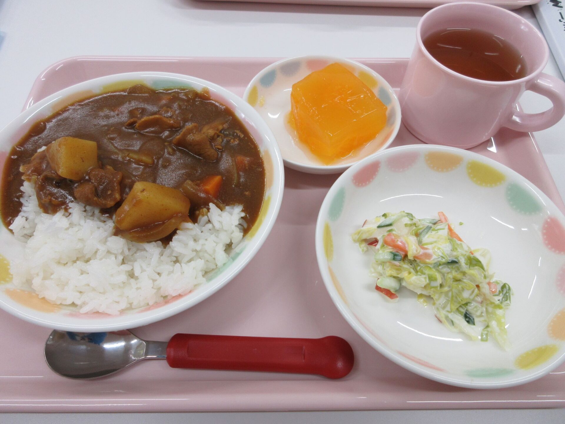 2023.05.31 お知らせ ブログ もう一度食べたい給食メニュー 開園してはや2か月。もう一度食べたい給食メニューを紹介します。その日のメニューの写真は、入り口の掲示板でお知らせしています。 4月11日 カレーライス、コールスローサラダ、みかん寒天 4月19日 ロールパン、シチュー、アスパラのサラダ、バナナ 4月20日 ご飯、鶏肉のパン粉焼き、菜の花のツナ和え、コーンスープ 4月22日(土) 中華丼、チンゲン菜スープ、バナナ 4月24日 ひじきごはん、白身魚のあんかけ、玉ねぎのみそ汁、デコポン 5月2日 八宝菜丼、ほうれん草のナムル、オレンジ 5月24日 親子丼、キャベツのゆかり和え、里芋と玉ねぎのみそ汁 5月29日 とうもろこしご飯、さばのおろし煮、けんちん汁(しょうゆベース) 5月30日 ごはん、鶏のからあげ、野菜サラダ、さつまいもと玉ねぎのみそ汁 園長が日曜日に給食と同じ料理に挑戦中。「やっぱり、園の給食のほうが美味しい・・」。栄養士さん、調理師さん、いつもおいしい給食、ありがとうございます。 一覧へ戻る