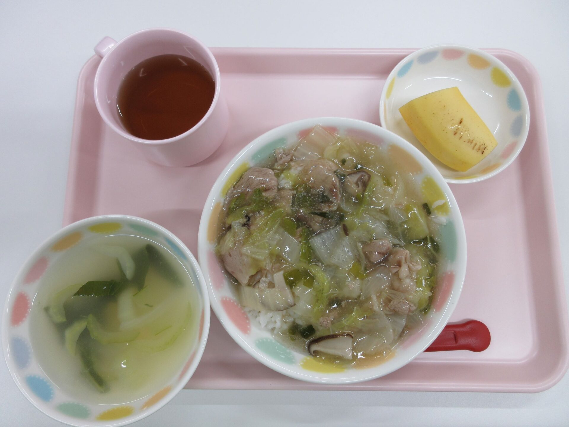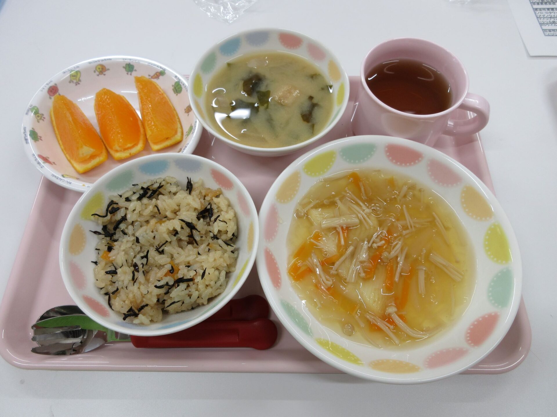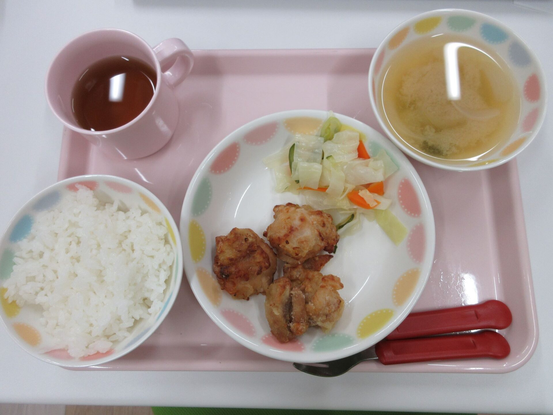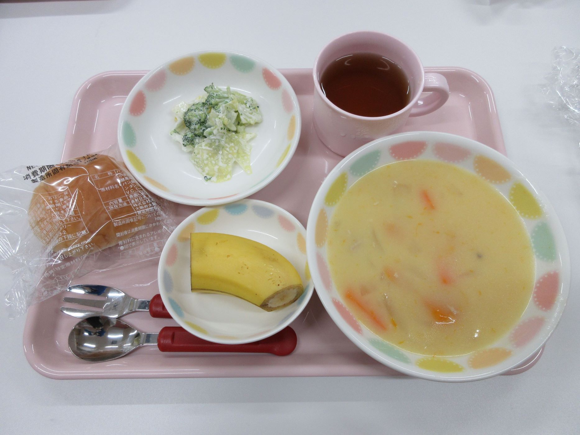 2023.05.31 お知らせ ブログ もう一度食べたい給食メニュー 開園してはや2か月。もう一度食べたい給食メニューを紹介します。その日のメニューの写真は、入り口の掲示板でお知らせしています。 4月11日 カレーライス、コールスローサラダ、みかん寒天 4月19日 ロールパン、シチュー、アスパラのサラダ、バナナ 4月20日 ご飯、鶏肉のパン粉焼き、菜の花のツナ和え、コーンスープ 4月22日(土) 中華丼、チンゲン菜スープ、バナナ 4月24日 ひじきごはん、白身魚のあんかけ、玉ねぎのみそ汁、デコポン 5月2日 八宝菜丼、ほうれん草のナムル、オレンジ 5月24日 親子丼、キャベツのゆかり和え、里芋と玉ねぎのみそ汁 5月29日 とうもろこしご飯、さばのおろし煮、けんちん汁(しょうゆベース) 5月30日 ごはん、鶏のからあげ、野菜サラダ、さつまいもと玉ねぎのみそ汁 園長が日曜日に給食と同じ料理に挑戦中。「やっぱり、園の給食のほうが美味しい・・」。栄養士さん、調理師さん、いつもおいしい給食、ありがとうございます。 一覧へ戻る