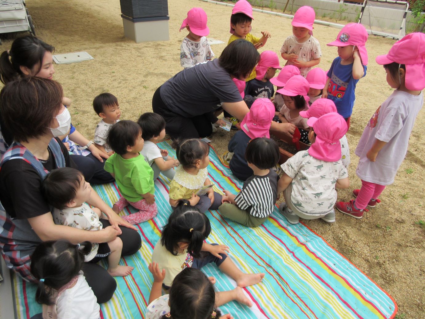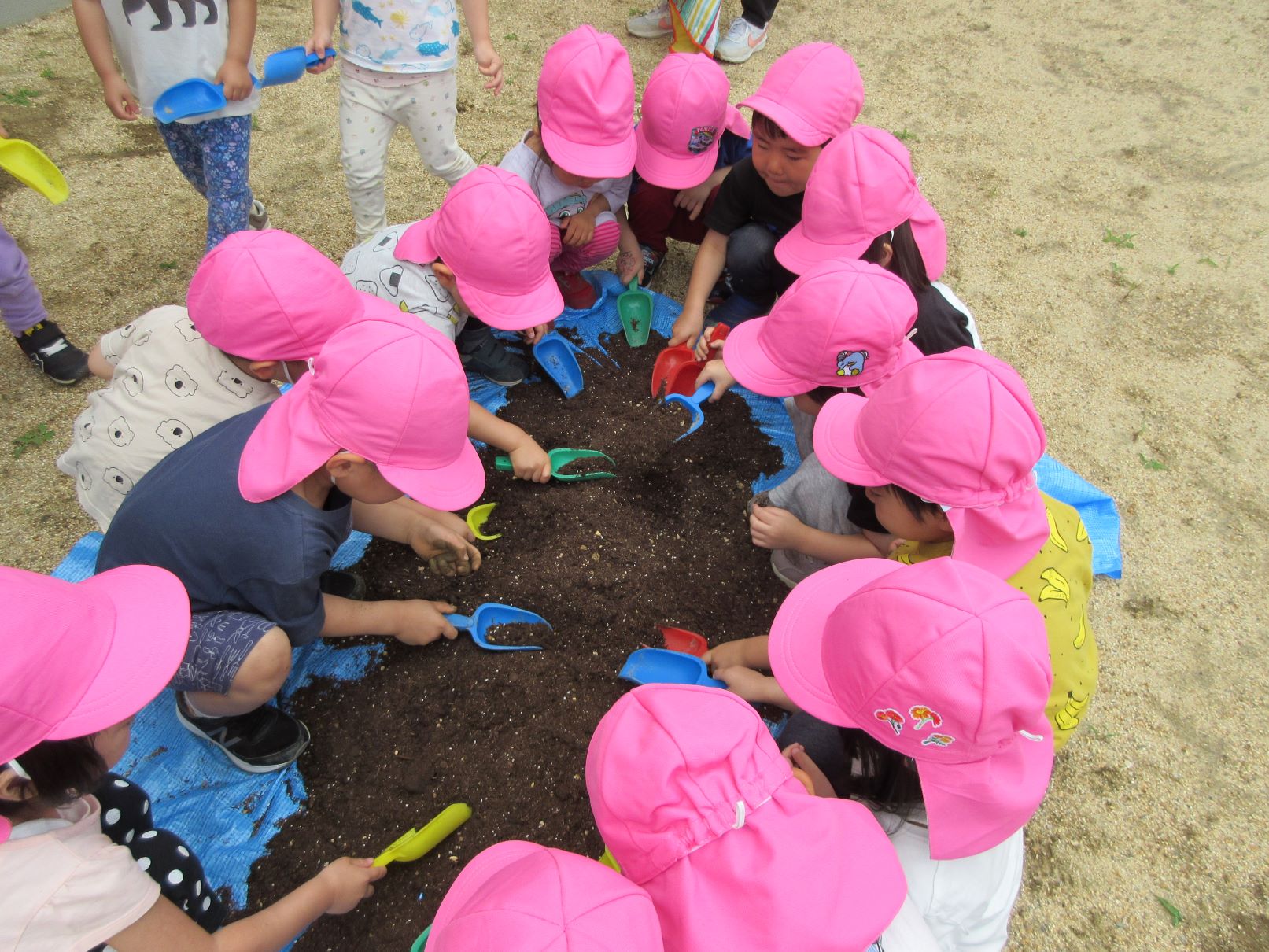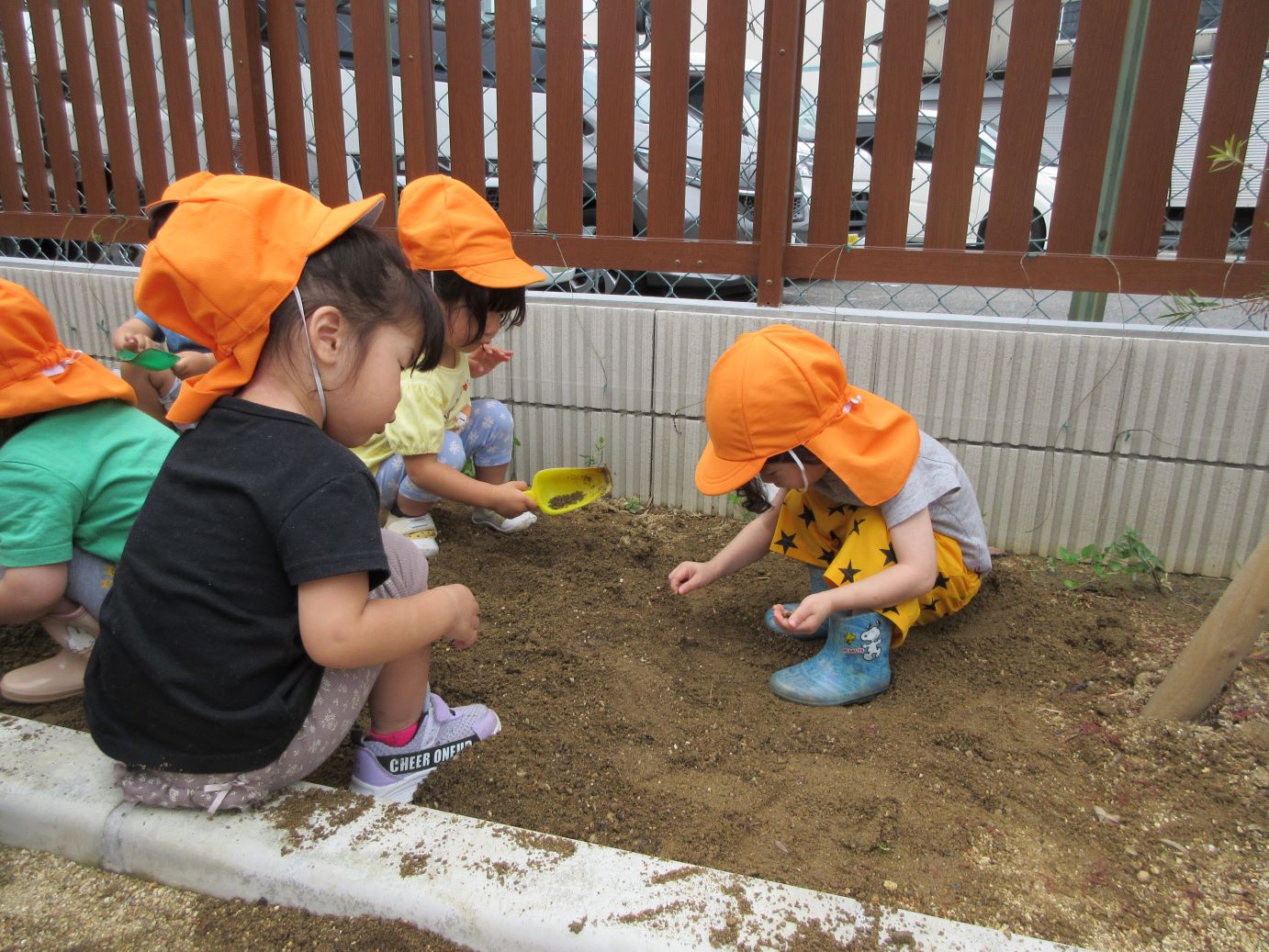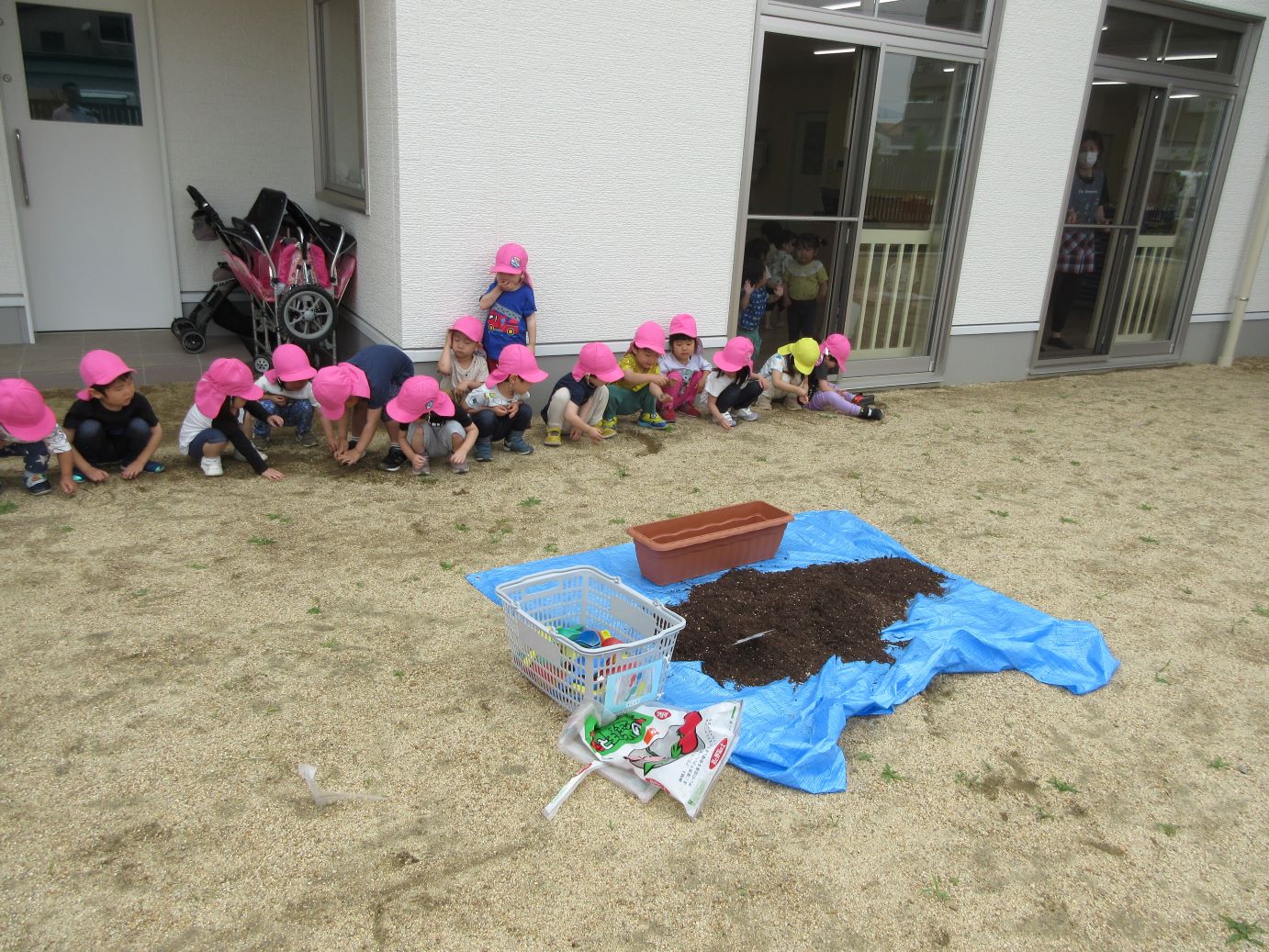 2023.06.08 お知らせ ブログ 花の種まきをしました。 3歳にじ組が、園庭で花の種まきをしました。プランターと花壇に種をまきます。 はじめに土をしっかりと耕しました。わくわくする気持ちが伝わってきます。 プランターに土を入れて、種をまきます。1歳だいち組が、様子を見せてもらっています。 0歳うみ組も、窓から様子を見せてもらいました。 2歳あめ組も園庭で、花壇の土を耕して、お手伝いしました。今日、まいた種は、ひまわり、千日紅、あさがおです。 一覧へ戻る