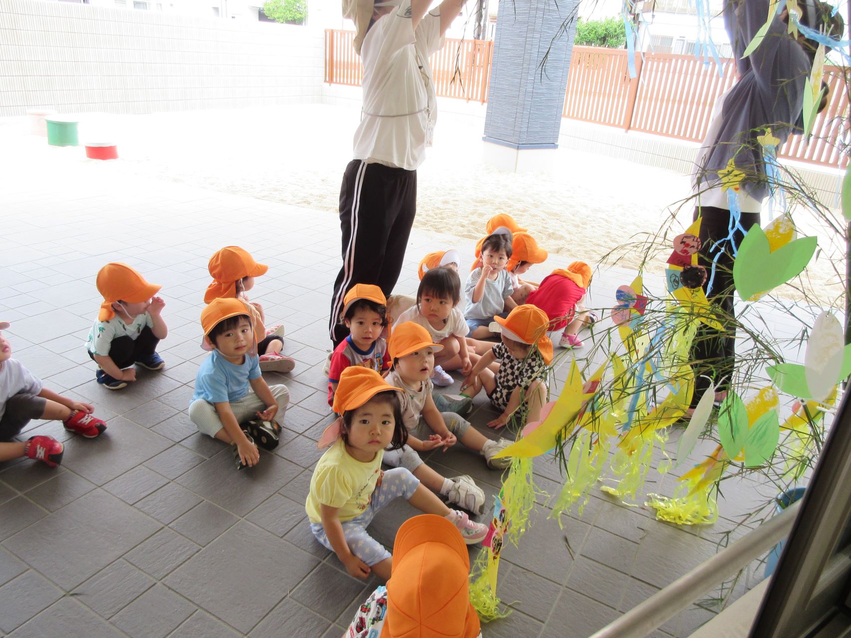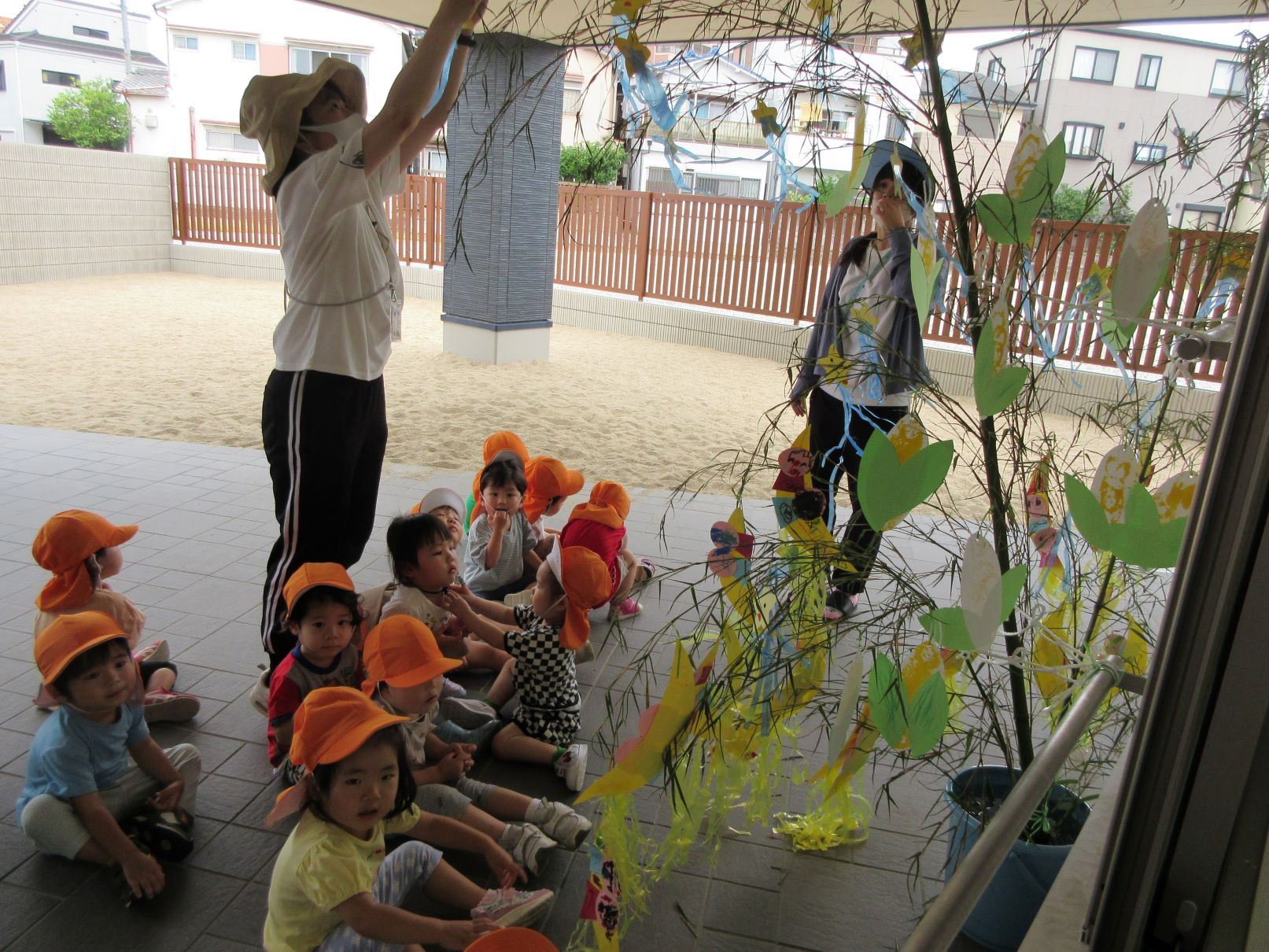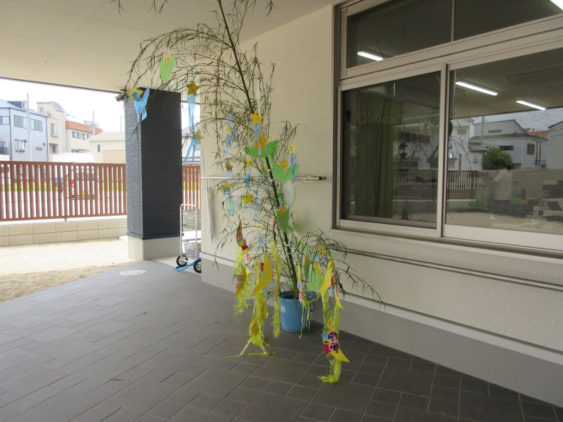 2023.07.03 お知らせ ブログ 七夕飾り 玄関前に笹を設置し、各クラスで作った七夕飾りを笹に結びました。 2歳あめ組も、飾りを付けに集まりました。 星やとうもろこしの飾りを作りました。 0歳うみ組も、玄関の中から、七夕飾りを見ました。 一覧へ戻る