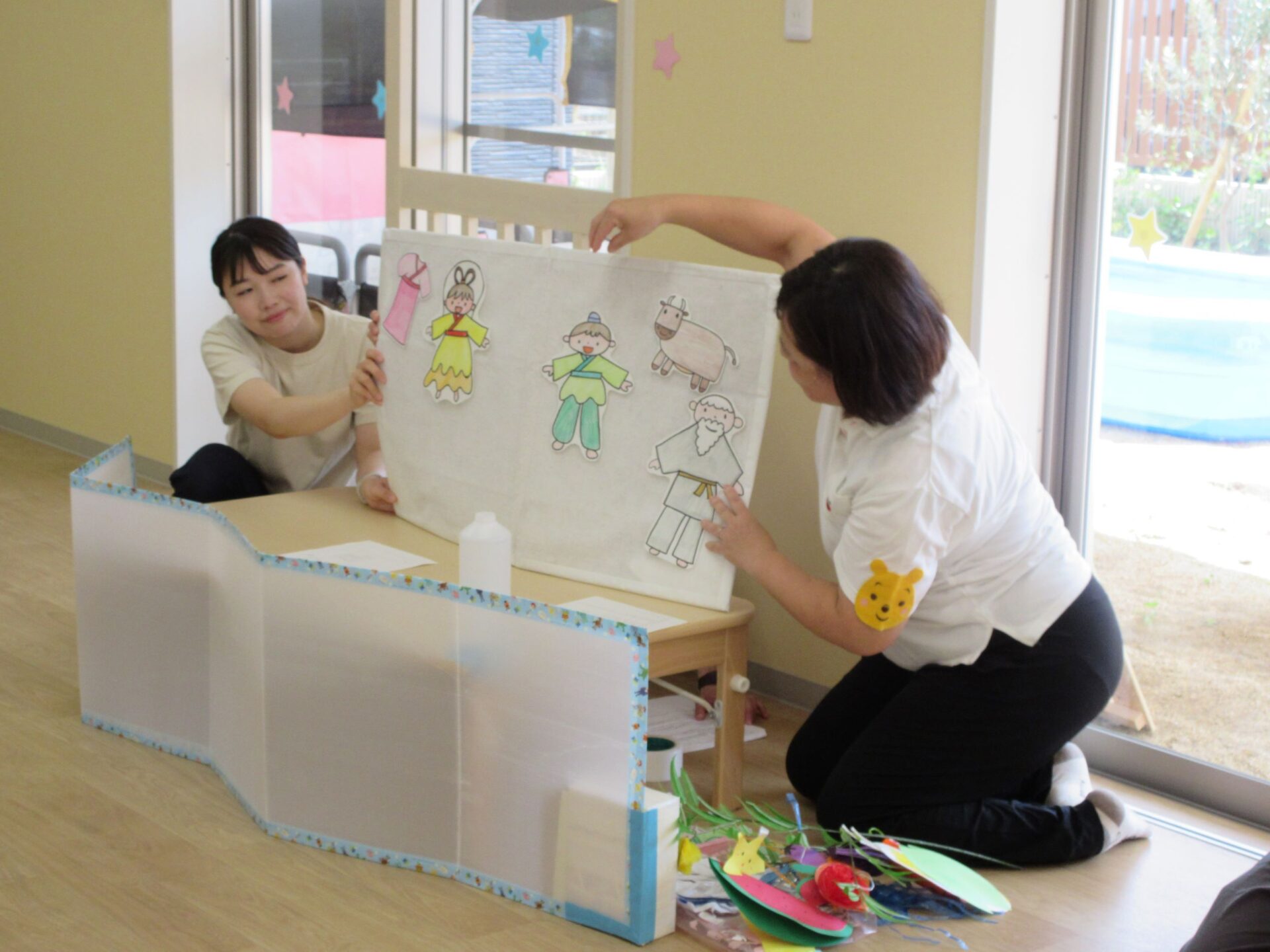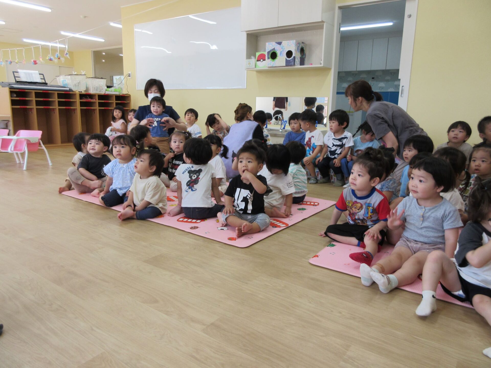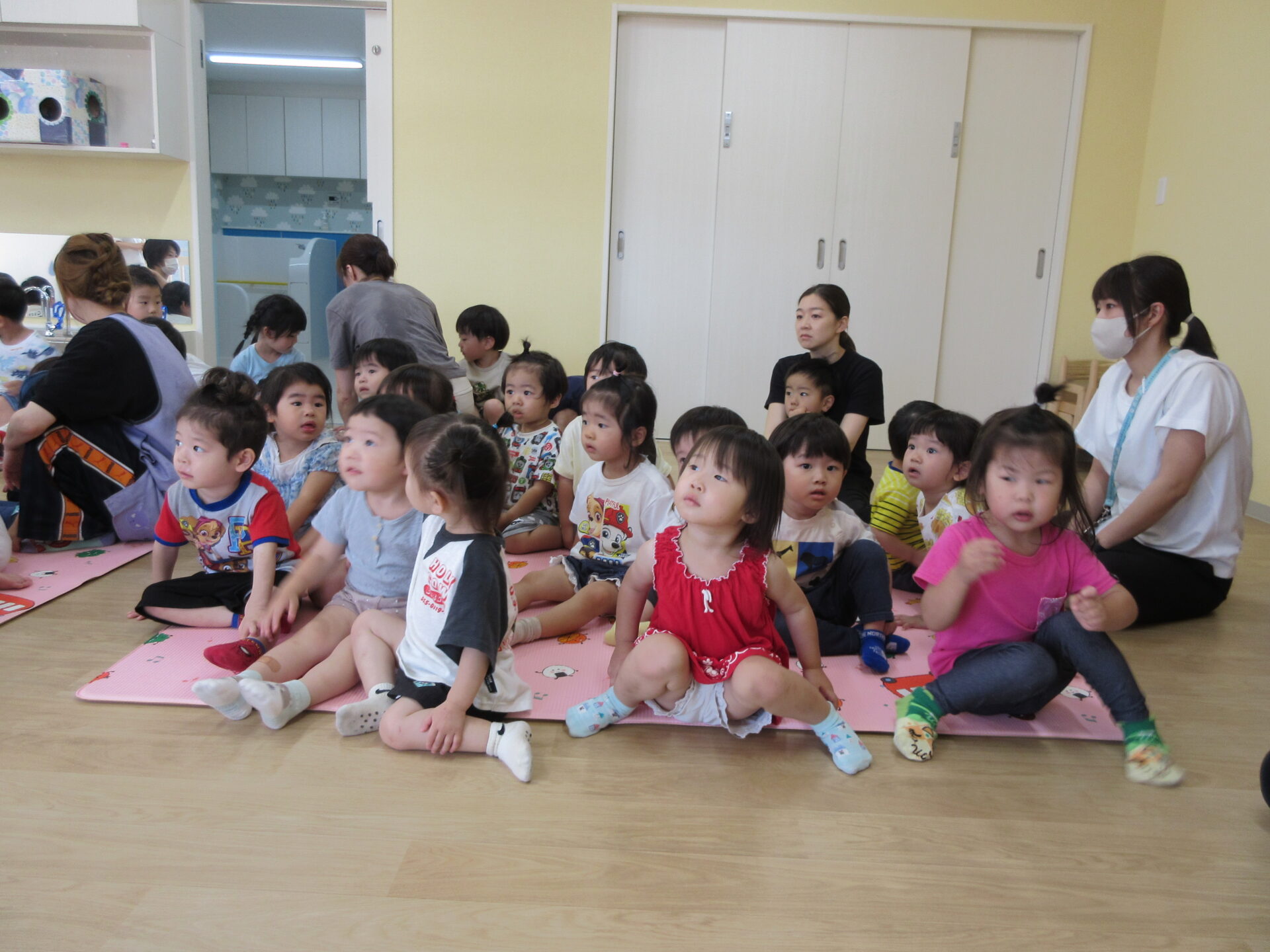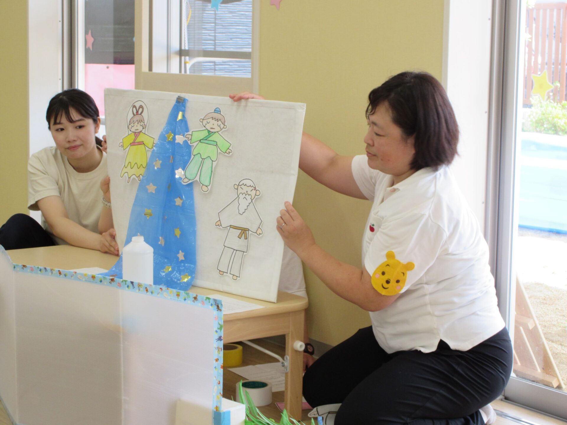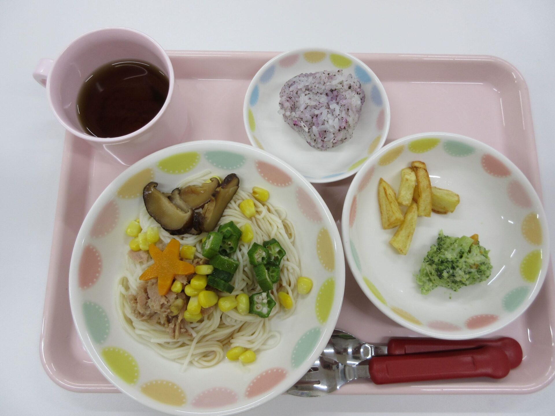 2023.07.07 お知らせ ブログ 今日は、七夕のつどい 10時から全園児が集まって、たなばたのつどいをしました。 はじめに、担当の先生からお話を聞きました。 そのあと、ペープサートで、おり姫とひこ星のお話を聞きました。 お話に夢中です。 「天の川で、離ればなれになってしまい、おり姫とひこ星は会えなくなりました。」 お話の後、玄関のたなばた飾りの前で記念写真を撮りました。2歳あめ組。 1歳だいち組です。 0歳うみ組です。 今日は、「たなばた献立」。七夕そうめん、ゆかりご飯のおにぎり、ブロッコリーサラダ、フライドポテトでした。 一覧へ戻る