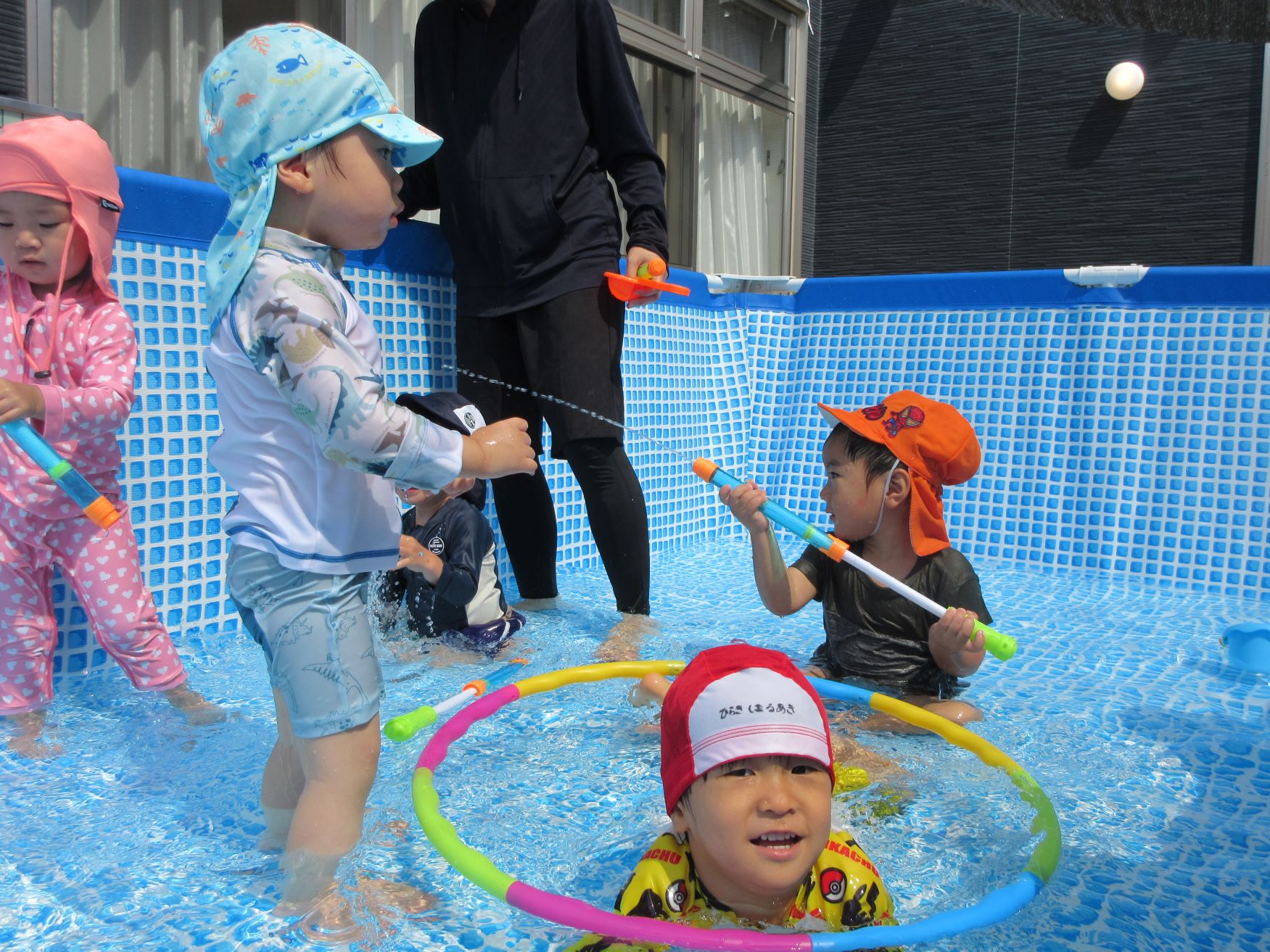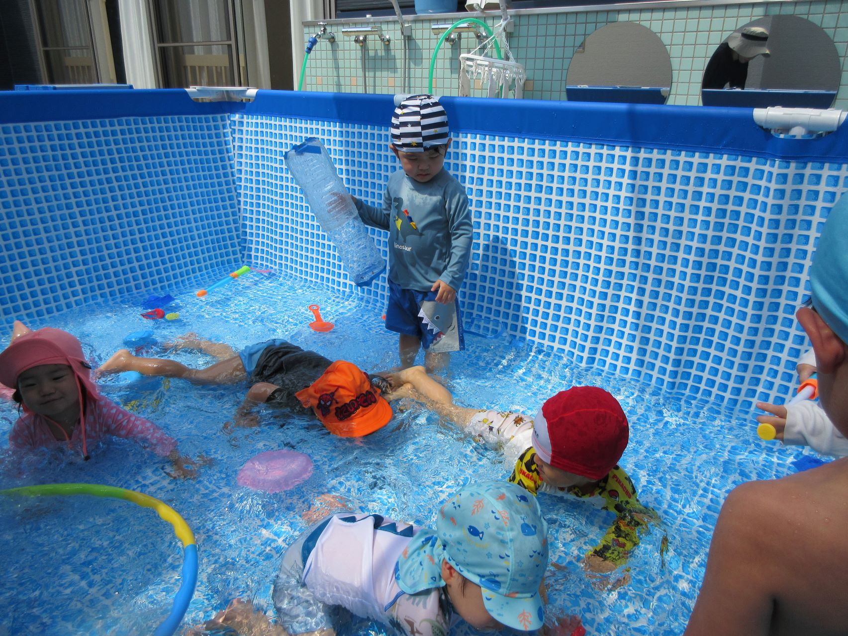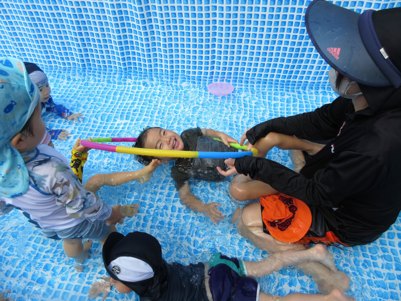 2023.07.26 お知らせ ブログ 今日のあめ組 昨日、撮影できなかった2歳あめ組は、10時から2階中庭でプール遊びをしました。 とても暑い日だったので、気持ちよさそうでした。 何度もプールで遊んでいるので、いろいろな遊びを楽しめています。 水にもすっかり慣れて、「ワニさん歩き」ができるようになってきました。 顔を水の中にしっかりつけれるお友だちもいます。 そして、だんだんワニさんが増えてきました。 上を向いて寝ころんで楽しんでいます。 一覧へ戻る