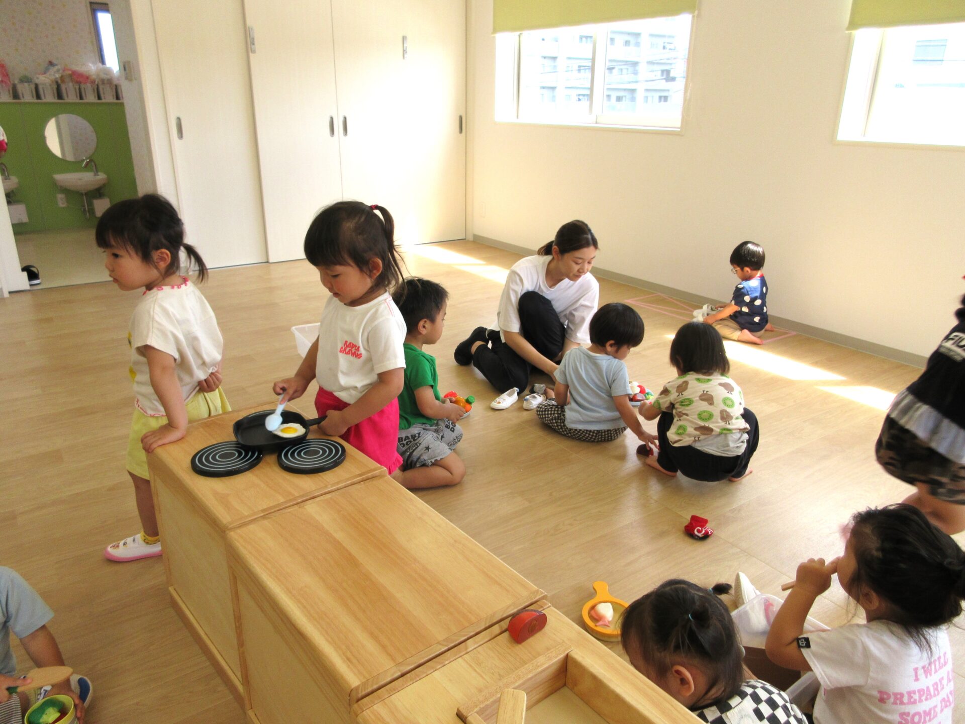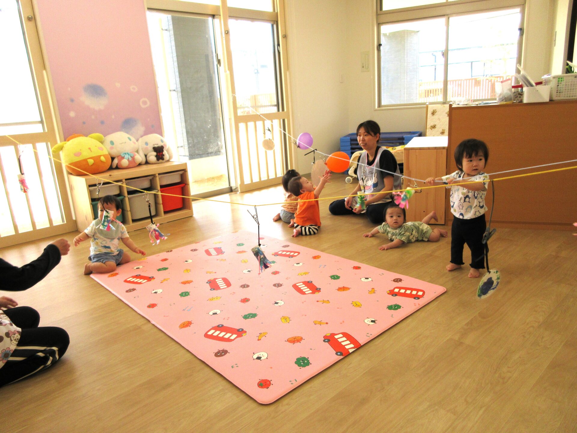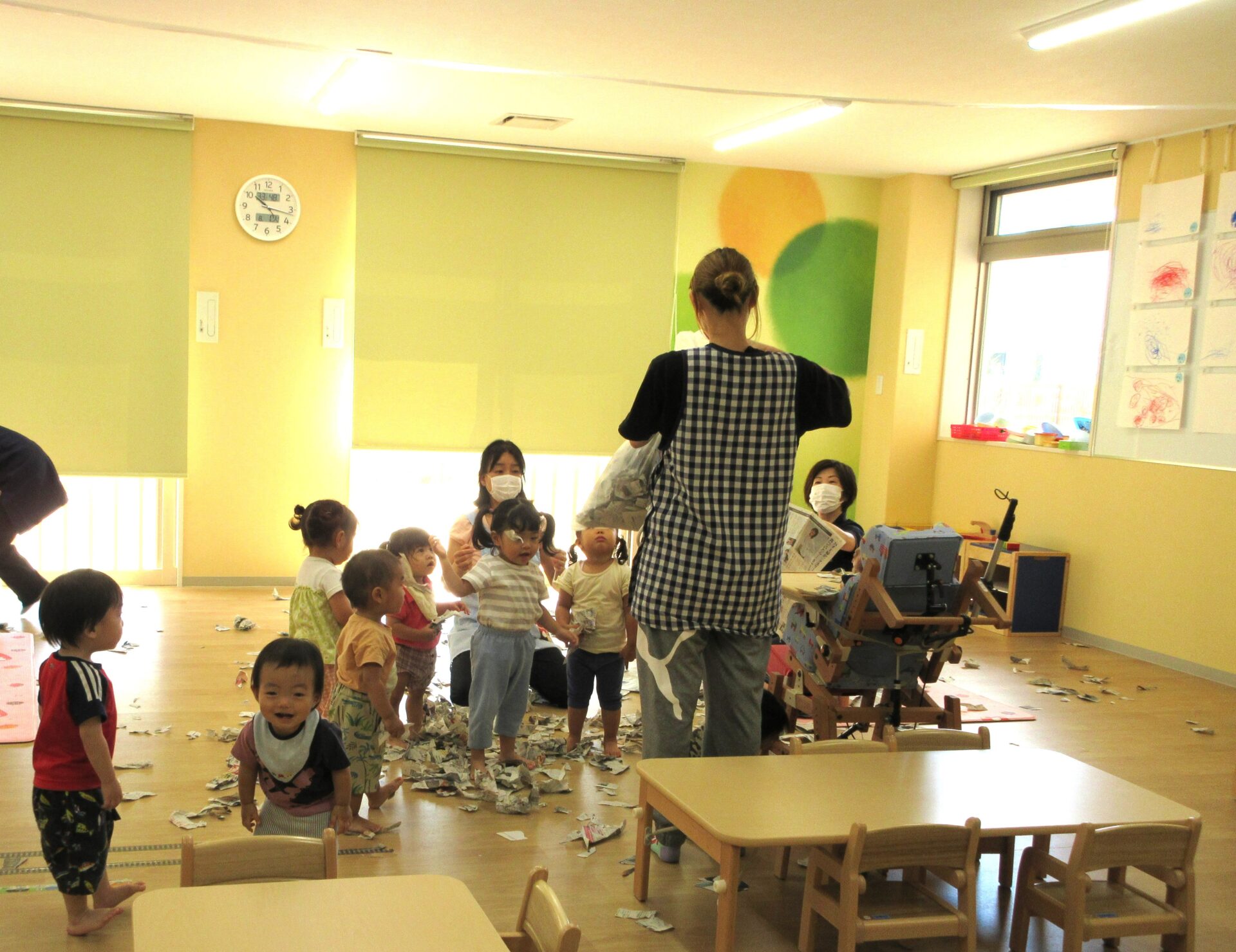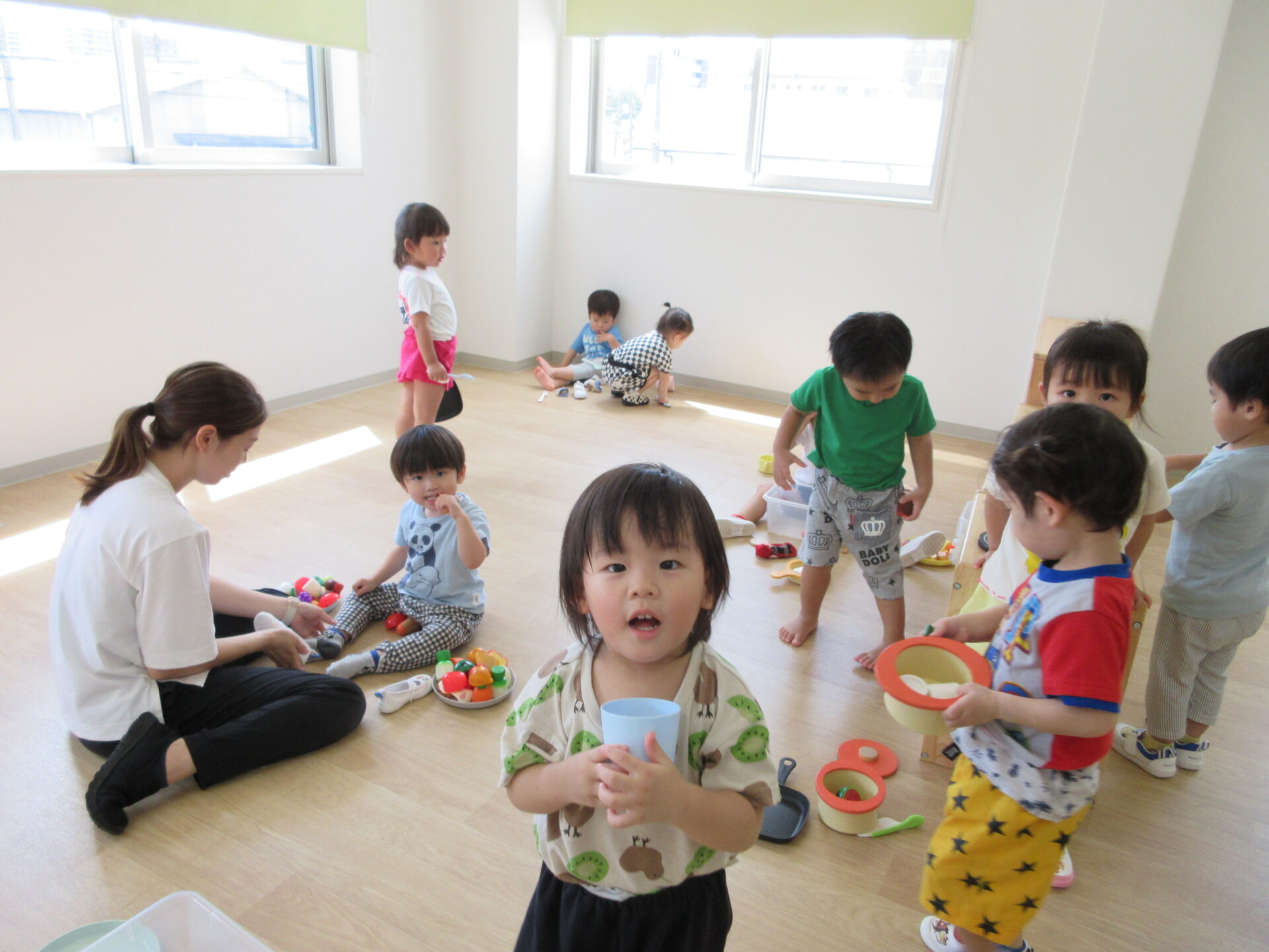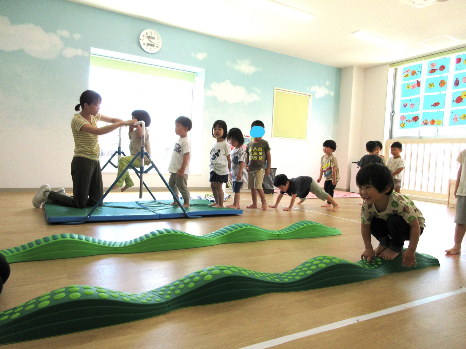 2023.08.03 お知らせ ブログ 8月1日の様子 0歳うみ組は、ひっぱり遊びをしました。いろいろなものを吊り下げて、ひっぱって遊びます。 1歳だいち組は、新聞遊びをしました。小さくちぎった新聞紙がいっぱいです。 2歳あめ組は、いろいろな遊びをしていました。お料理もしていますね。「目玉焼き」 こちらも、あめ組です。 3歳にじ組は、運動遊びをしました。鉄棒にぶら下がったり、バランスをとりながら細い道を歩きました。 一覧へ戻る