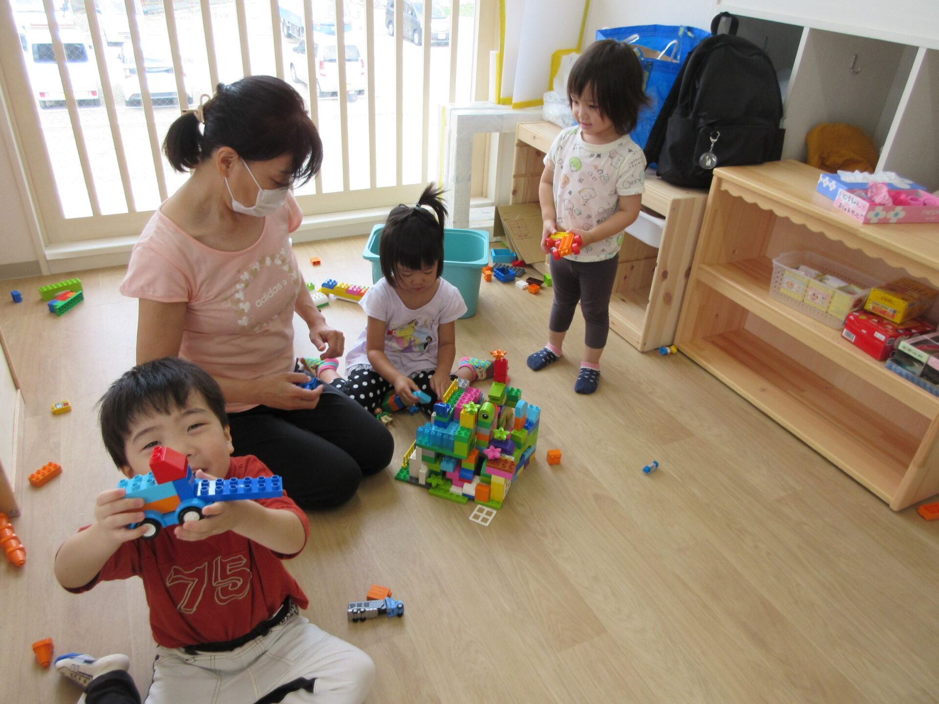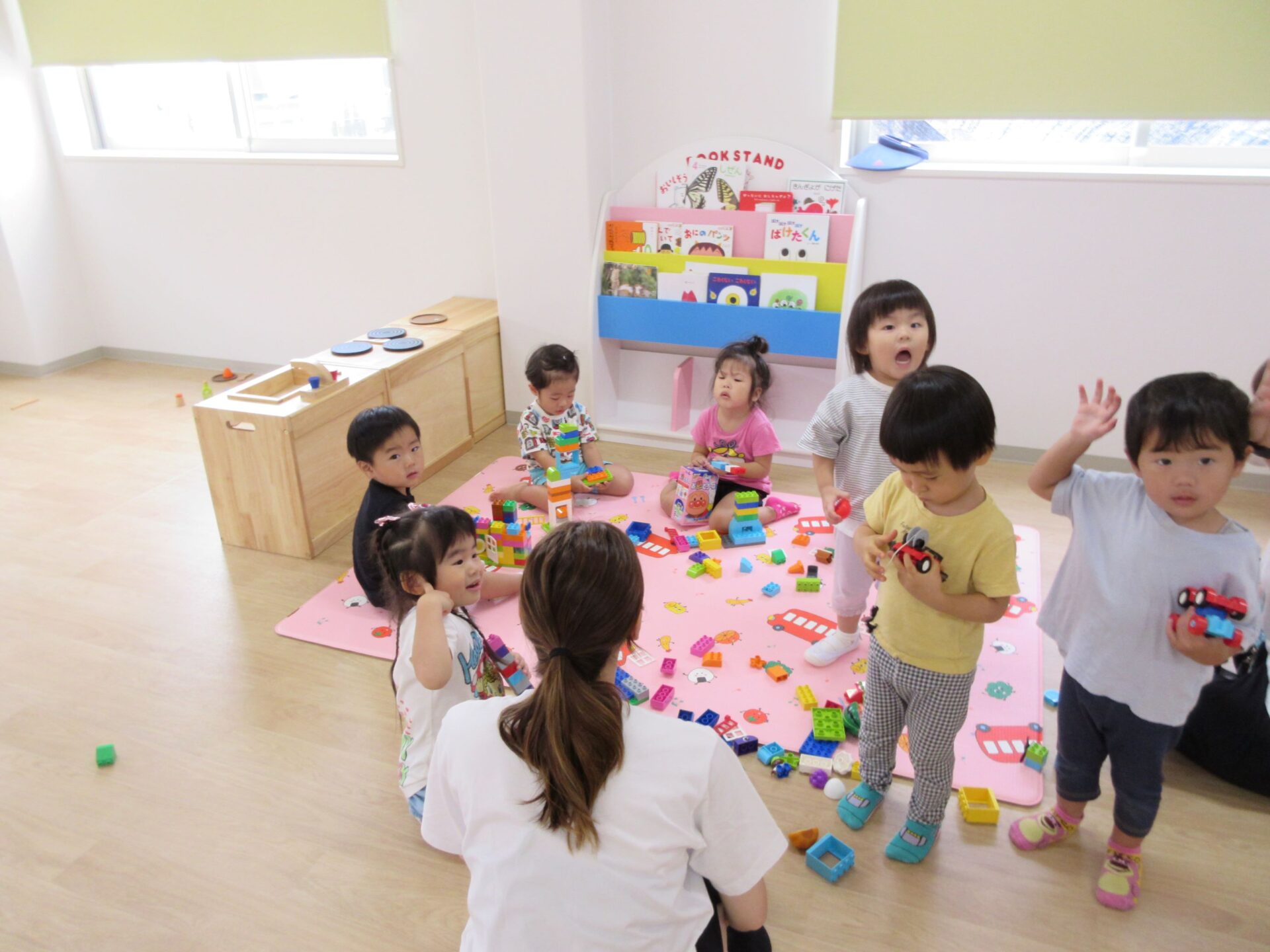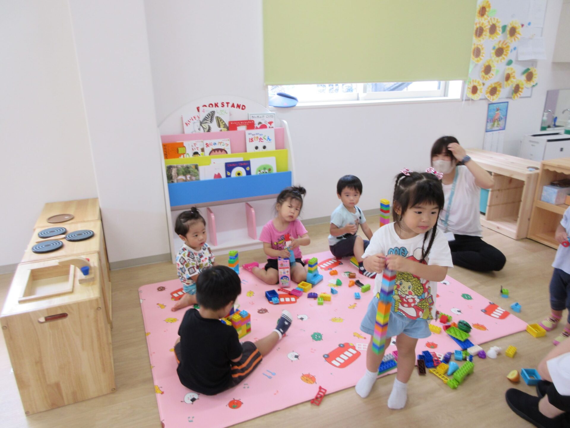 台風が過ぎた16日、午前10時頃の各クラスの様子です。こちらは、2歳あめ組。ブロックで遊んでいます。