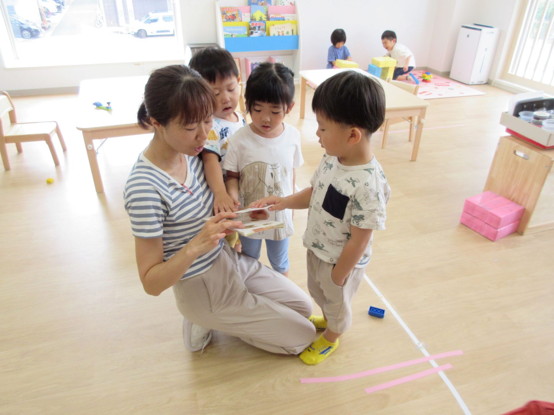 隣の3歳にじ組では、先生と図鑑を見ていました。