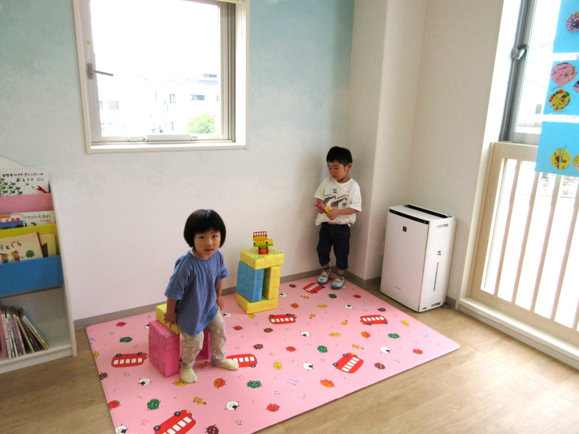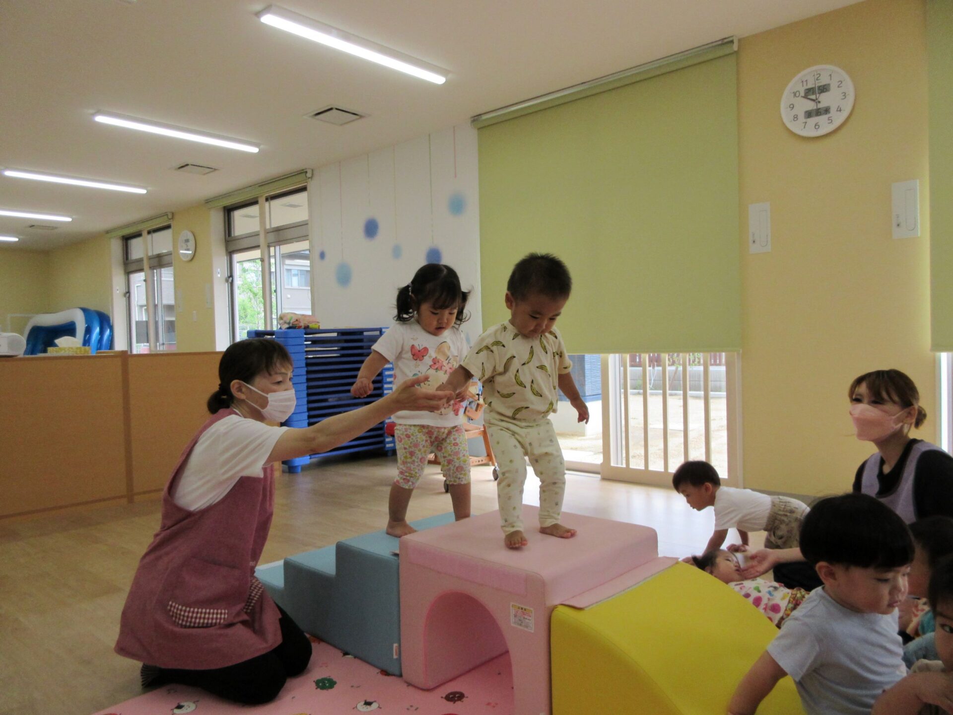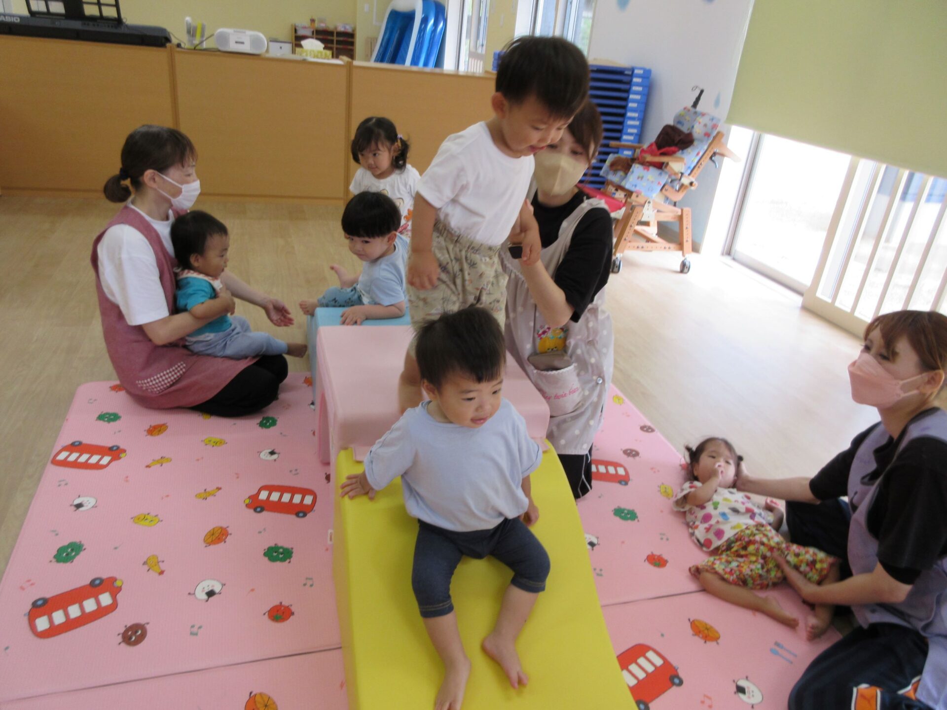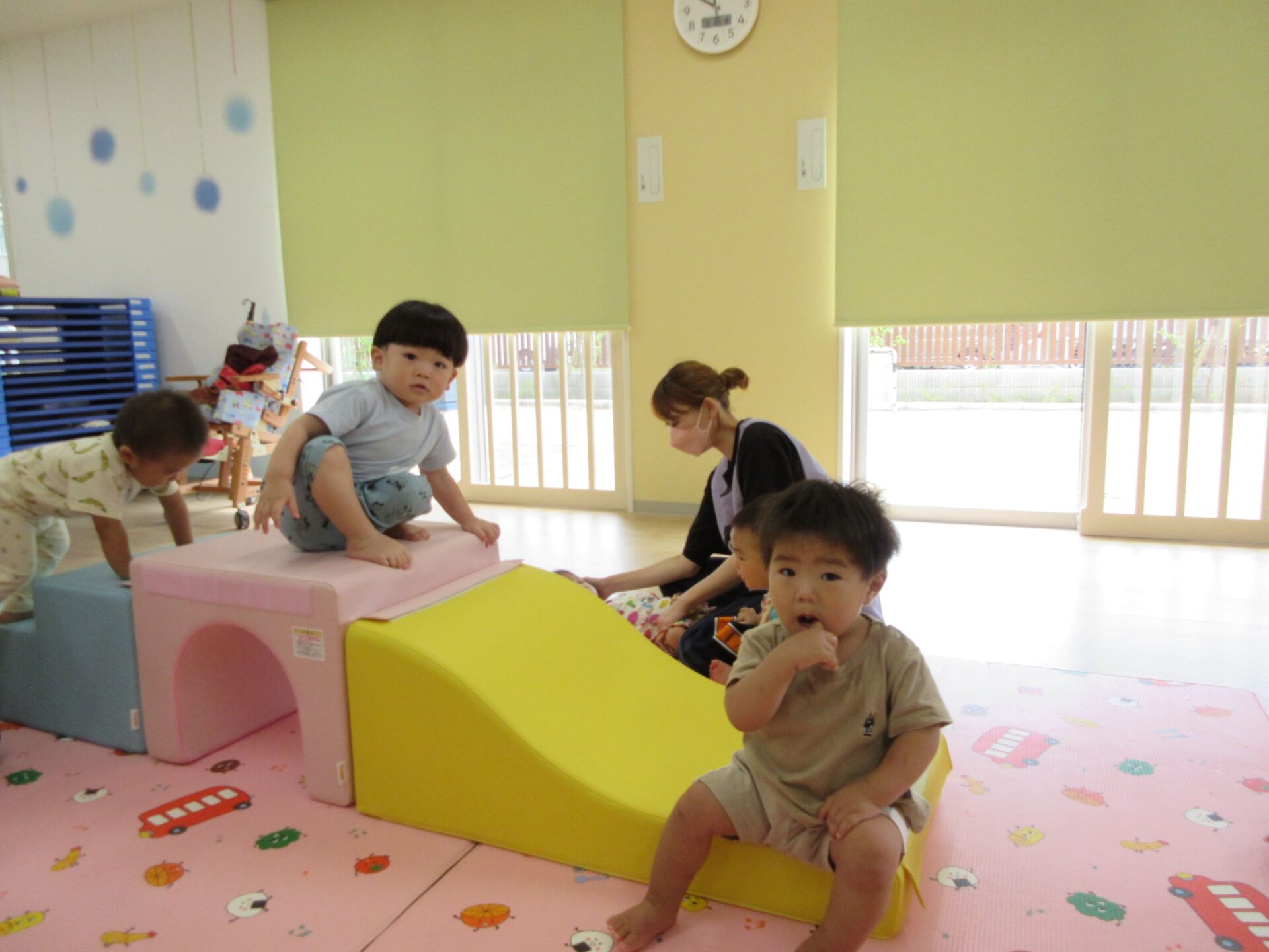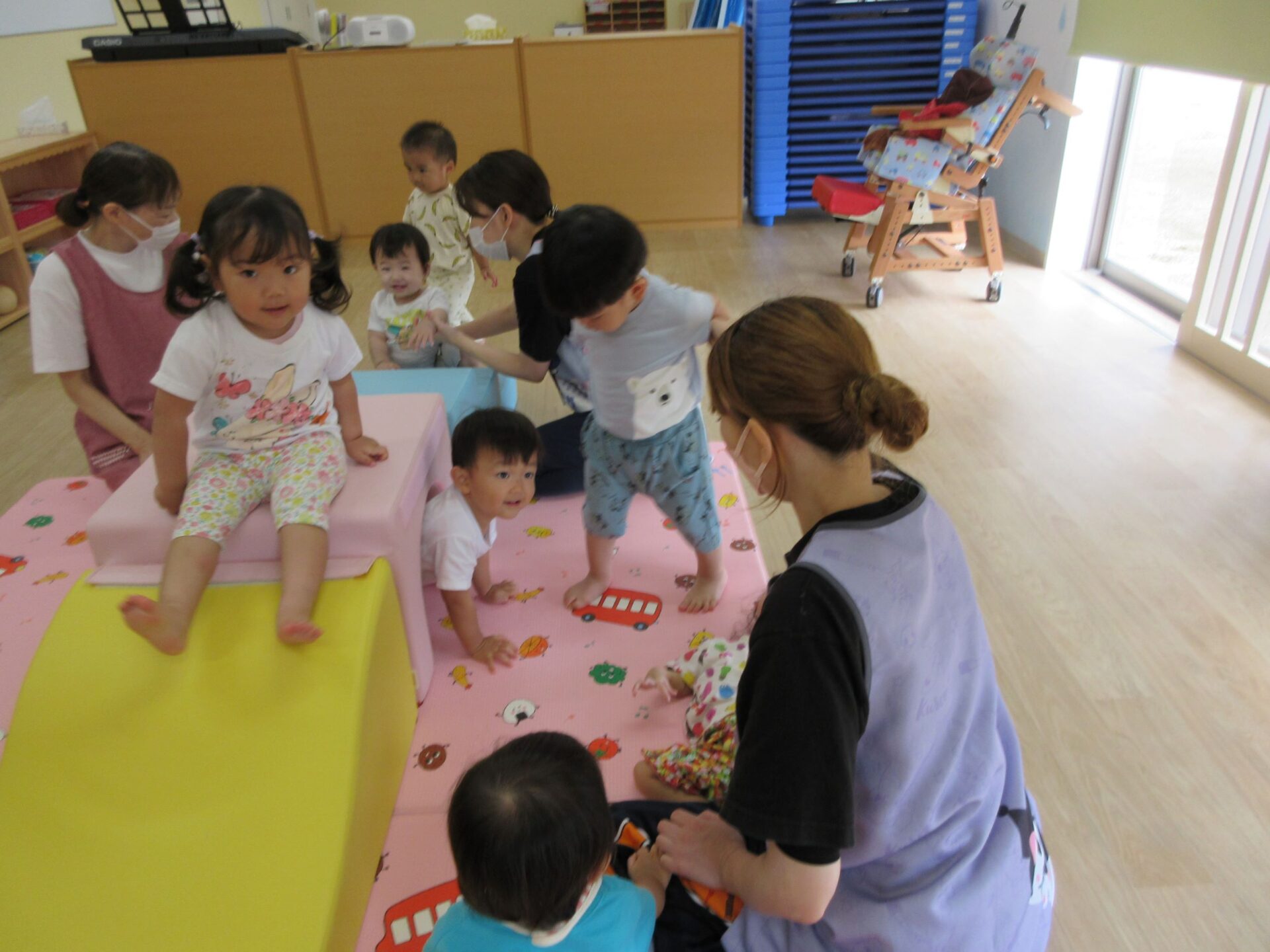 1階に降りると、1歳だいち組の部屋では、0歳1歳が合同で遊んでいました。
