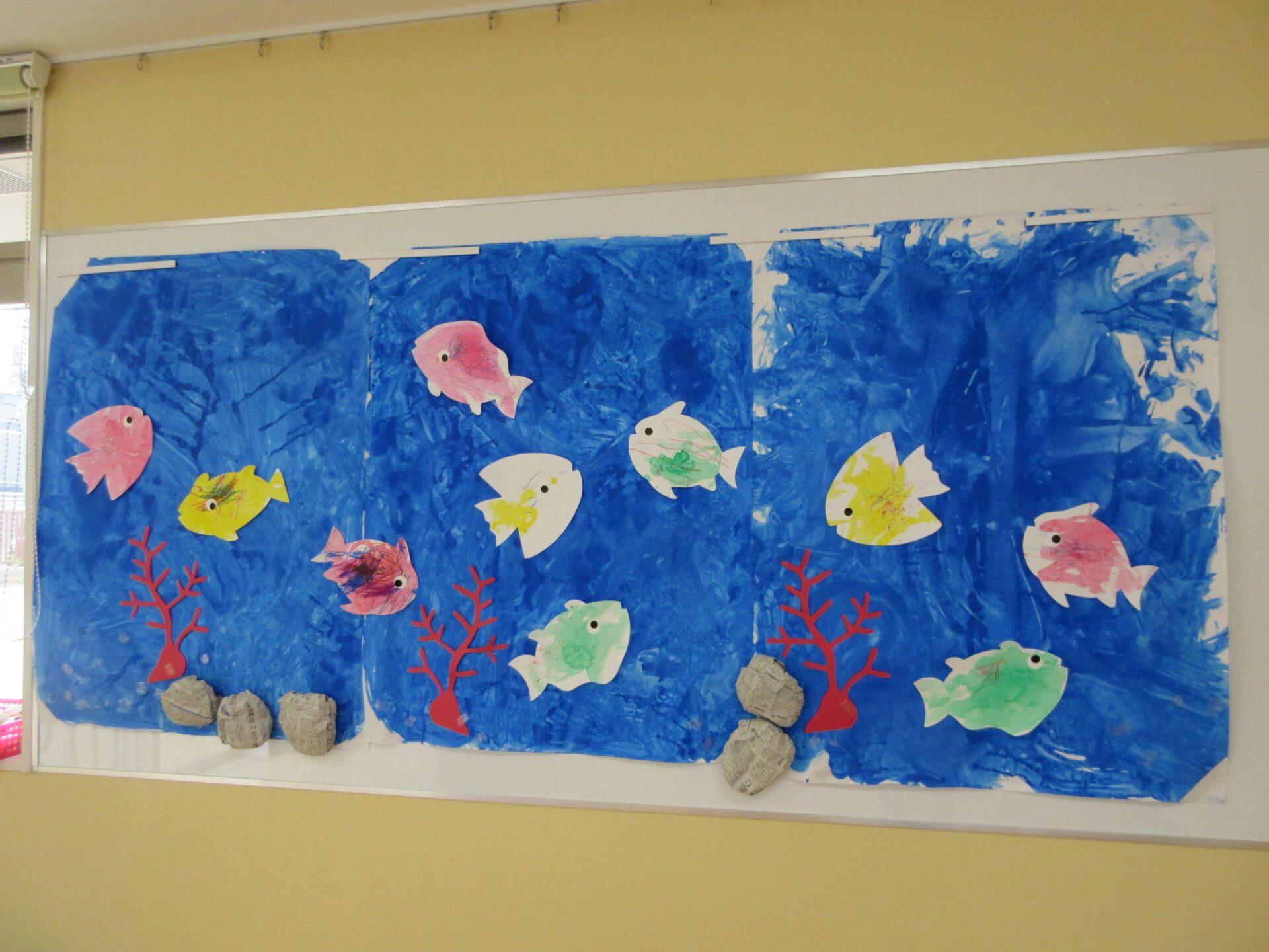 壁には、きれいな海の中の様子がありました。これは、ぬたくり遊びで塗った青色ですね。素晴らしい作品になりました。