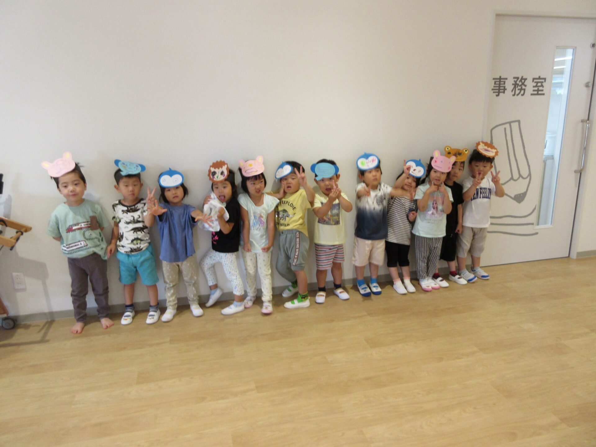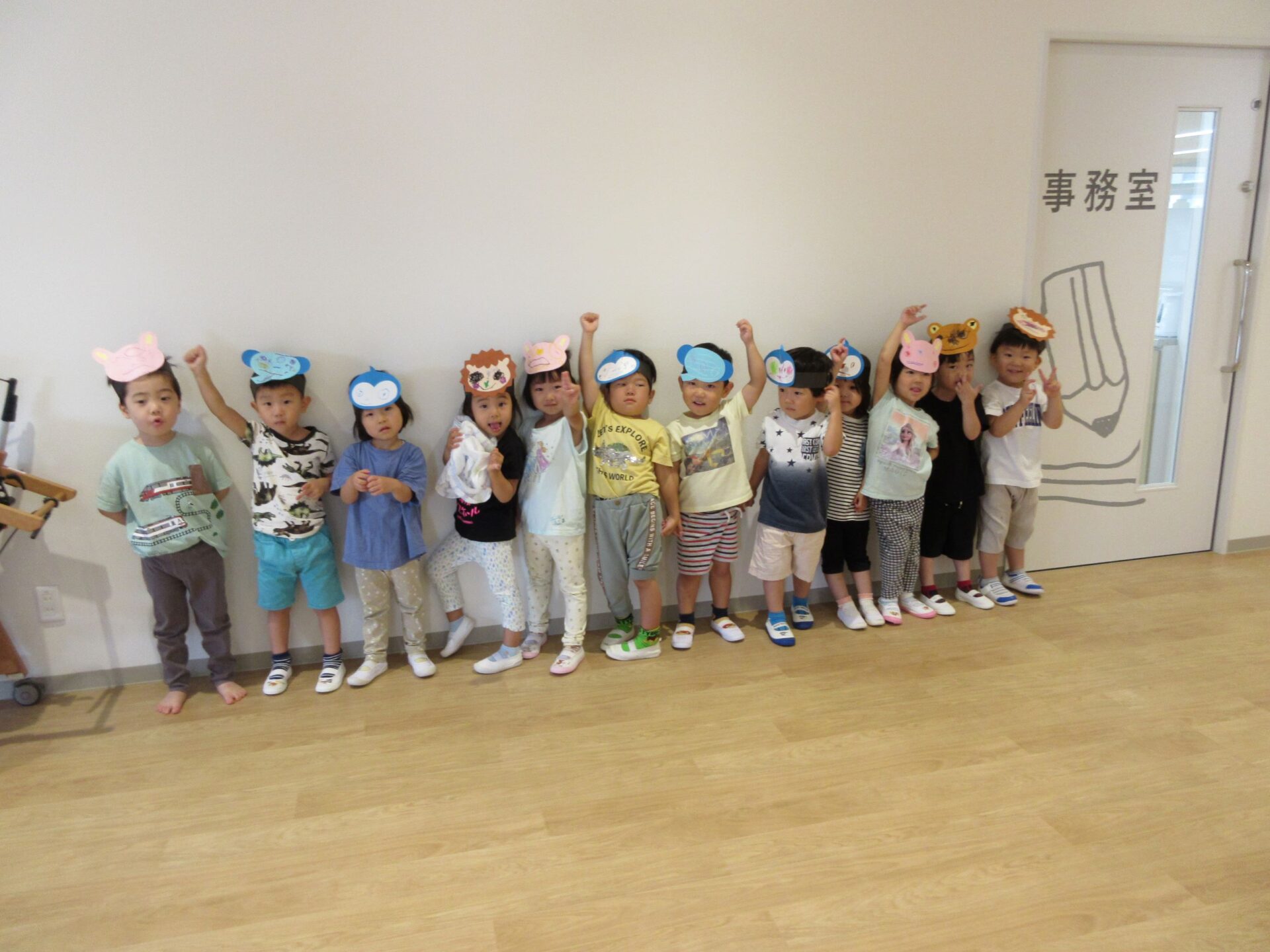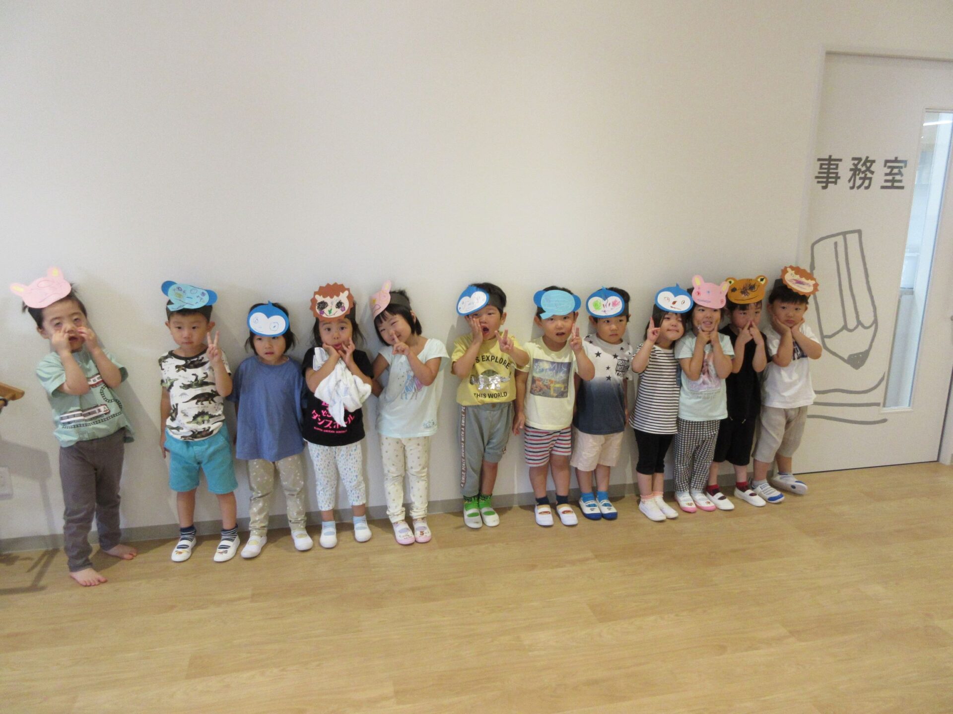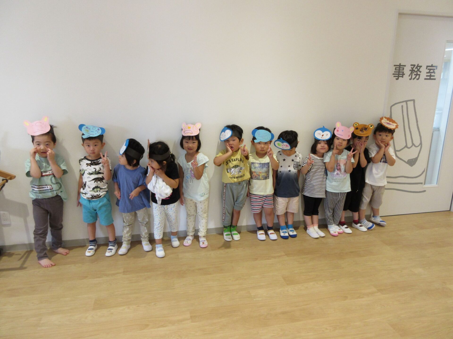 こちらは3歳にじ組です。お面を作ったので、記念写真。なかなかそろうのが難しい。