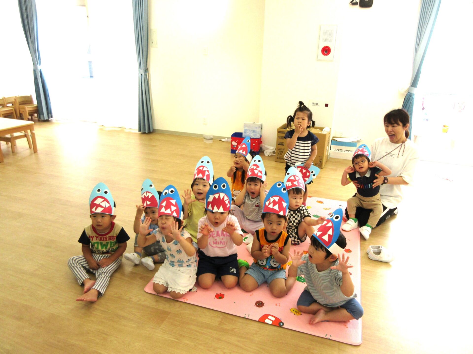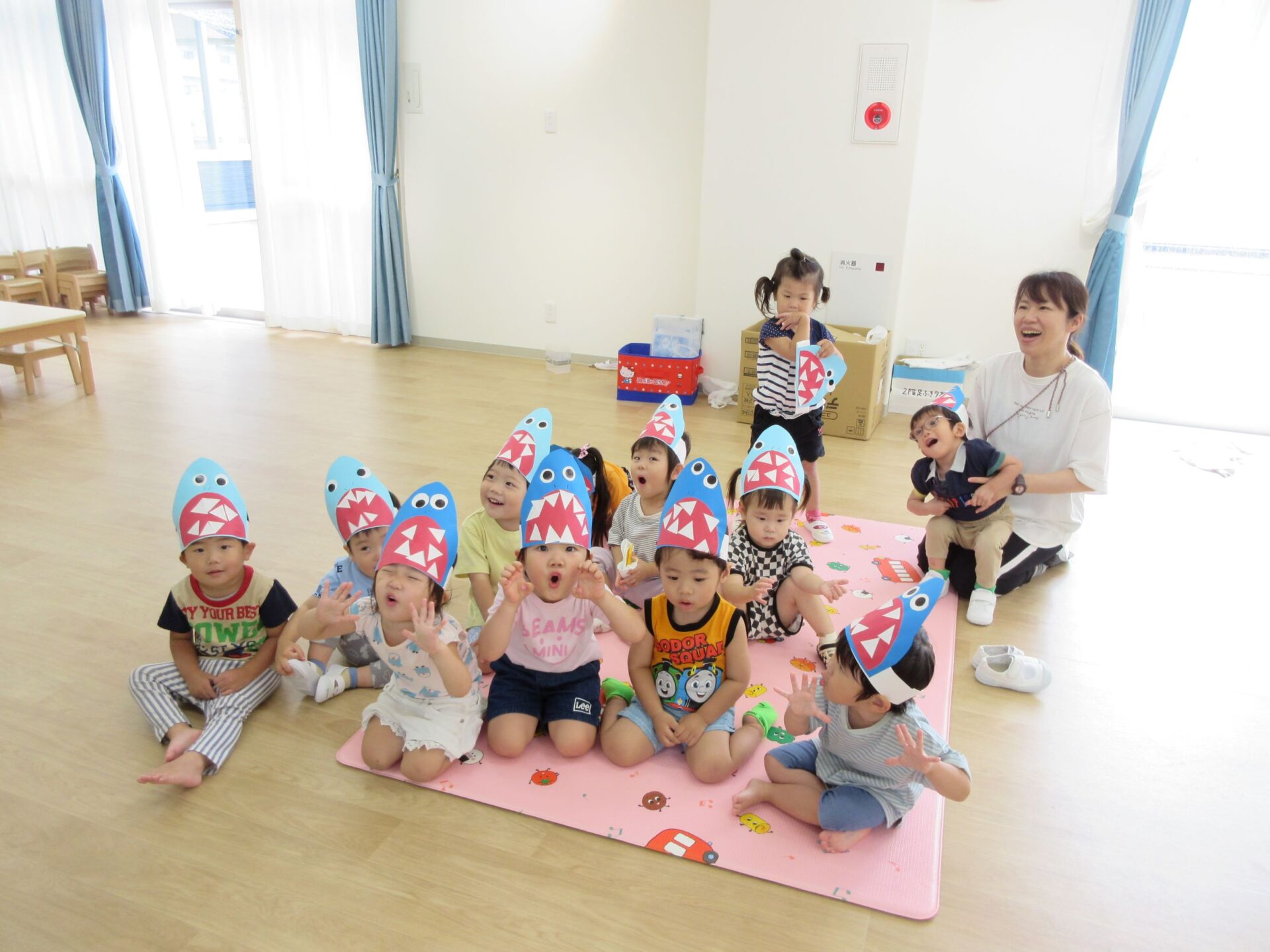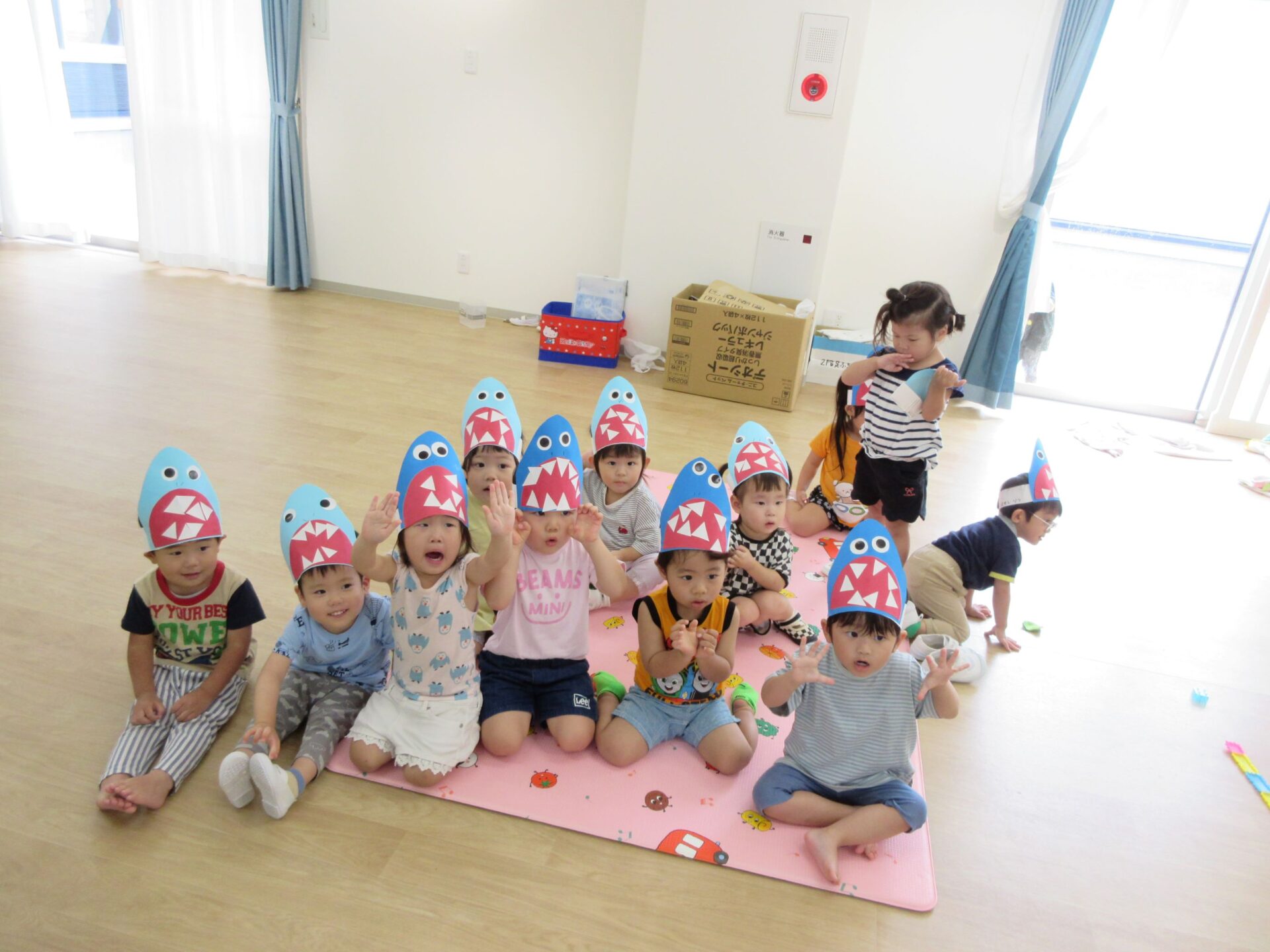 18日2歳あめ組は、サメのお面を作りました。上手にできましたね。お面の表情に個性があります。なんとなく作った人の顔に似ているような。