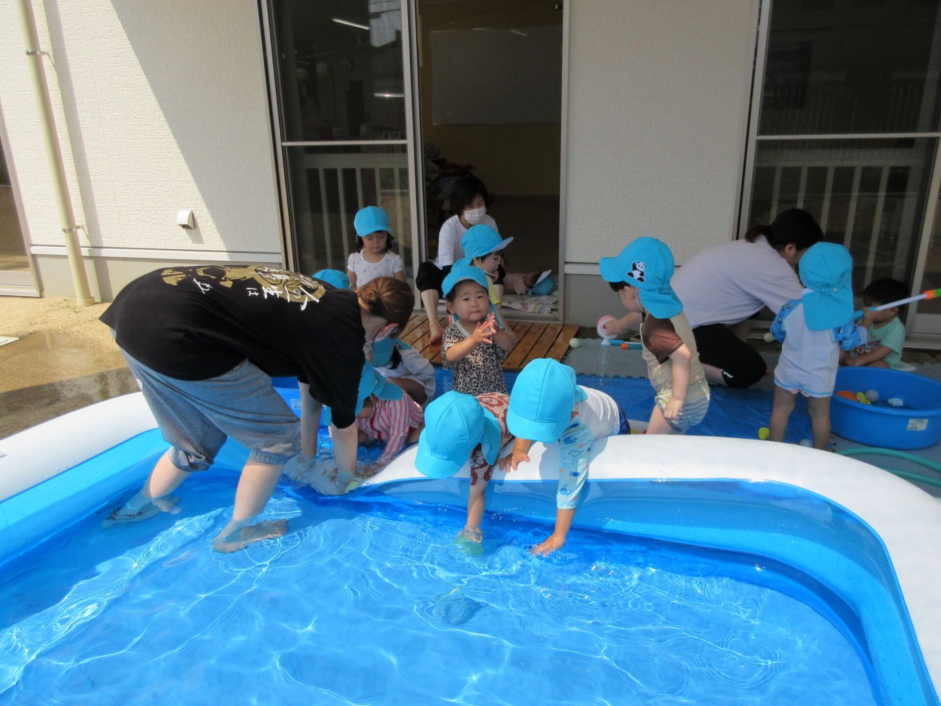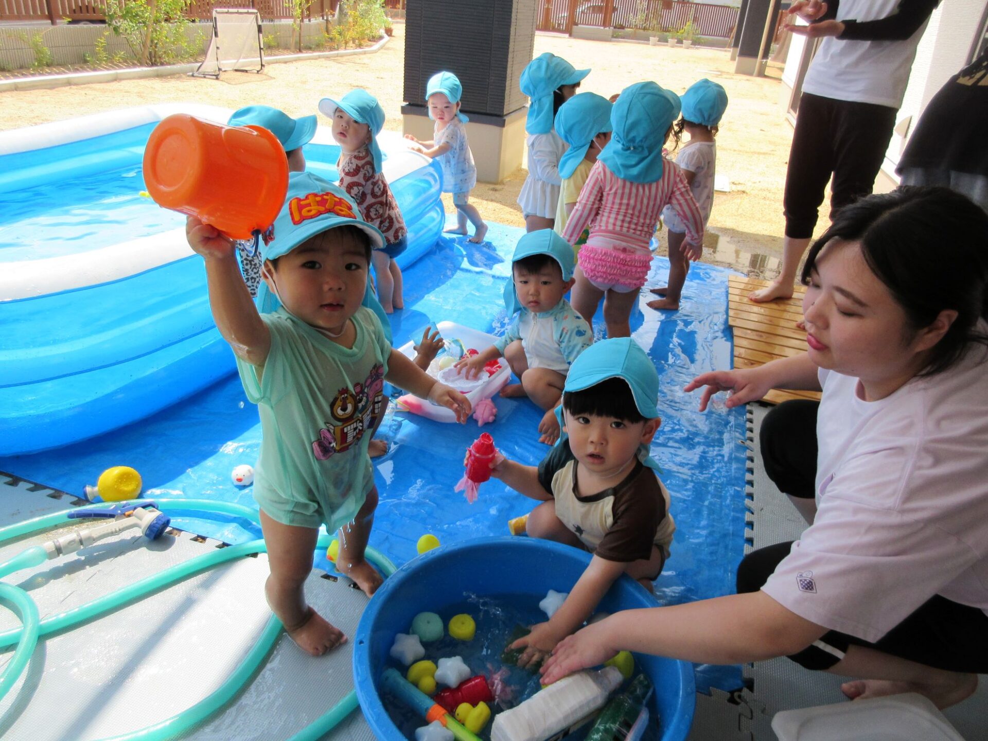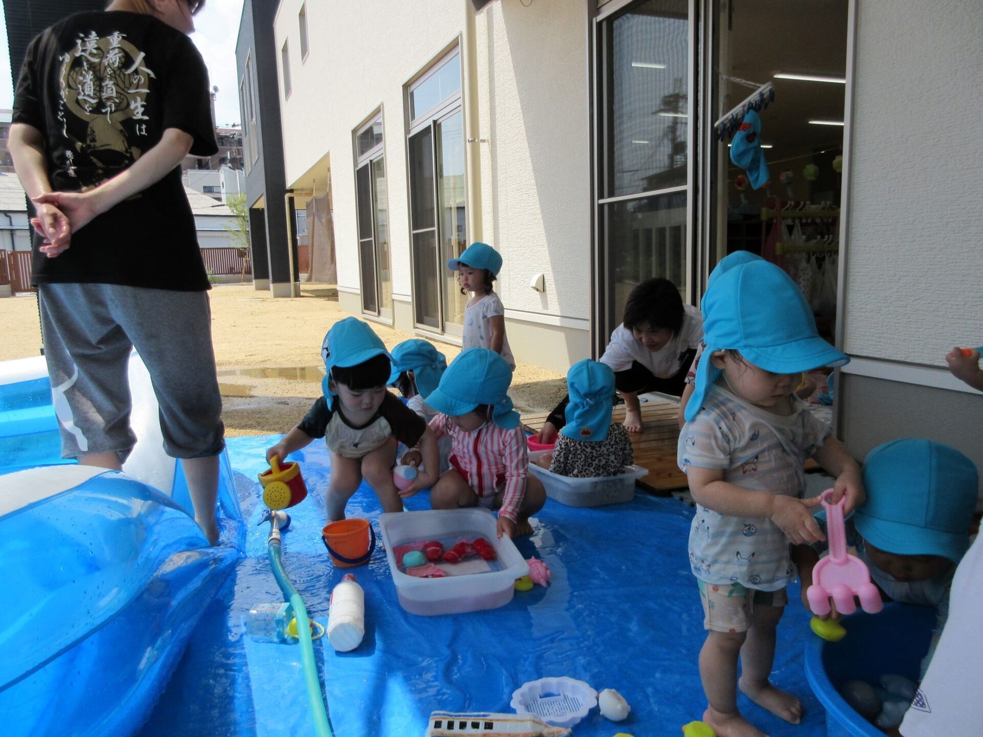 2023.08.21 お知らせ ブログ 大阪は38℃予想 昨日に引き続き、最高気温が38℃の予報が出ています。1歳だいち組が水遊びをしています。 みんな遊びに夢中です。 今日から新しく着任しただいち組の藤木花音(ふじきかのん)先生もいます。 ビニールプールから水を流してもらっています。たくさんの水が流れてきました。 一緒に水を流し始めました。 そろそろ水遊びもおしまい。外は暑かったので、水遊びは気持ちよかったです。 吉村先生のTシャツに、とても良い言葉が書いていました。 こちらは0歳うみ組です。これから感触遊びをするところでした。 みんなのいろんな表情が見られます。 全員がカメラのほうを見るのは難しいですね。 一覧へ戻る