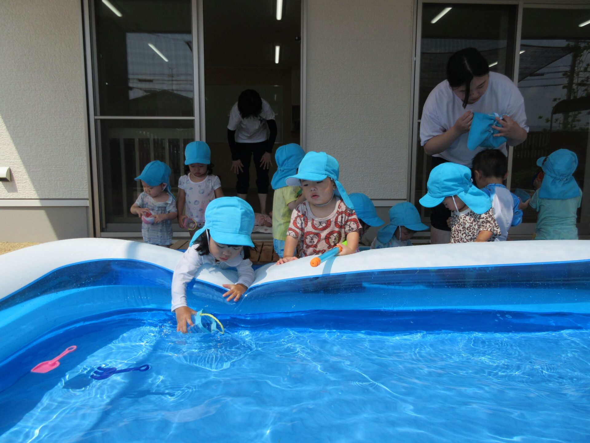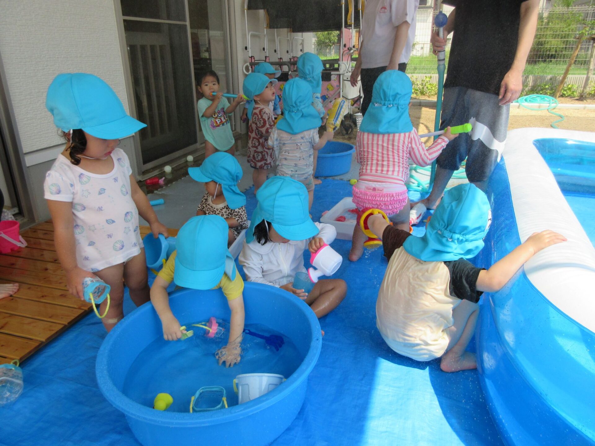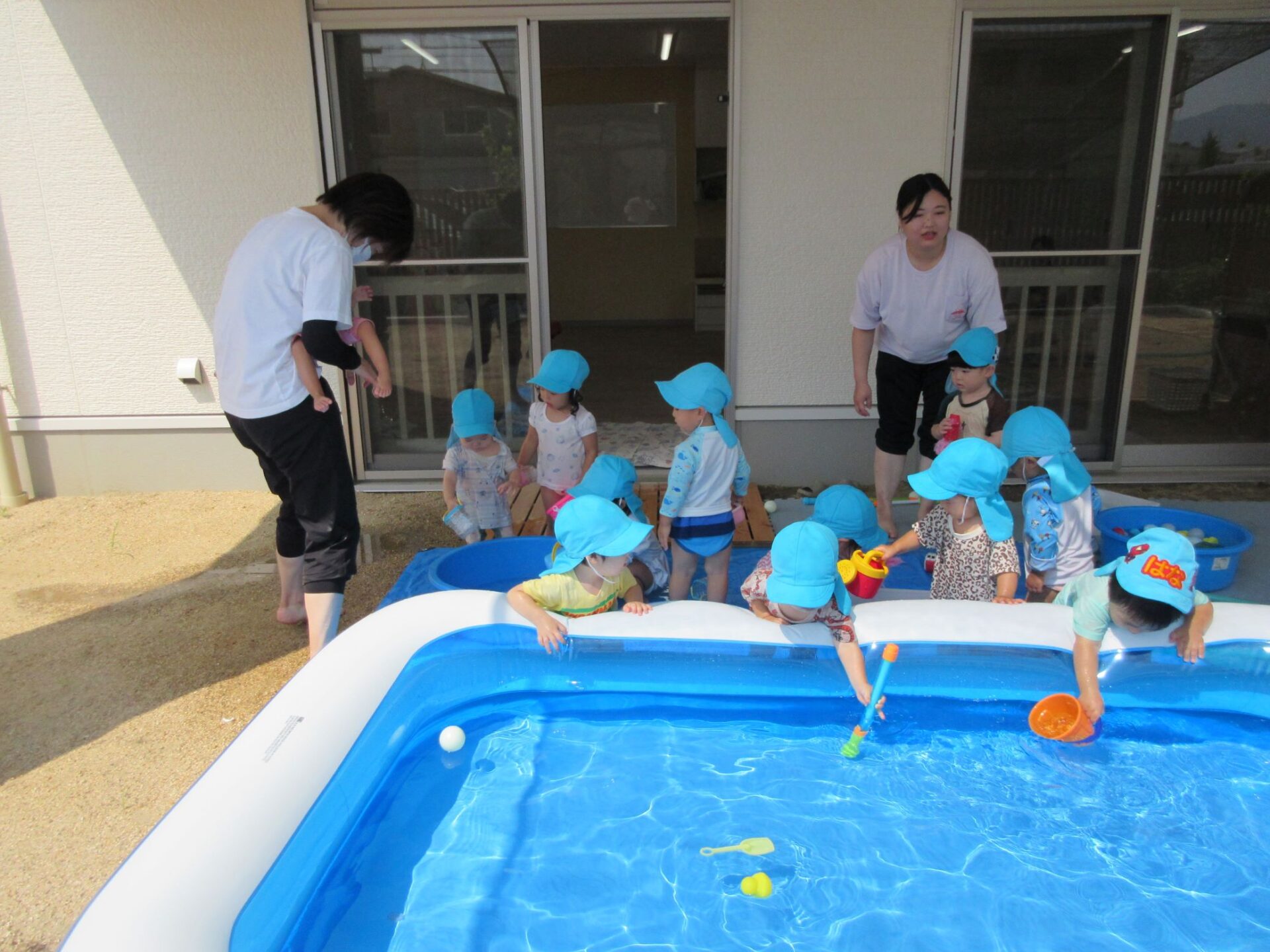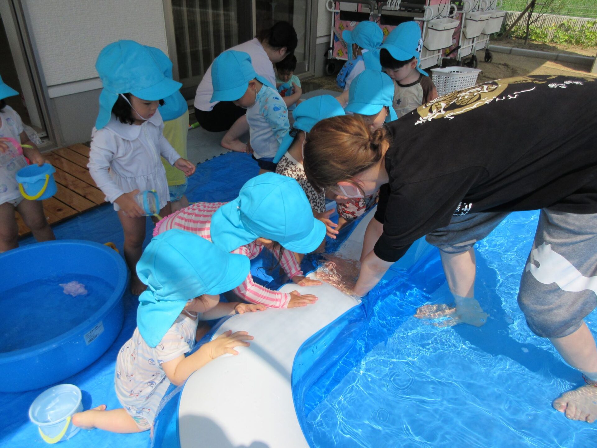 2023.08.21 お知らせ ブログ 大阪は38℃予想 昨日に引き続き、最高気温が38℃の予報が出ています。1歳だいち組が水遊びをしています。 みんな遊びに夢中です。 今日から新しく着任しただいち組の藤木花音(ふじきかのん)先生もいます。 ビニールプールから水を流してもらっています。たくさんの水が流れてきました。 一緒に水を流し始めました。 そろそろ水遊びもおしまい。外は暑かったので、水遊びは気持ちよかったです。 吉村先生のTシャツに、とても良い言葉が書いていました。 こちらは0歳うみ組です。これから感触遊びをするところでした。 みんなのいろんな表情が見られます。 全員がカメラのほうを見るのは難しいですね。 一覧へ戻る