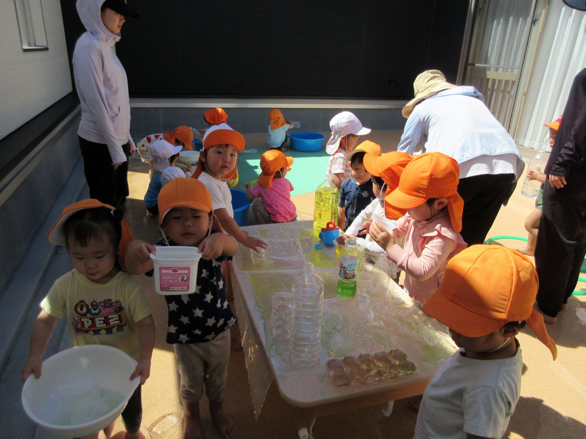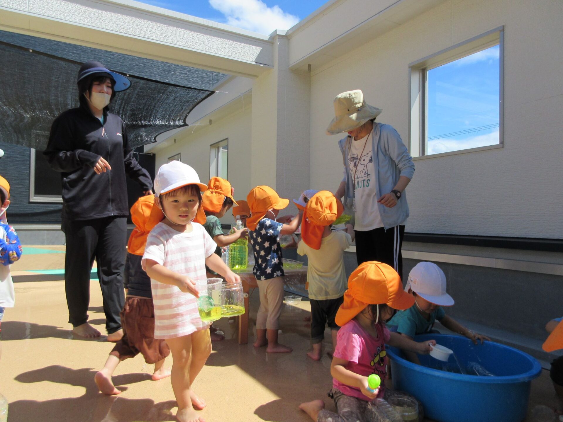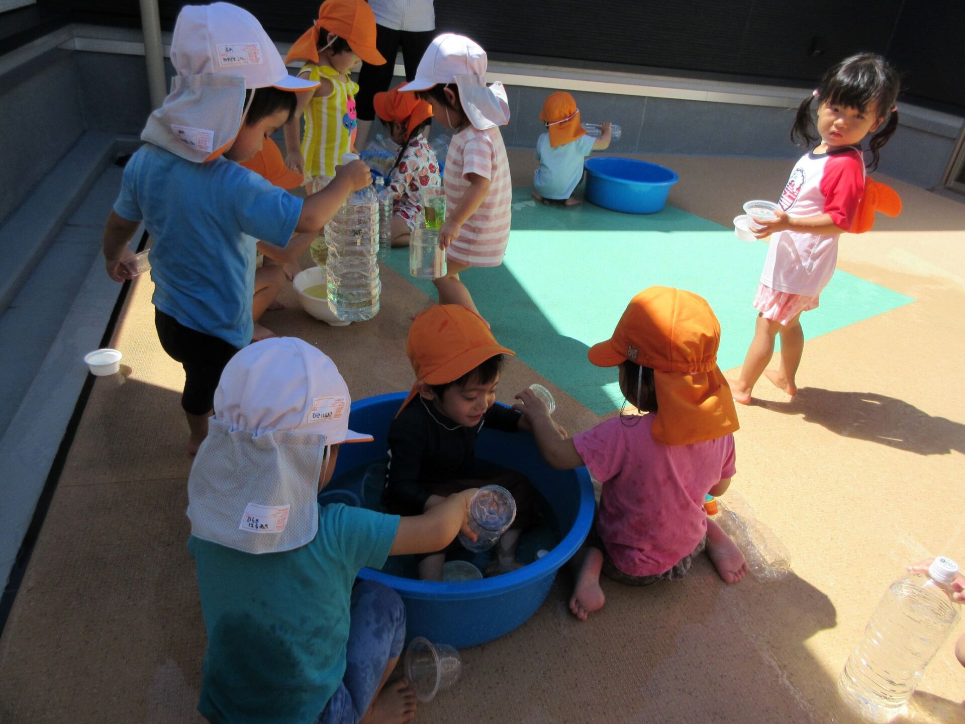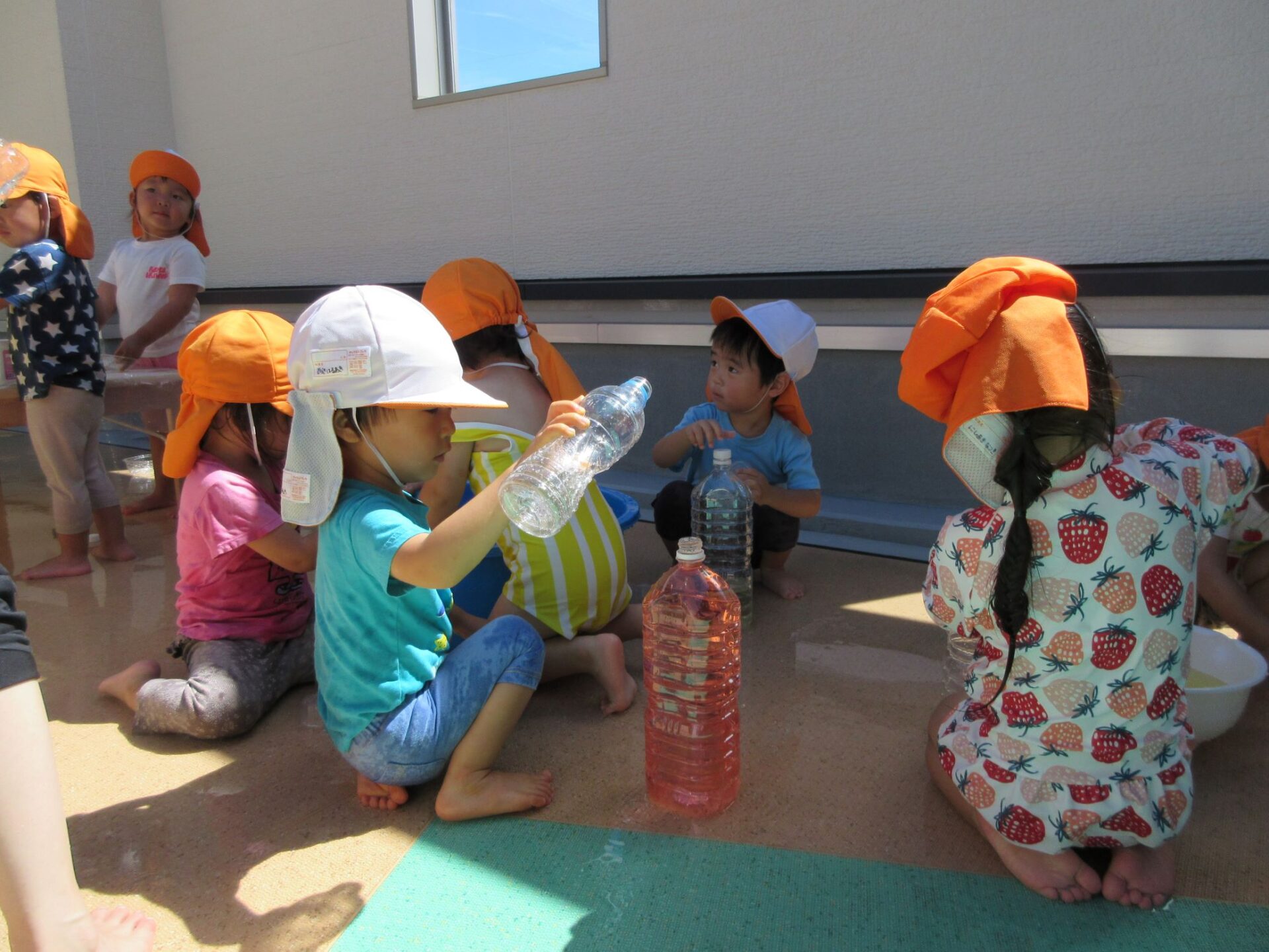 今日、8月22日の遊びを紹介します。2歳あめ組は、2階中庭で色水遊びをしました。暑いので、水遊びを兼ねています。