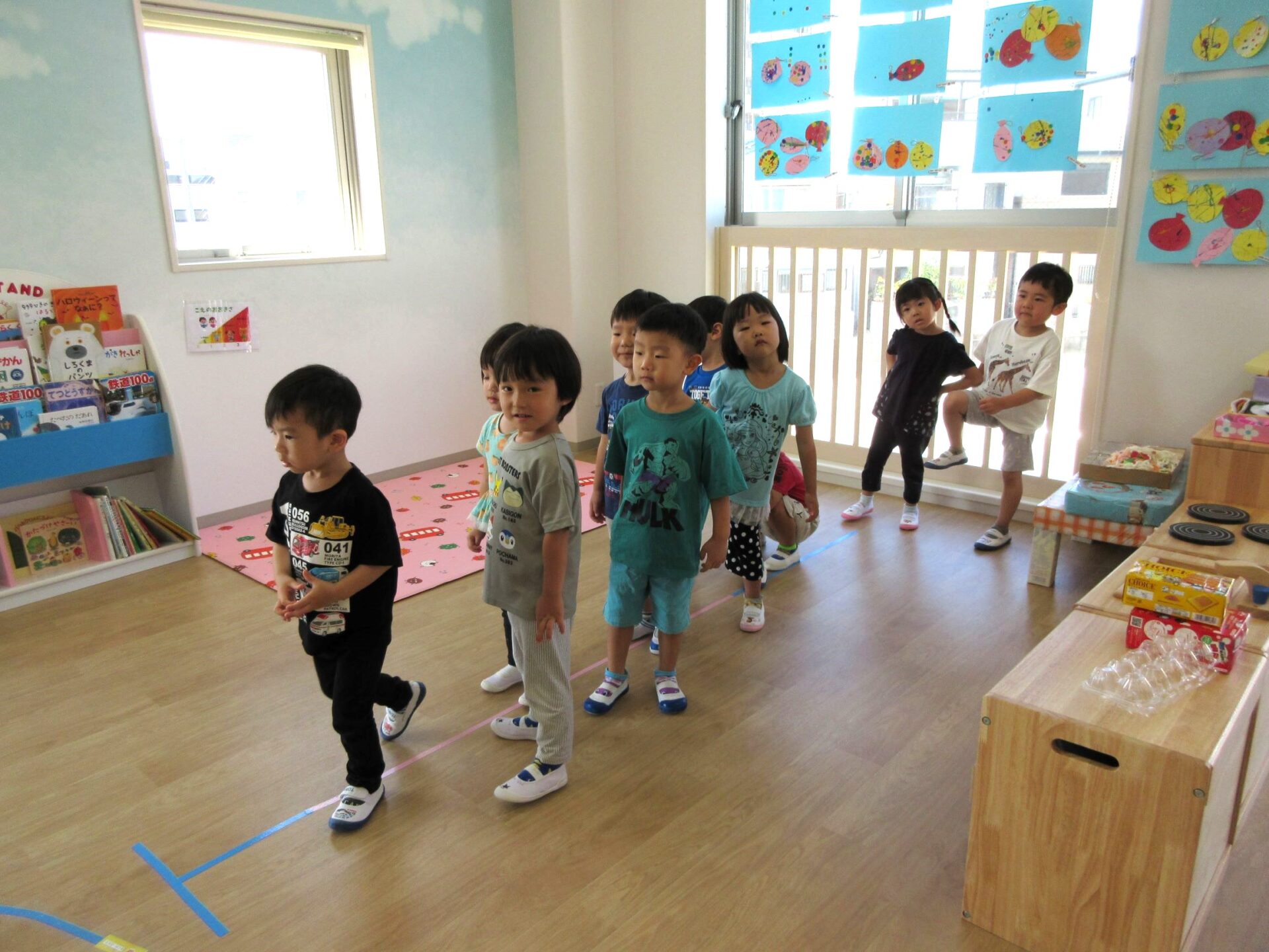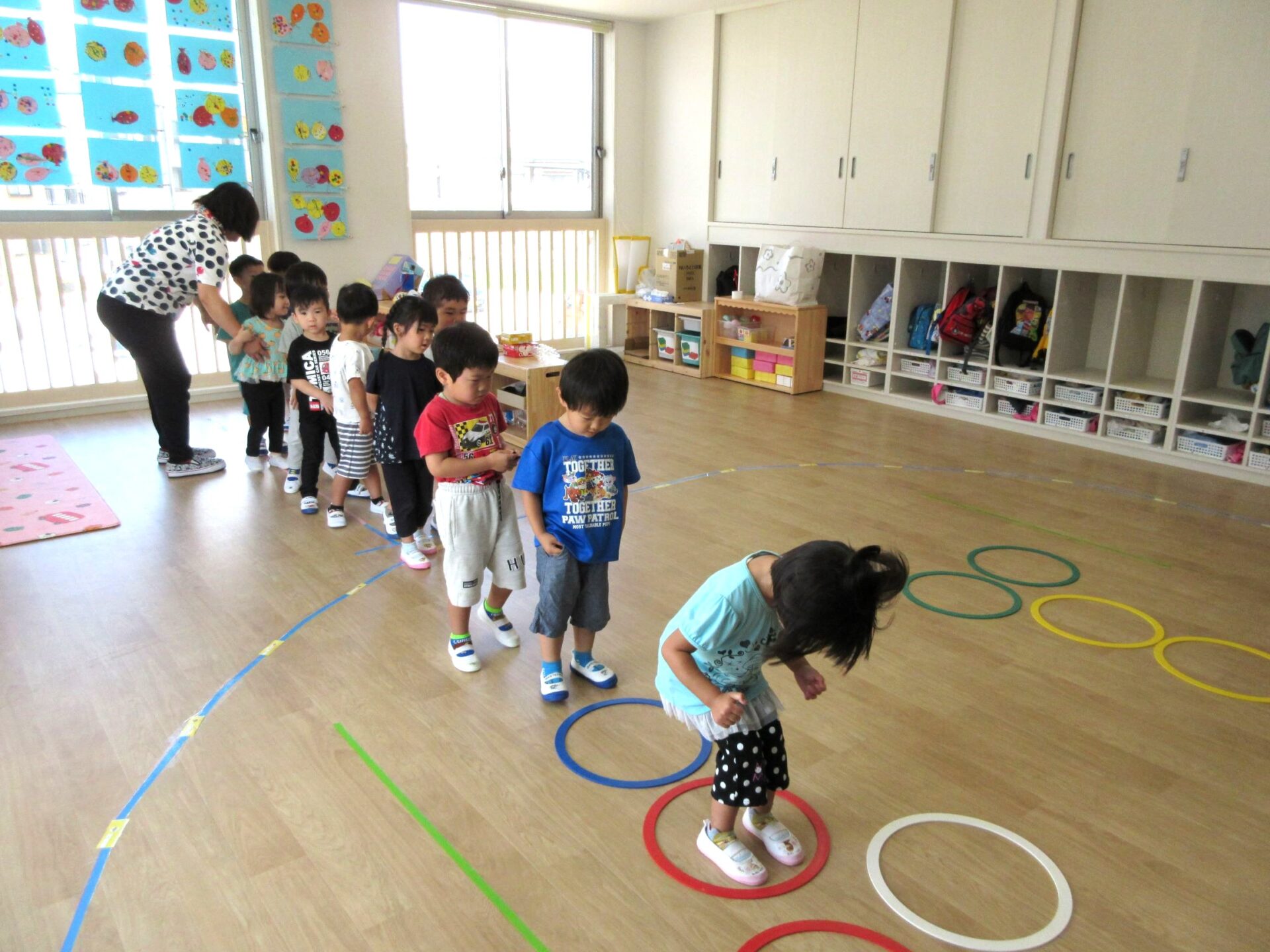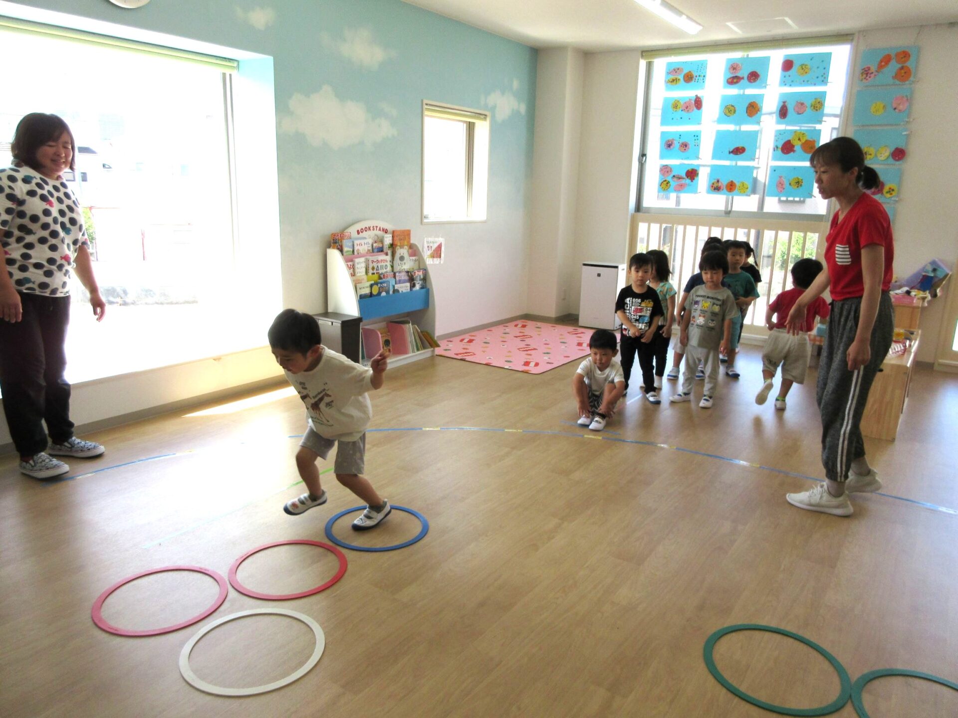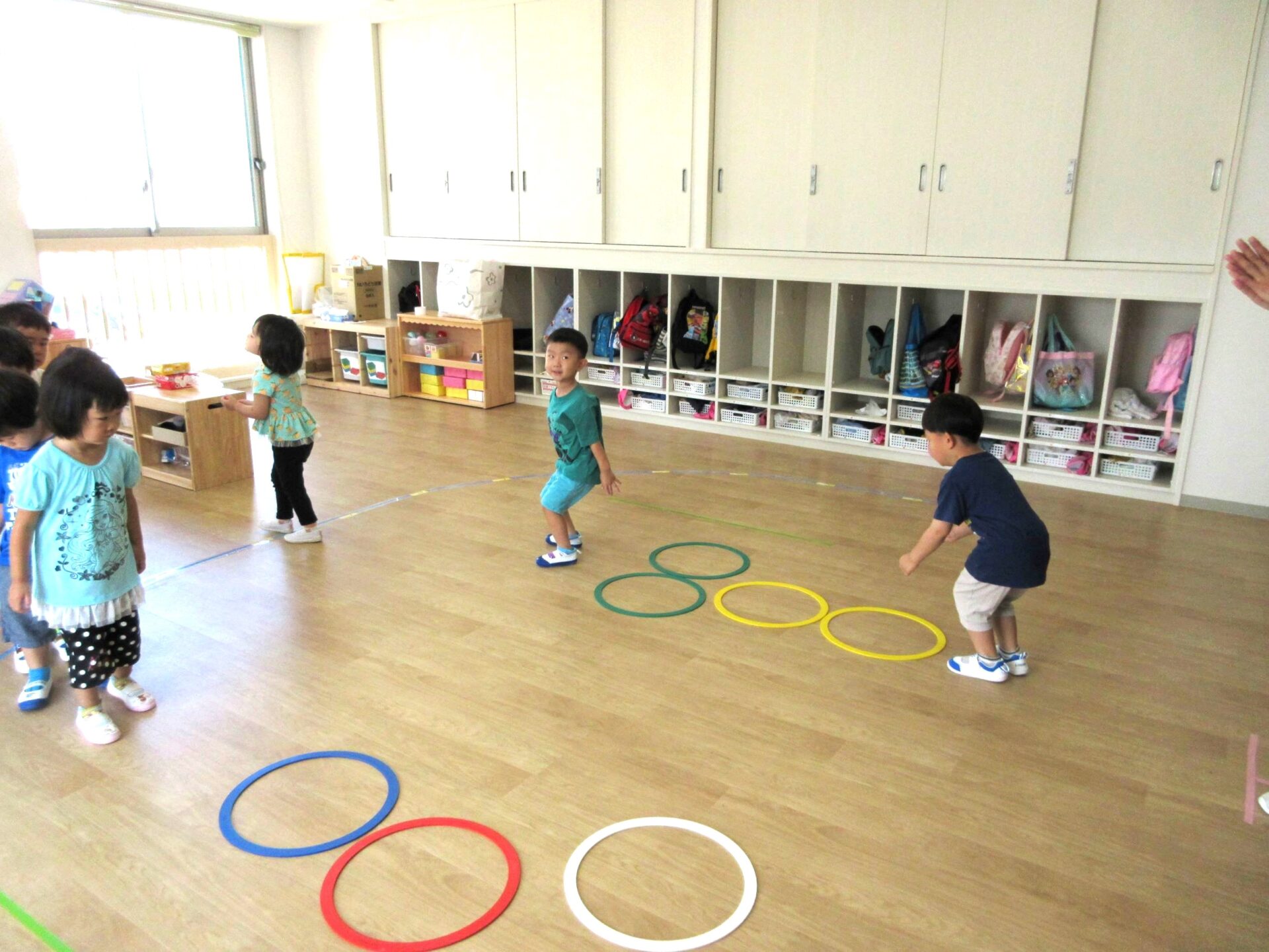 3歳にじ組は、ラバーフープを使って、運動遊びをしました。「ケン、ケン、パー」と、跳んでいました。