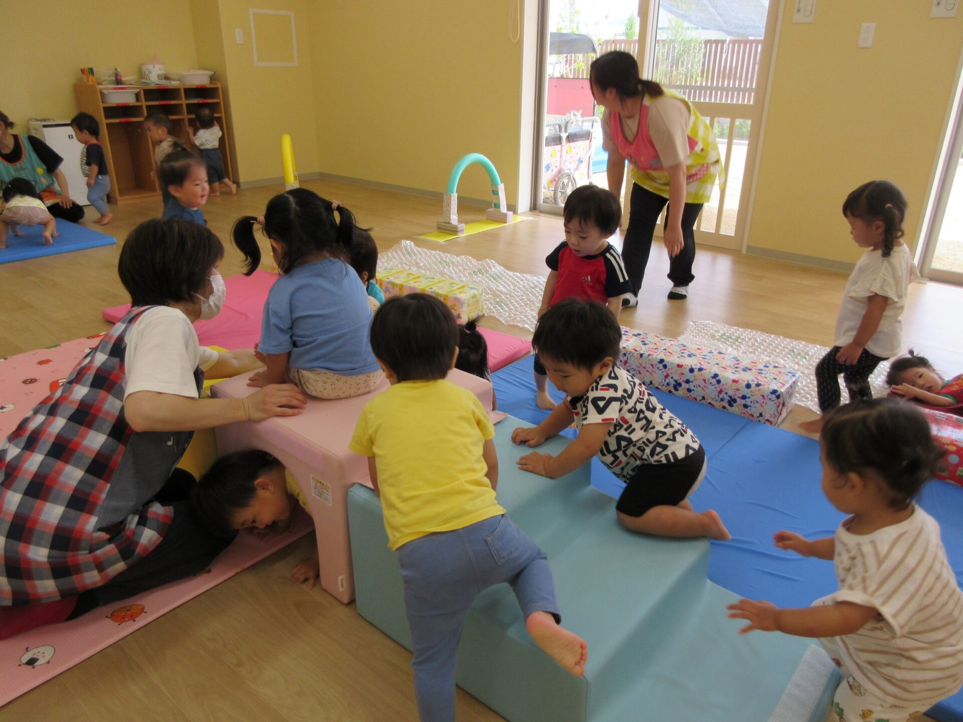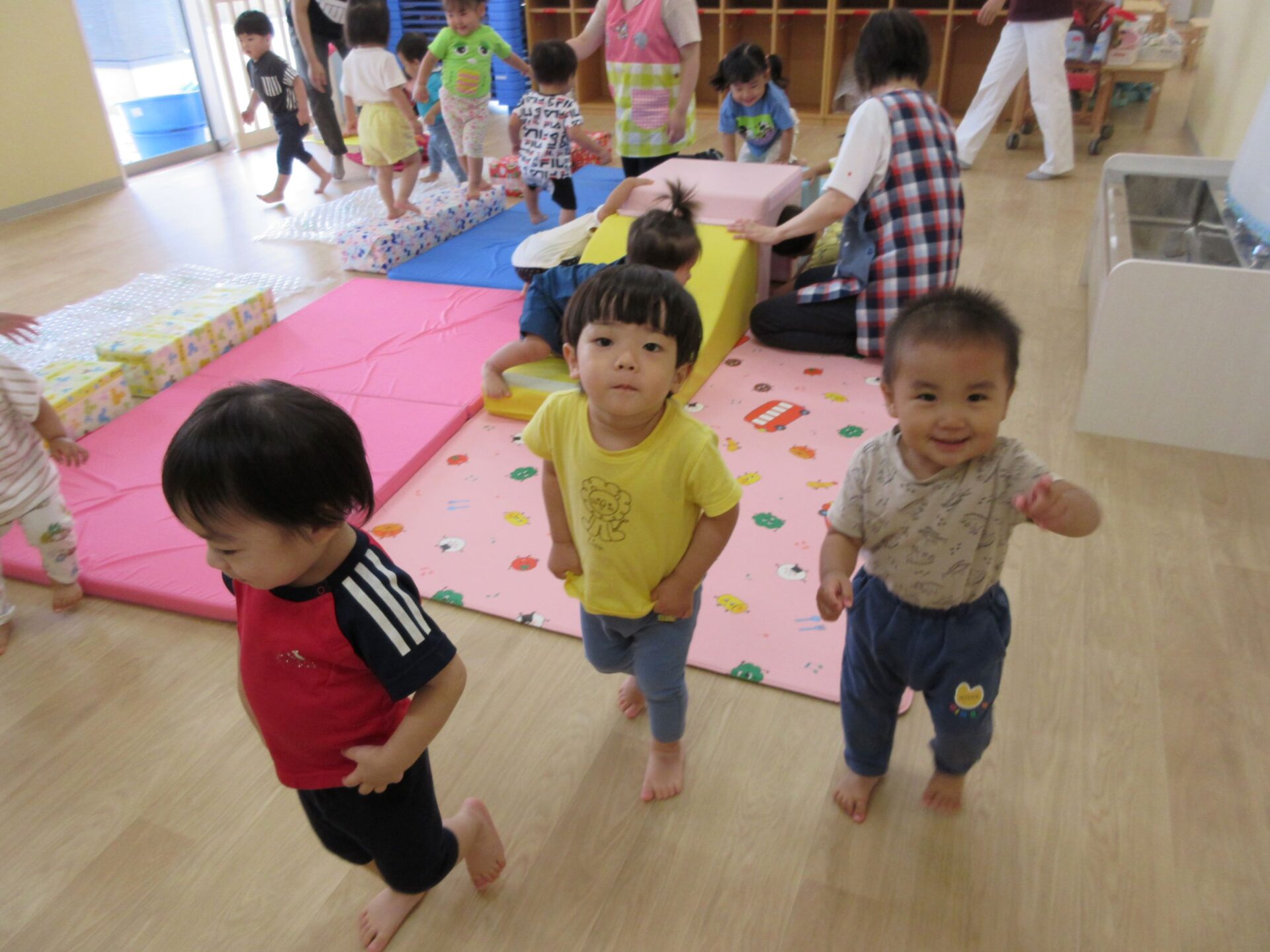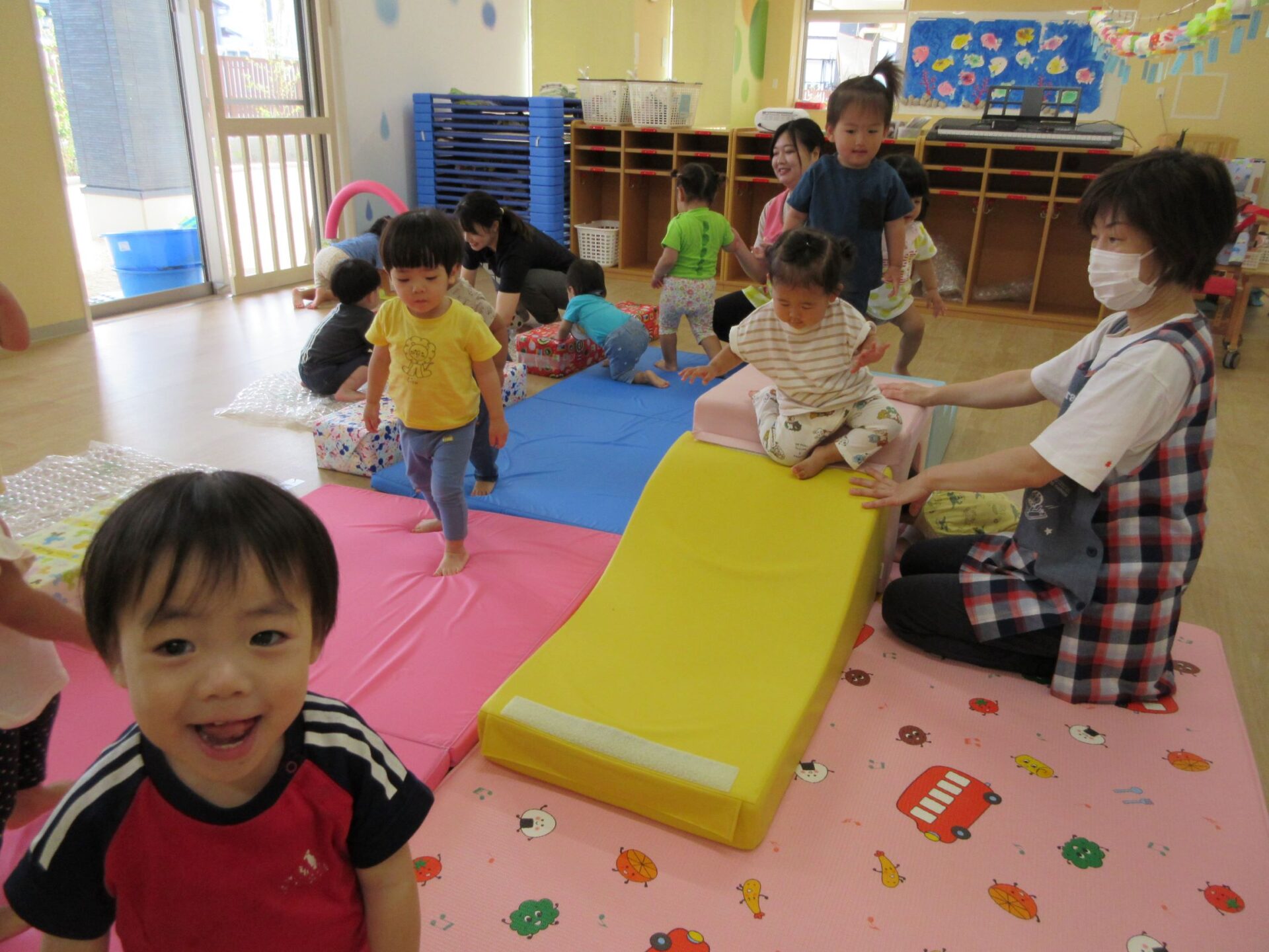 1歳だいち組も運動遊びでした。「ハイハイランド」って呼んでいました。マットや跳び箱、トンネル、滑り台、輪くぐり、ふわふわマットがあります。