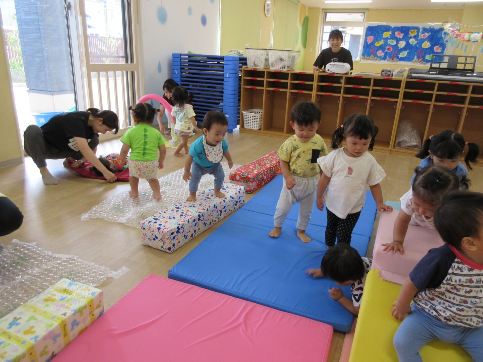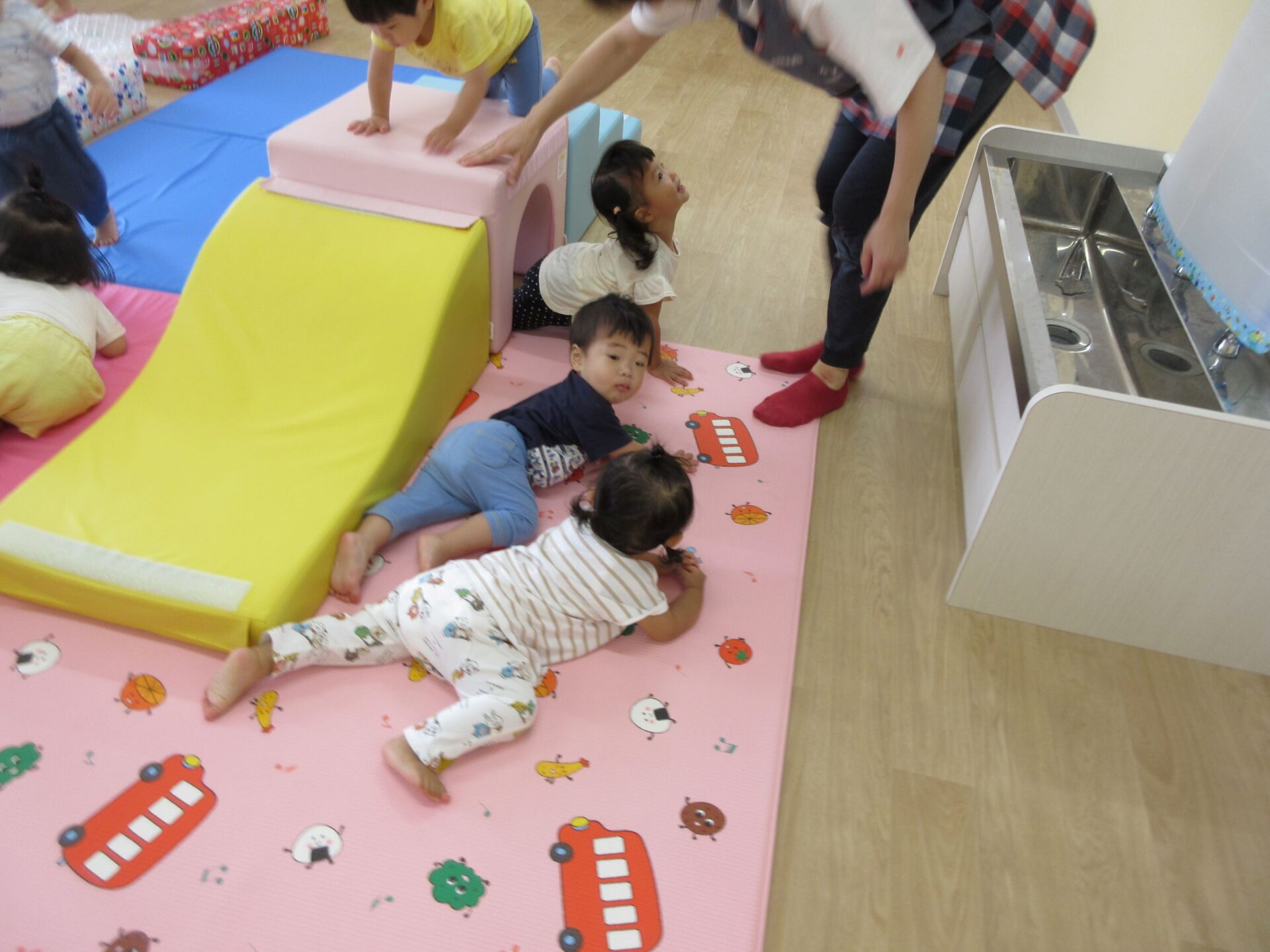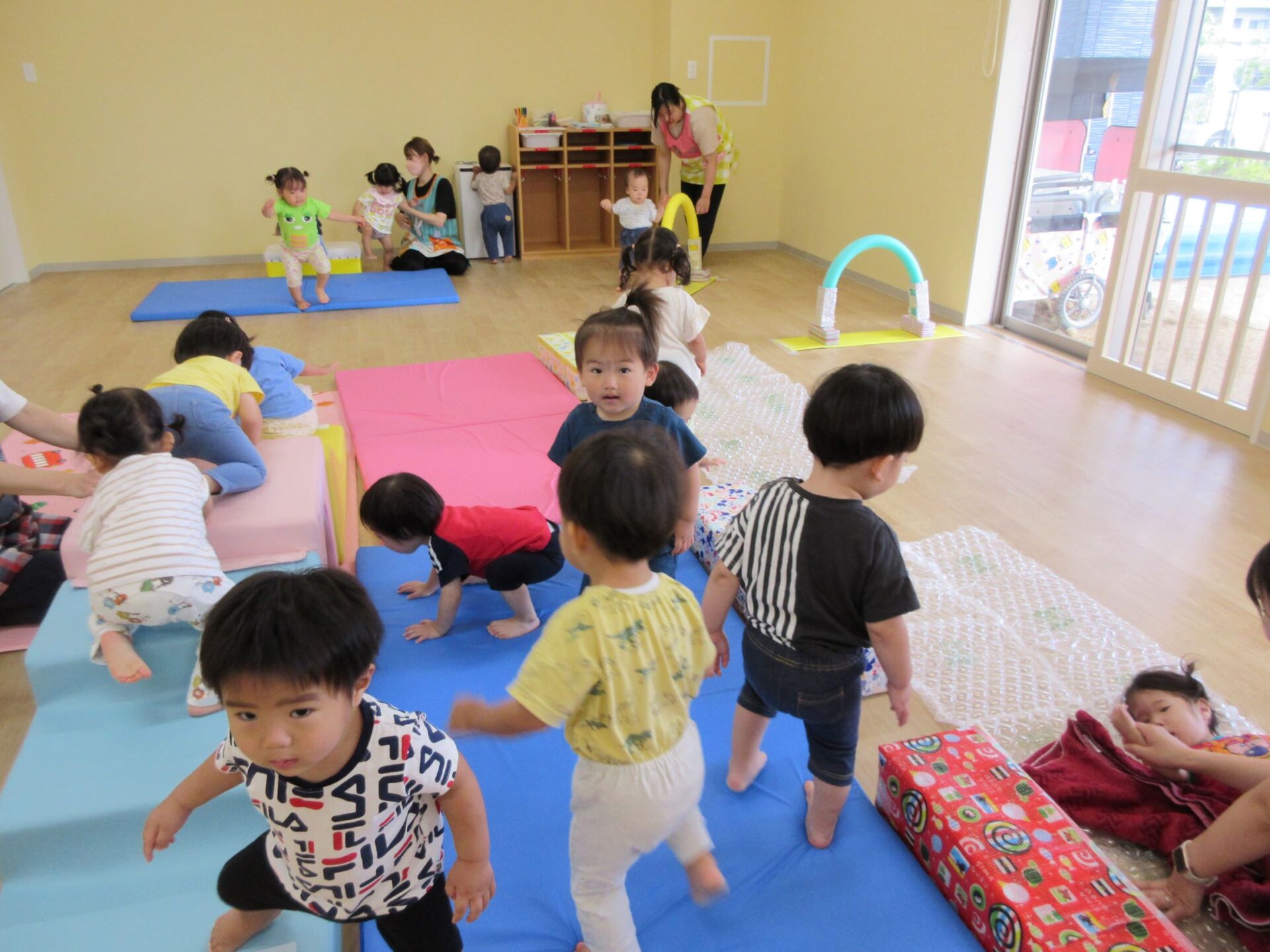 1歳だいち組も運動遊びでした。「ハイハイランド」って呼んでいました。マットや跳び箱、トンネル、滑り台、輪くぐり、ふわふわマットがあります。