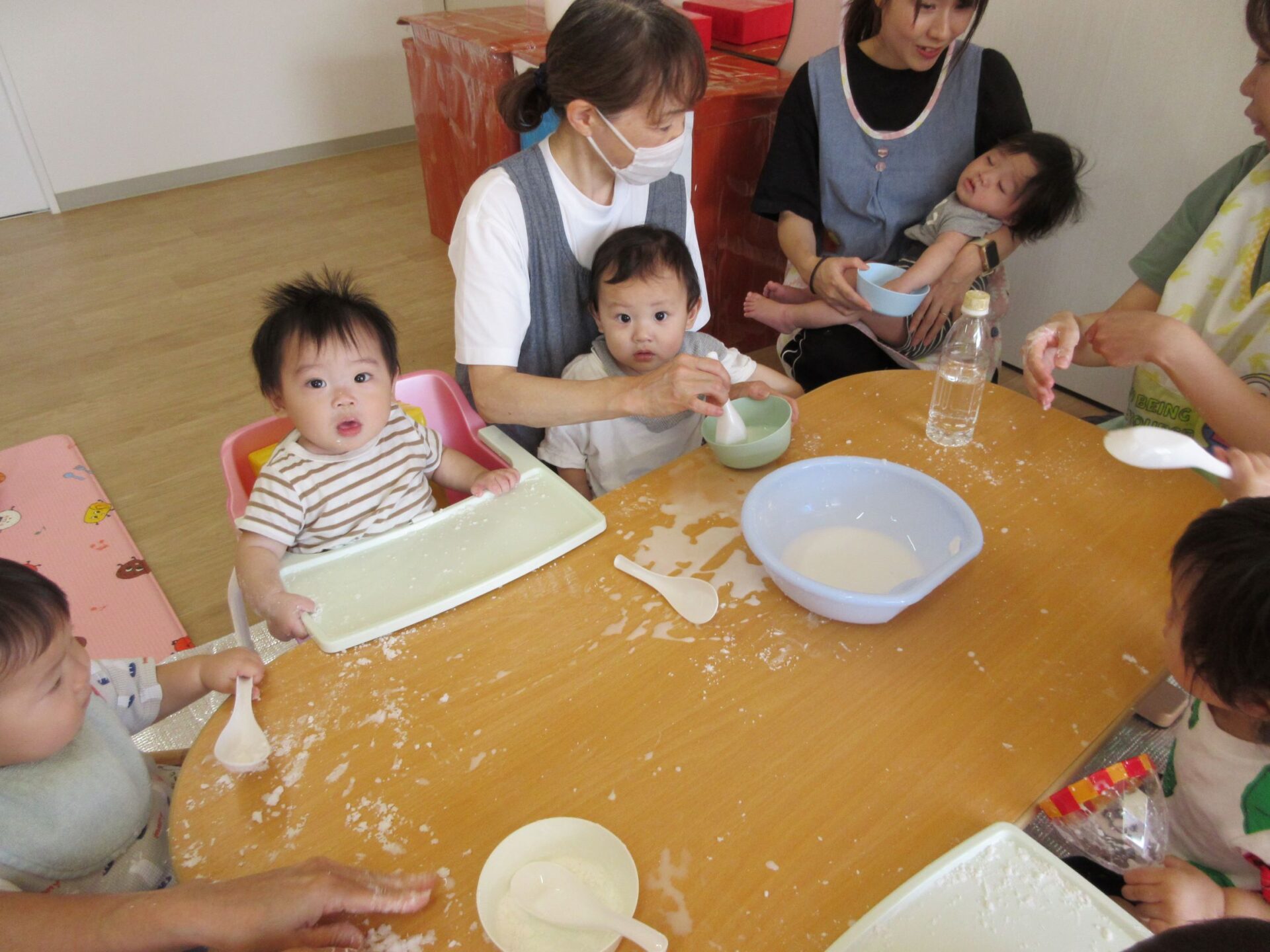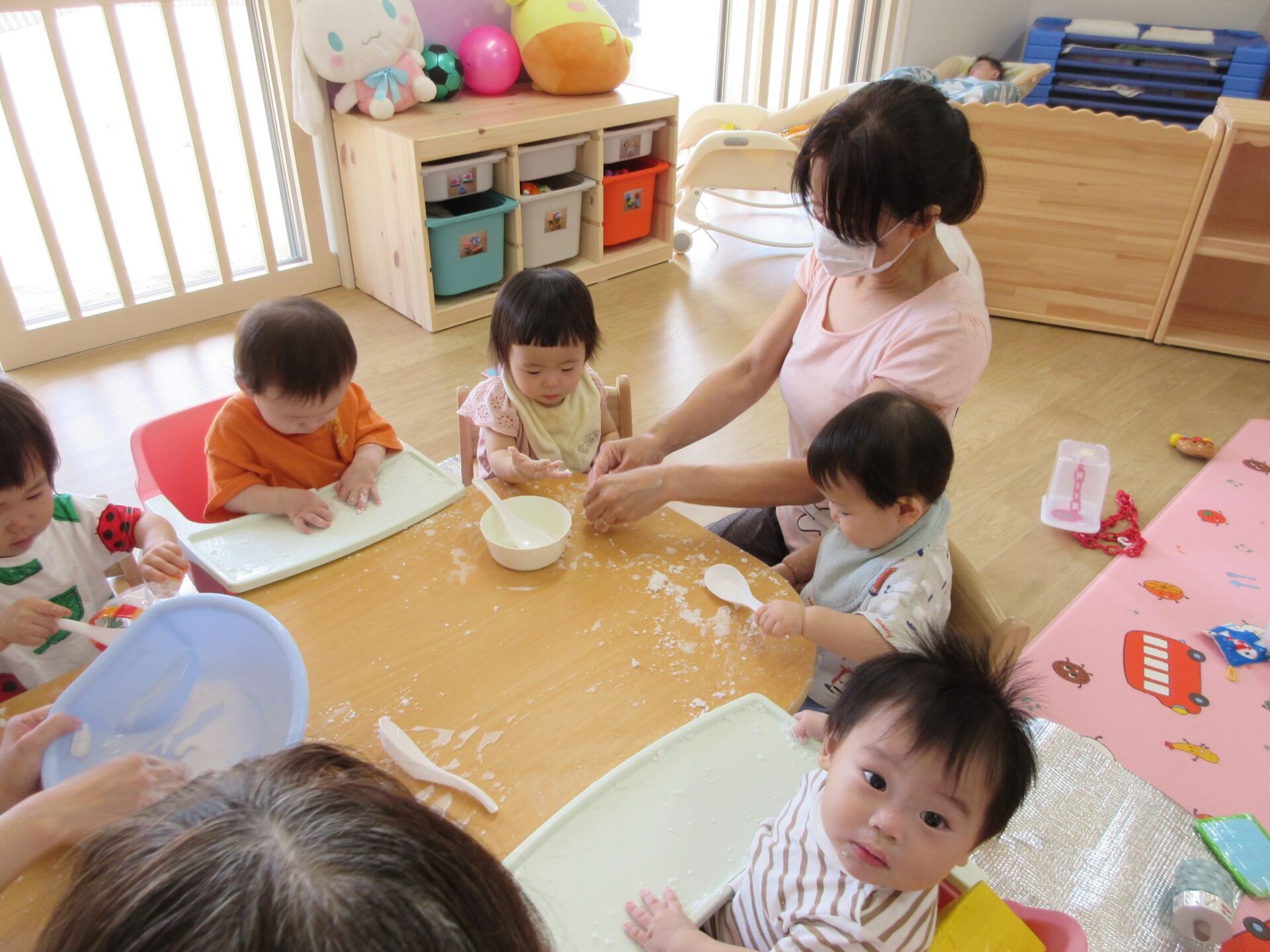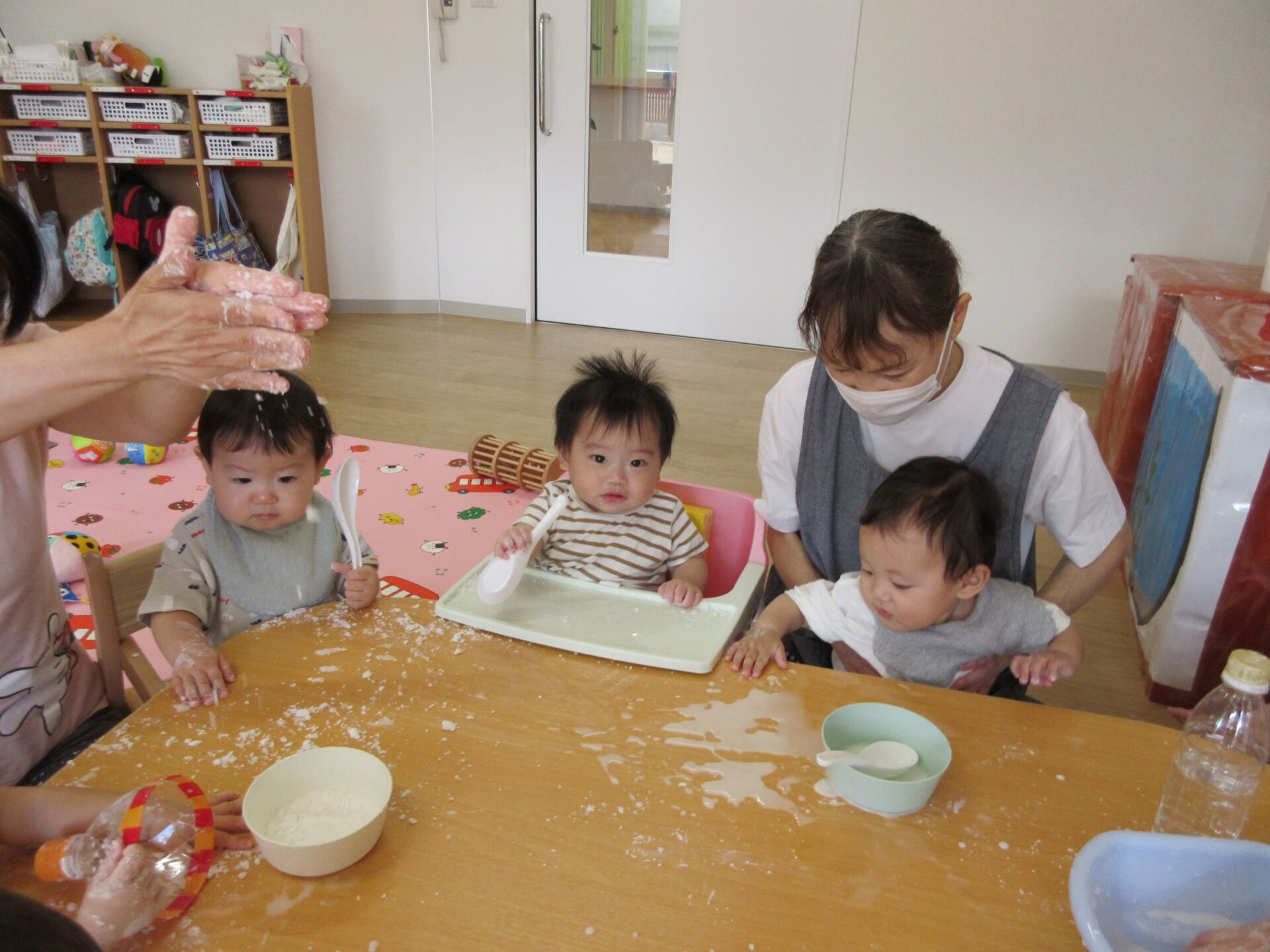 0歳うみ組は、片栗粉を使って感触遊びです。夢中になっていて、カメラのほうを向いてもらえません。