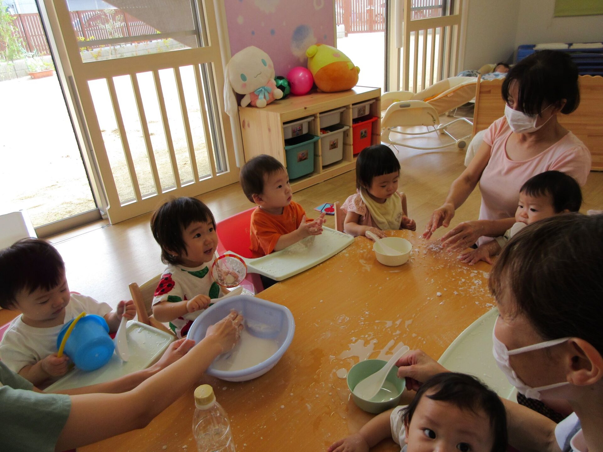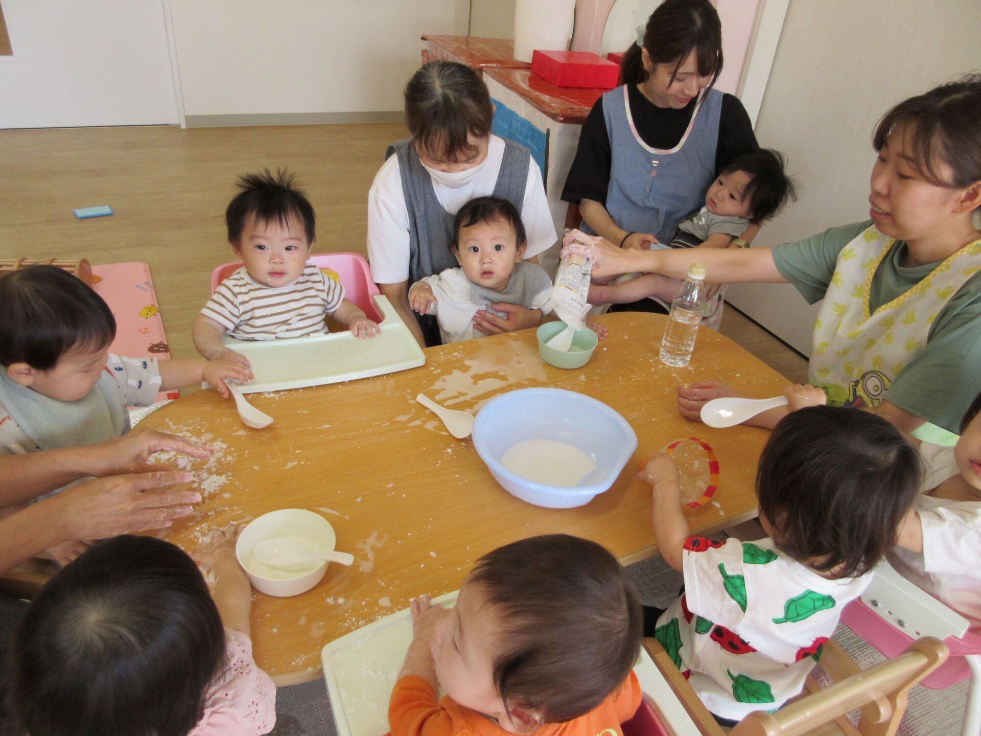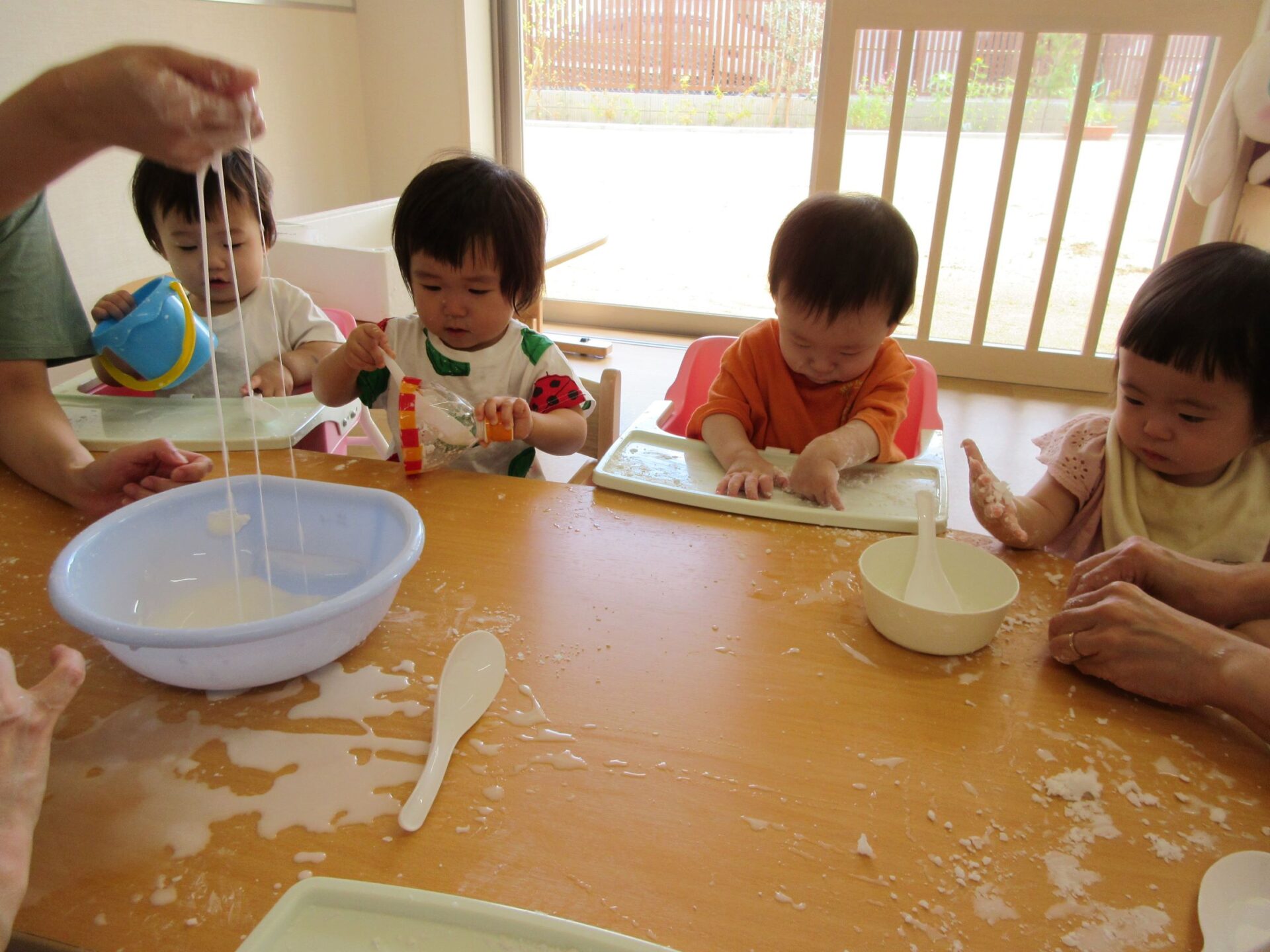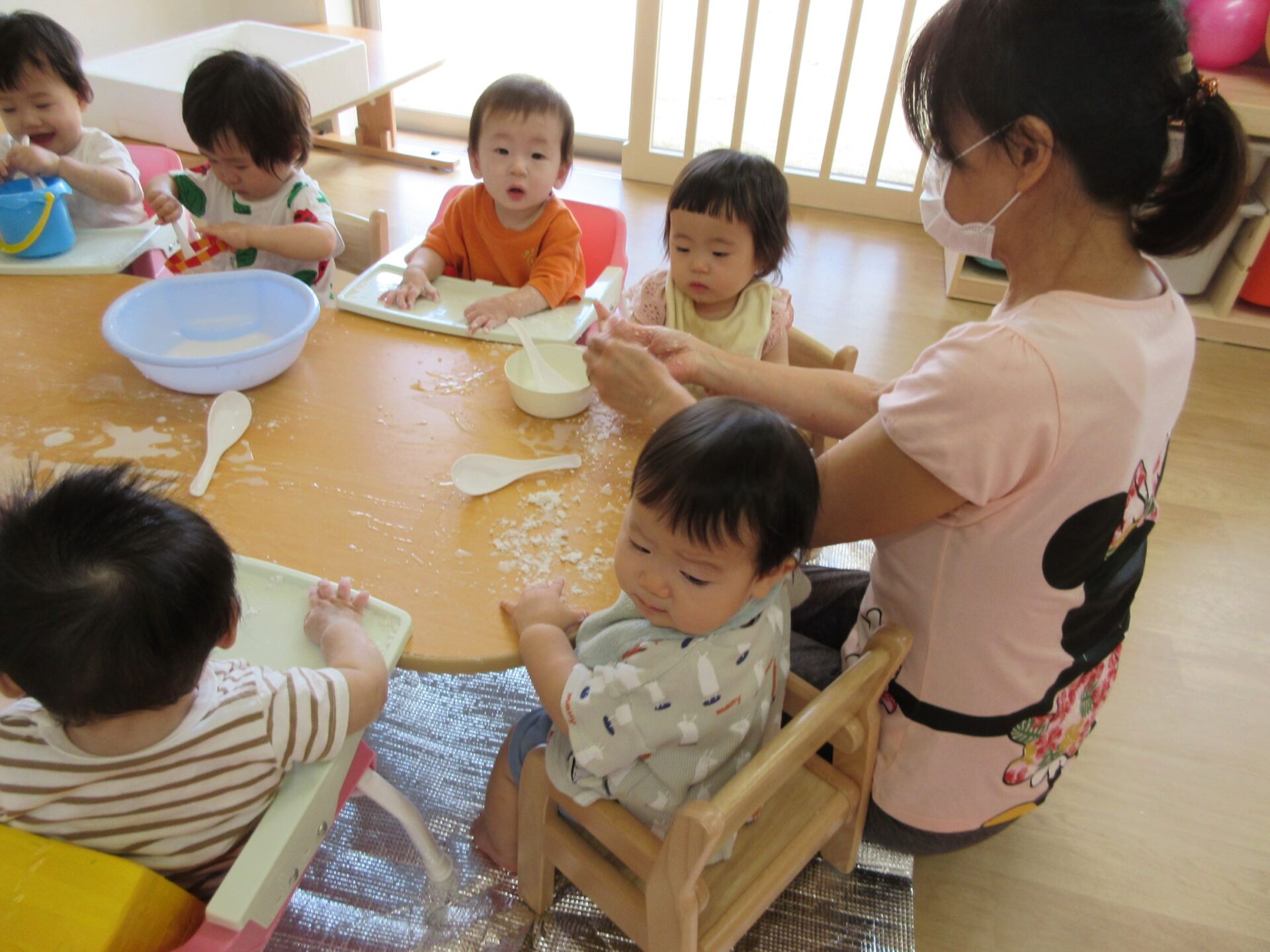 0歳うみ組は、片栗粉を使って感触遊びです。夢中になっていて、カメラのほうを向いてもらえません。