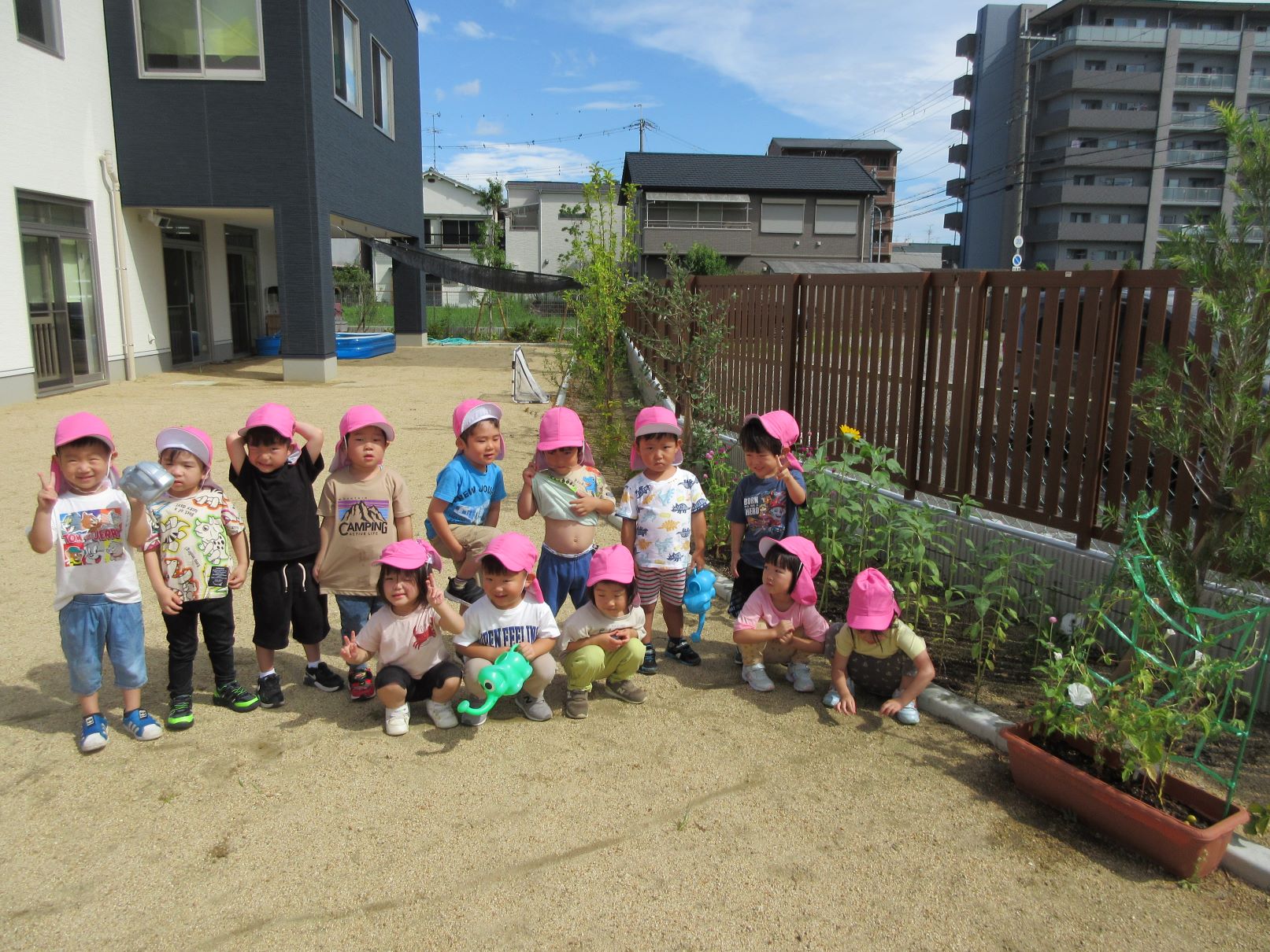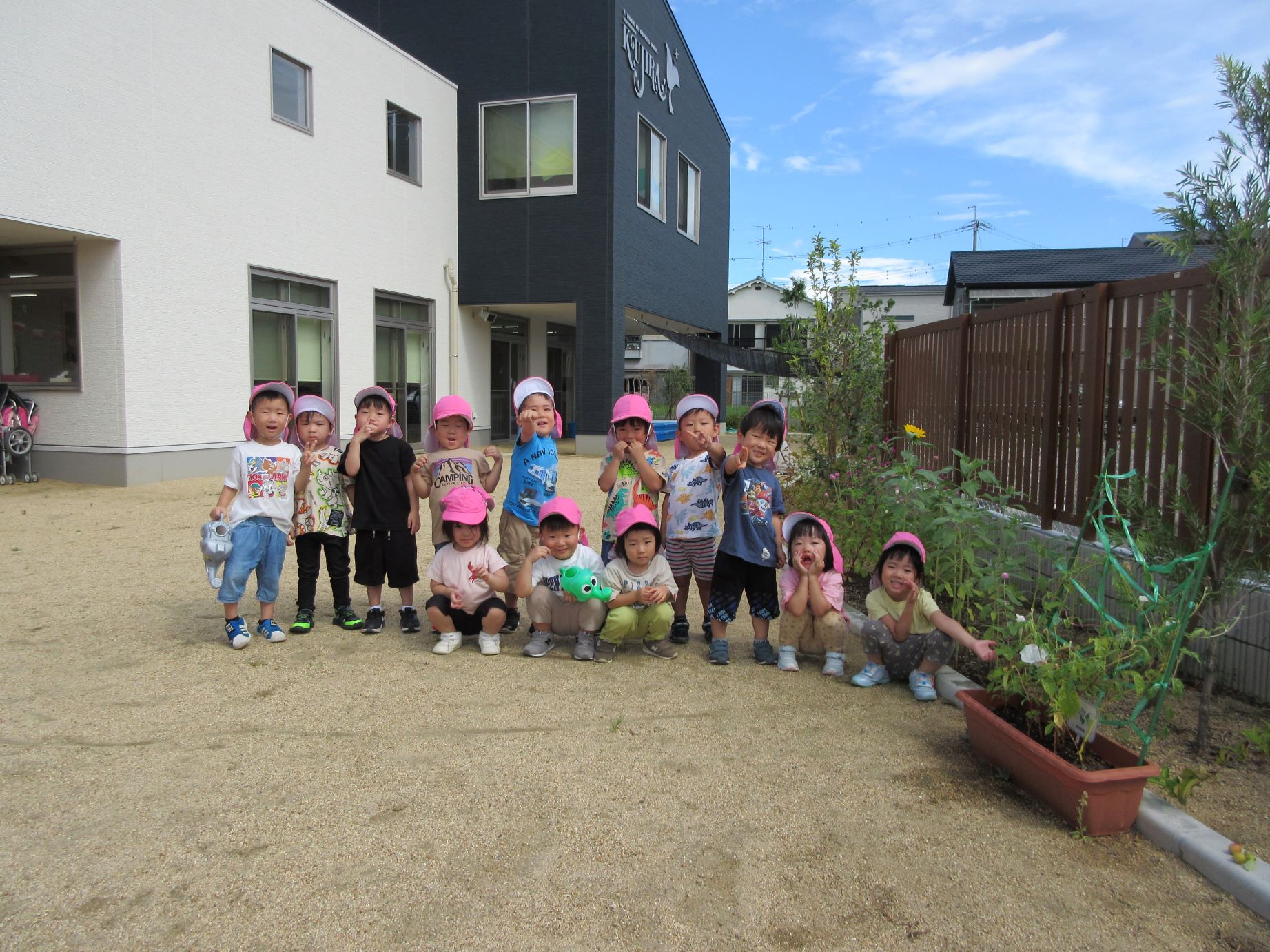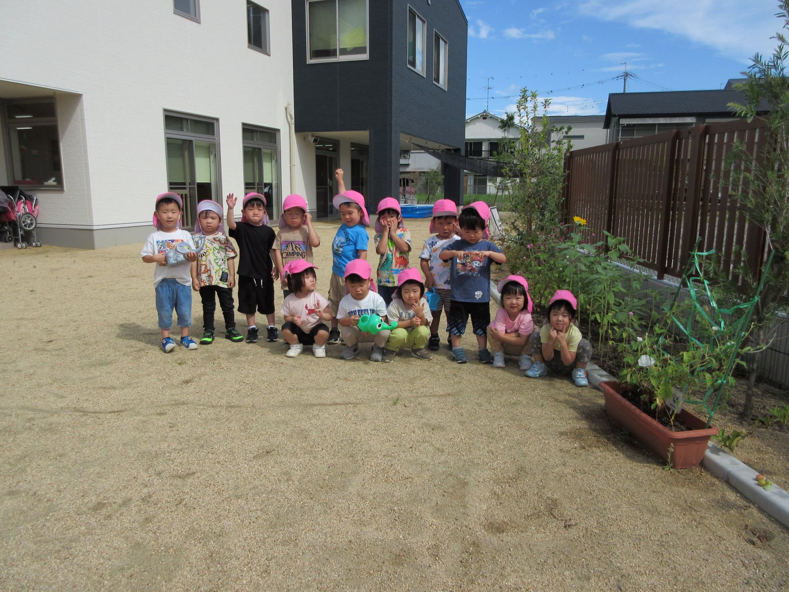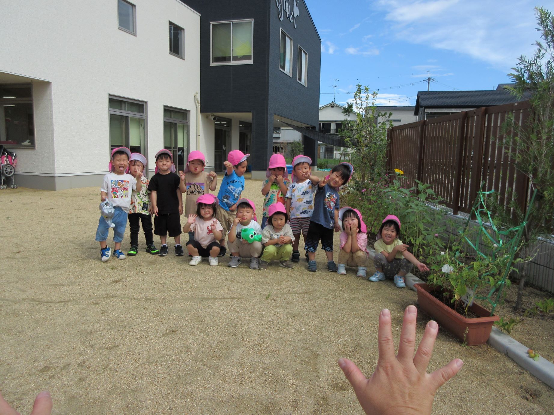 2023.08.23 お知らせ ブログ ひまわりが咲きました。 3歳にじ組が種をまいて育てていたひまわりが、1輪やっと咲きました。記念写真を撮ろうと集まりましたが・・。 ちゃんと写真が撮れるんでしょうか。 あっちを向いたり、おもしろい顔をしたり・・。 少し角度を変えて・・、少しそろってきたかな。 前の先生が、「ハイ!こっちをむいて!」と言ってくれています。 これが一番、いい感じかな。ひまわりが咲いた記念の写真でした。 一覧へ戻る