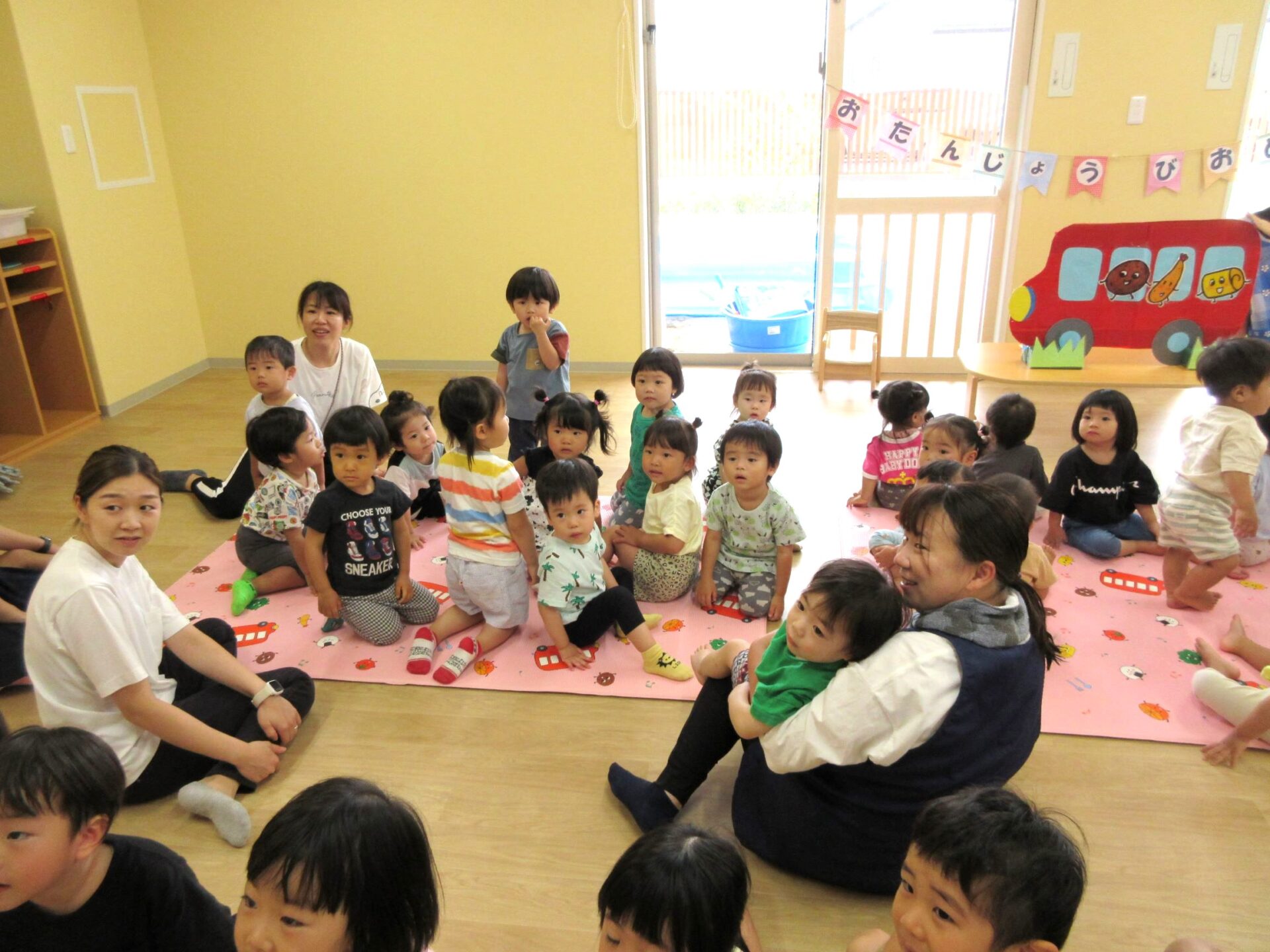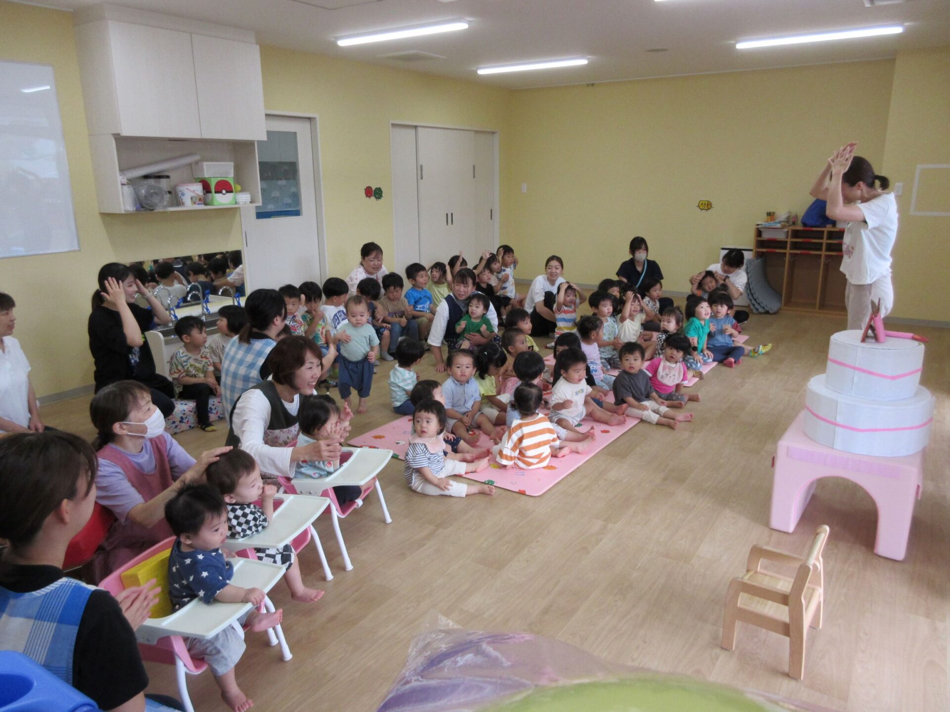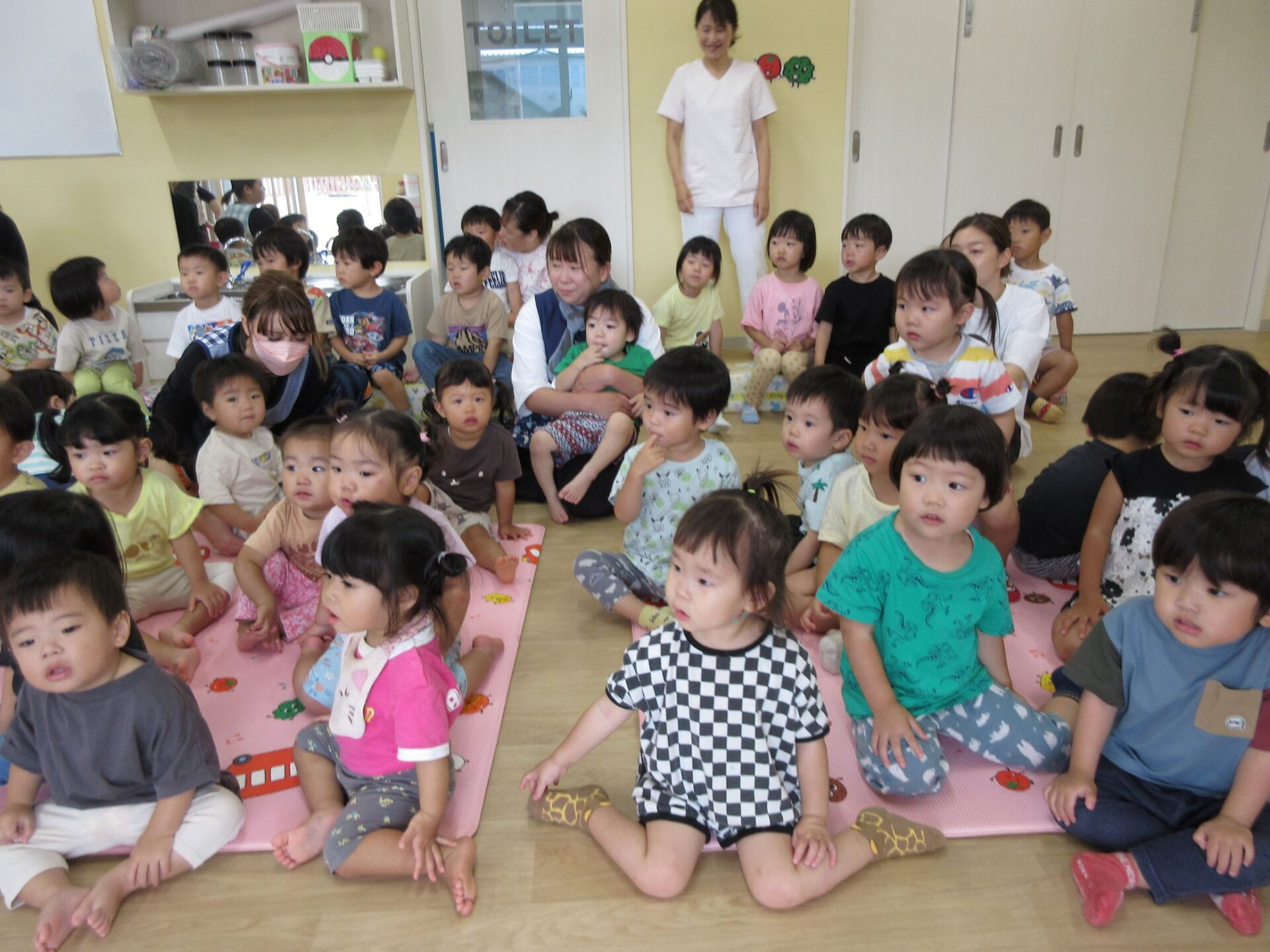 今日は、8月の誕生会。全員が1階のだいち組の隣の部屋に集まりました。担当の先生のお話です。