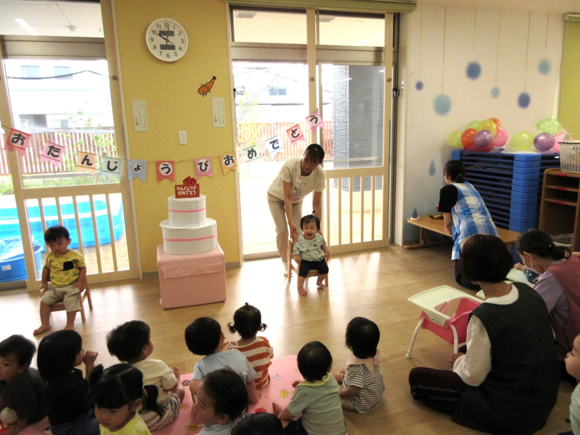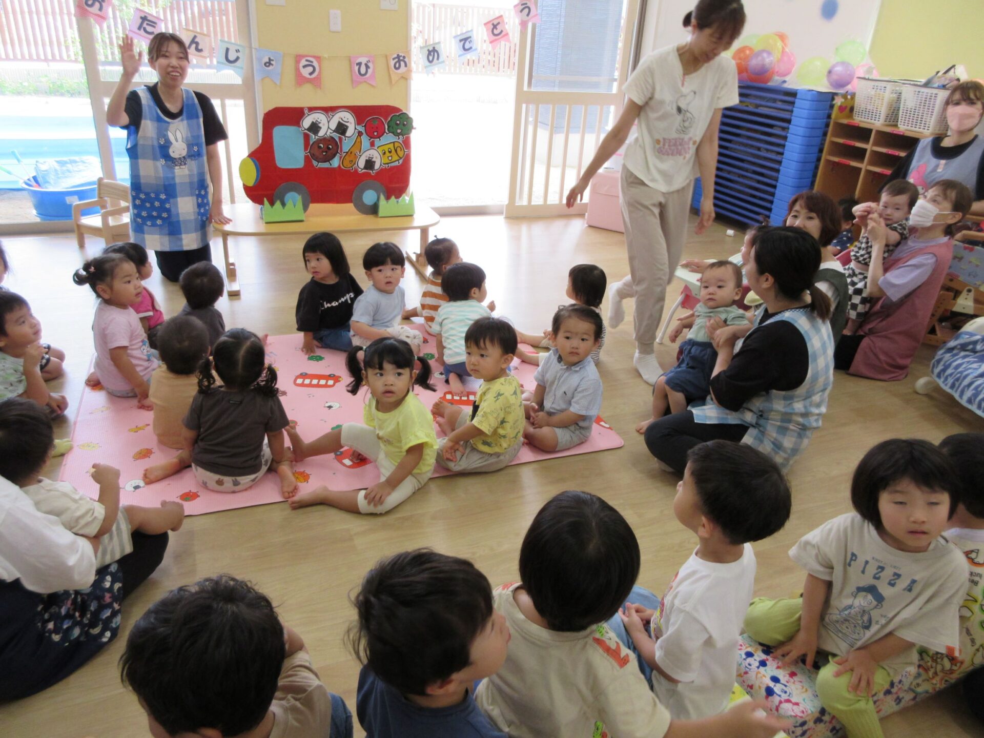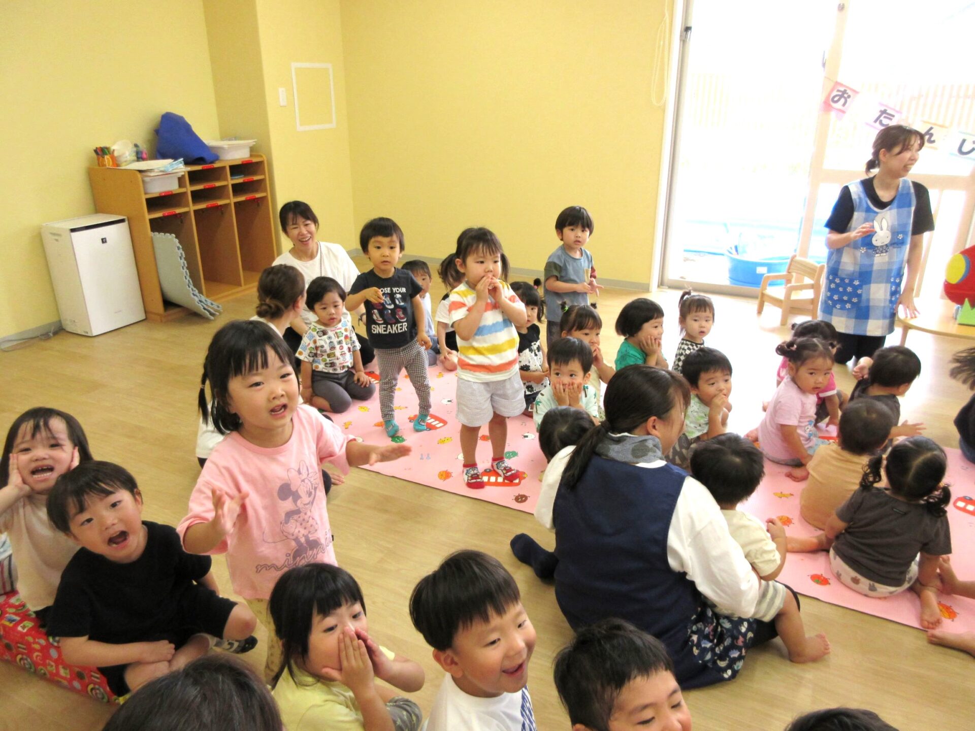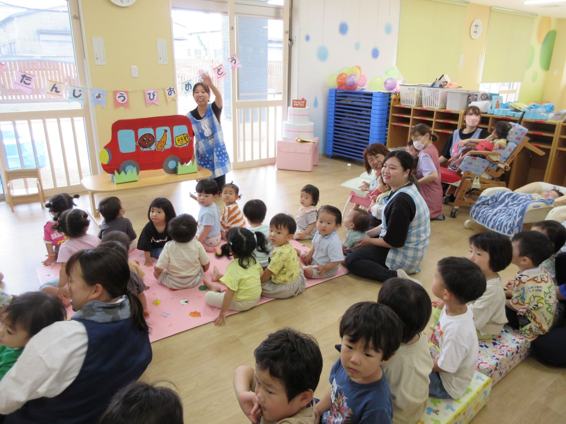 今日は、8月の誕生会。全員が1階のだいち組の隣の部屋に集まりました。担当の先生のお話です。