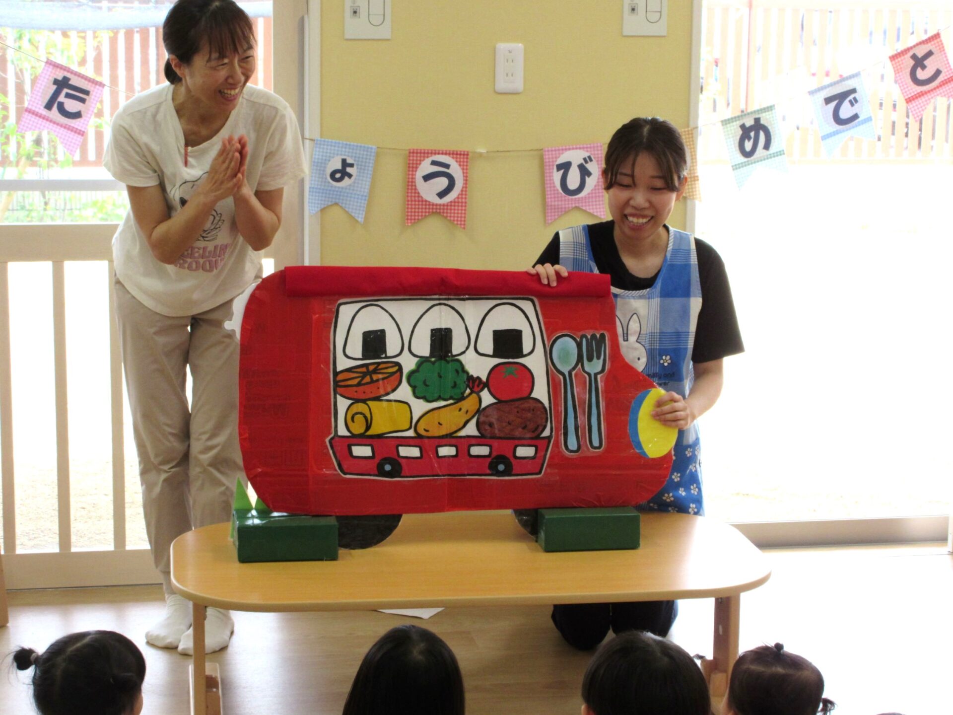 「おべんとうバス」って言うんだって。部屋のまわりにいろいろな食べ物が隠れていて、それをみんなで見つけてバスに乗ってもらっています。