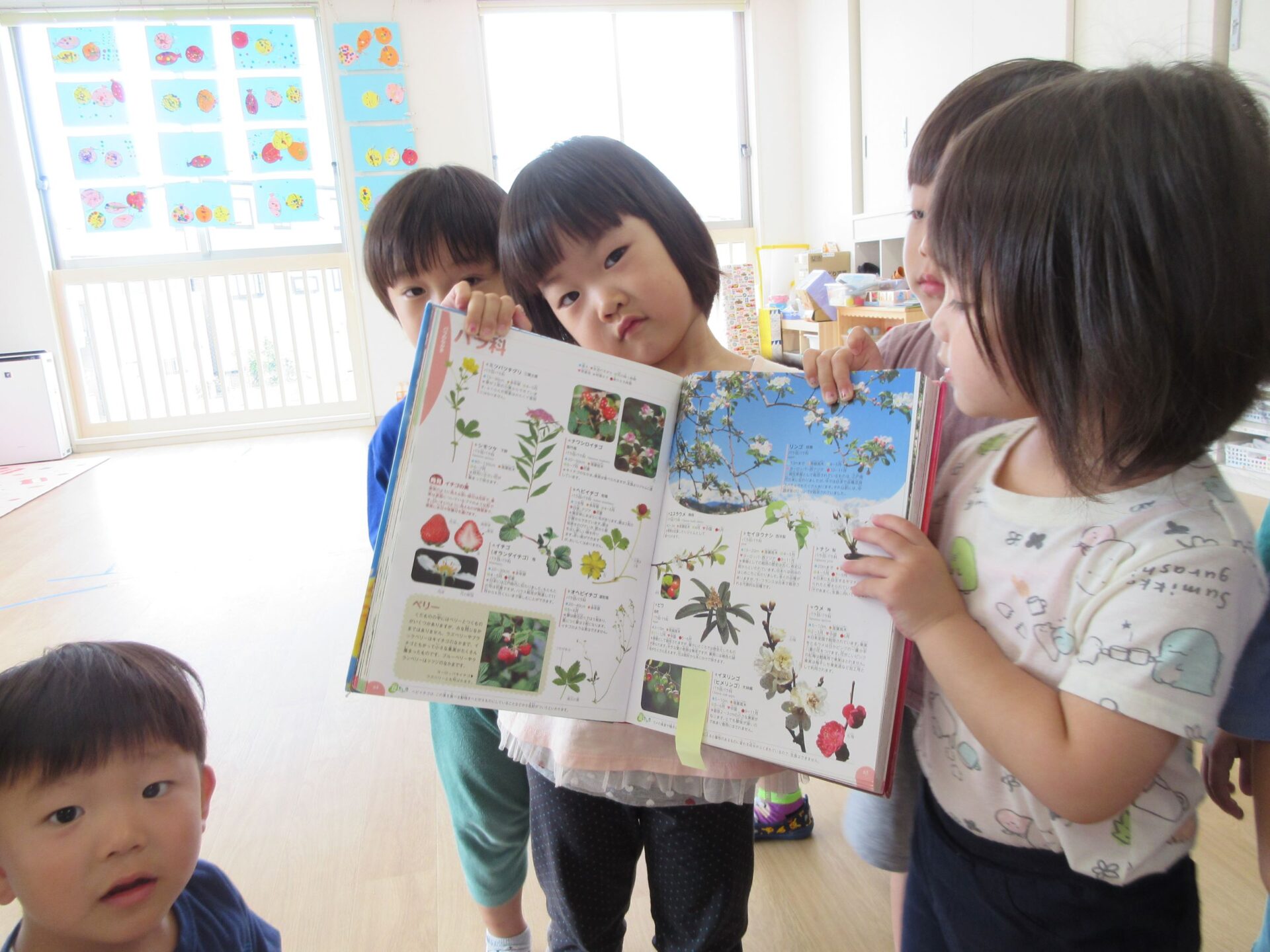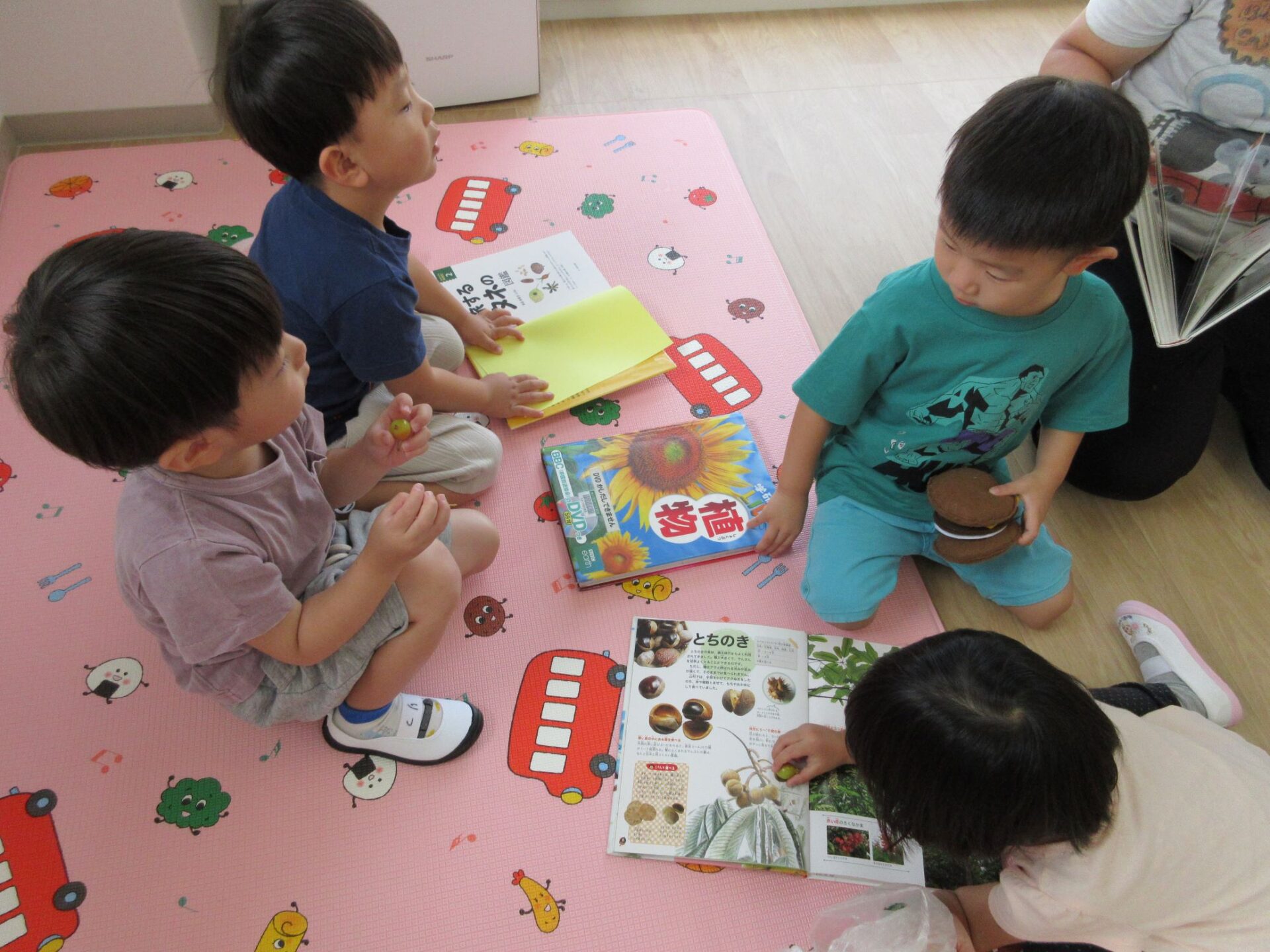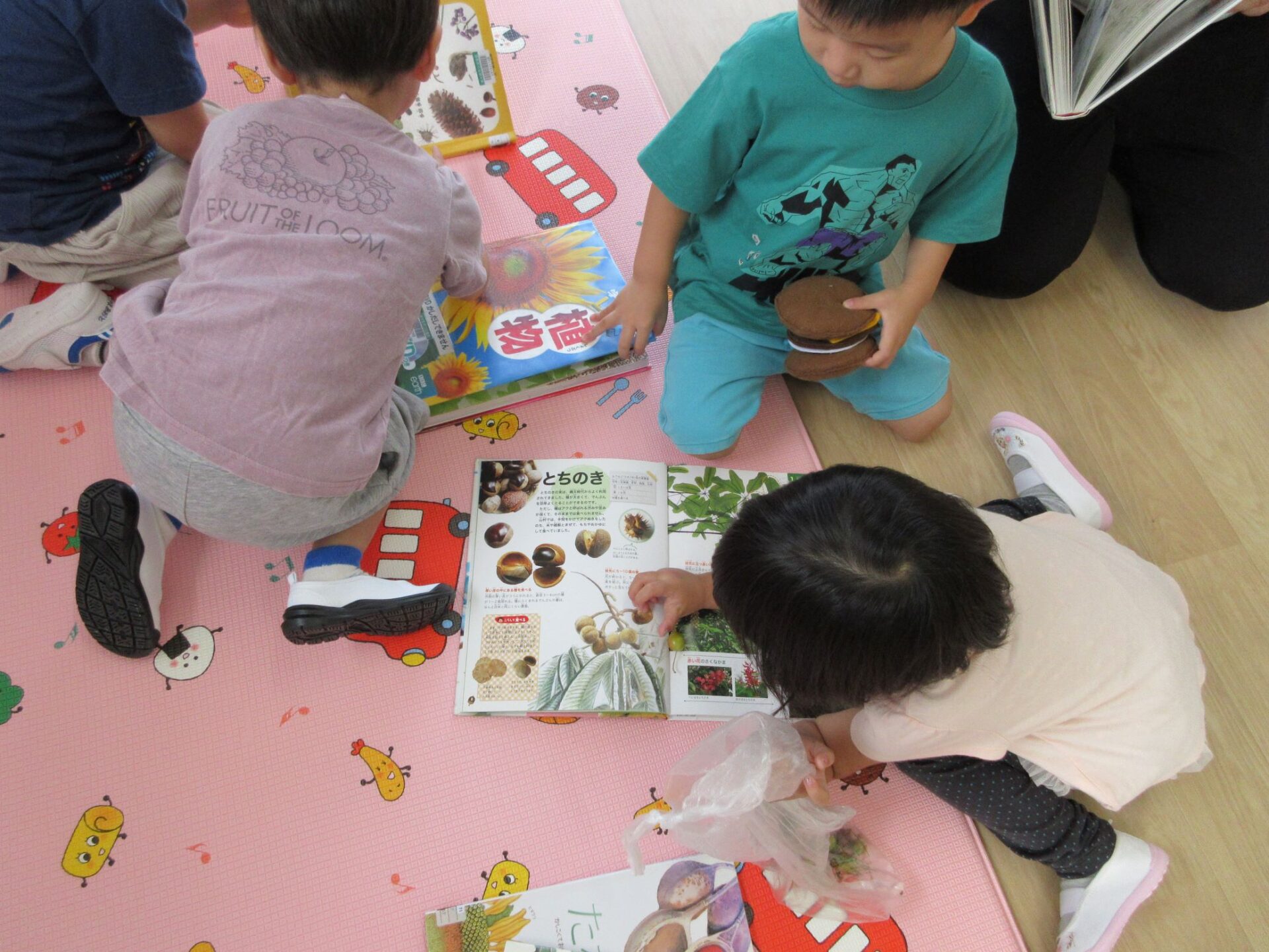 先生に頼んで、図鑑で調べることにしました。「リスさんが落としたドングリ?」「なんか、りんごのにおいがした。」いろんな声が飛び交います。