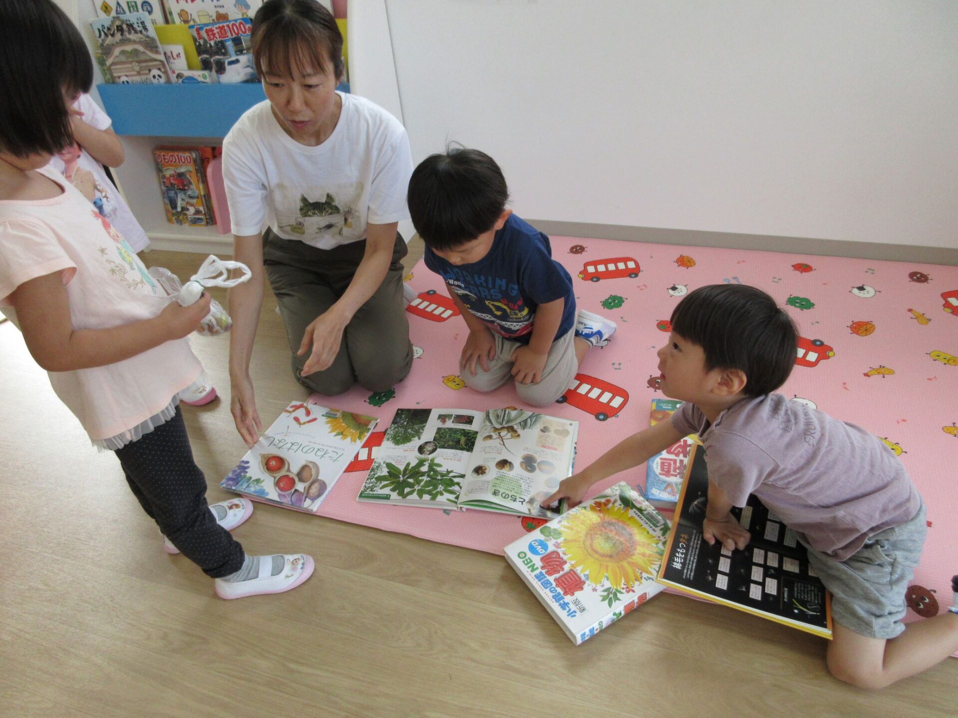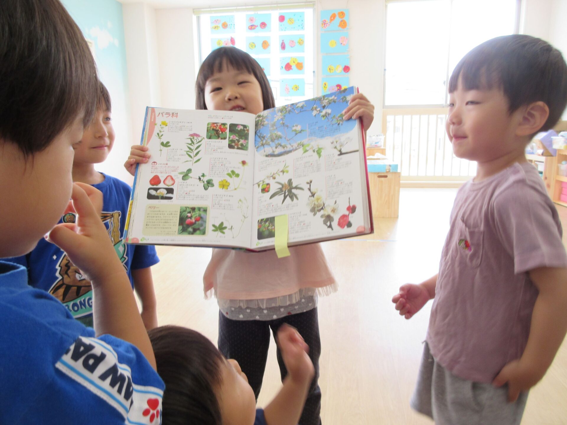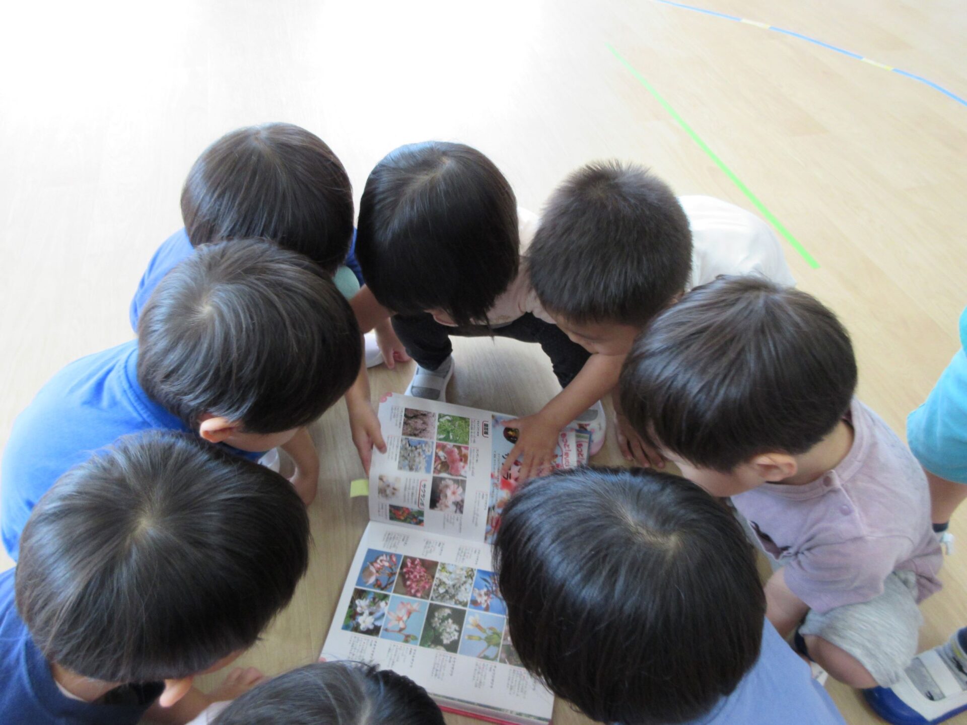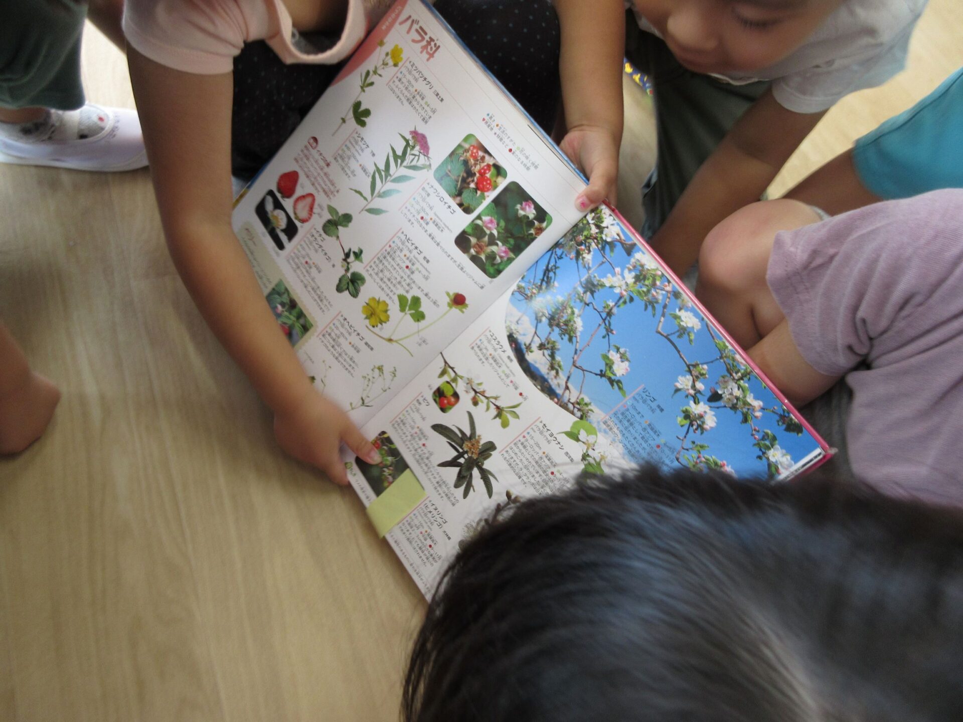 先生に頼んで、図鑑で調べることにしました。「リスさんが落としたドングリ?」「なんか、りんごのにおいがした。」いろんな声が飛び交います。