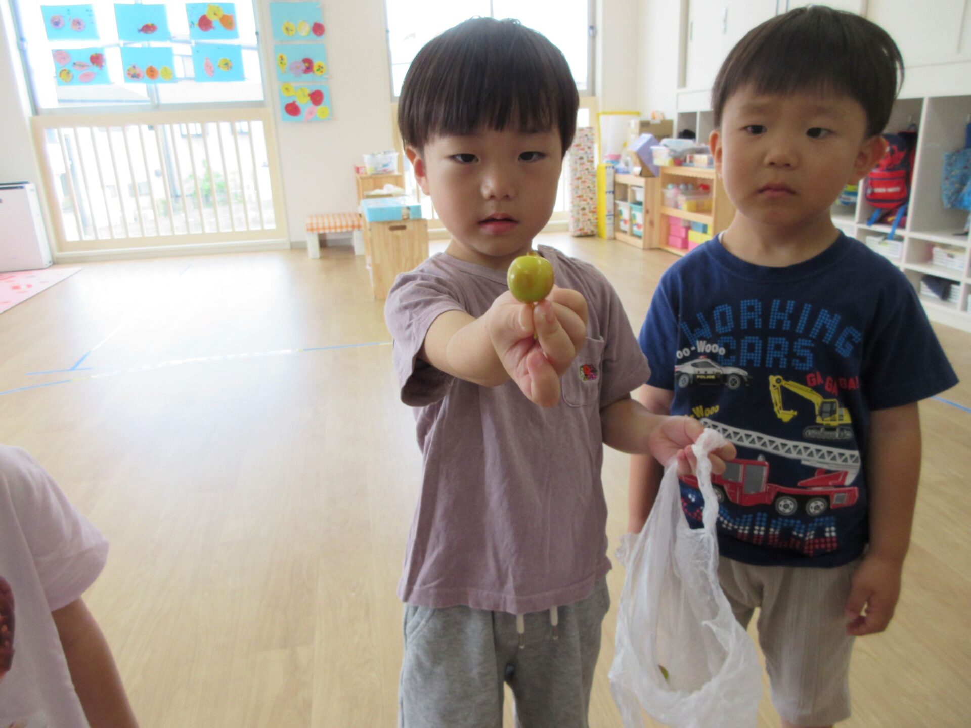 3歳にじ組は、園庭で丸い木の実がなっているのを見つけました。「これは何だろう?」みんなで、話をしていました。
