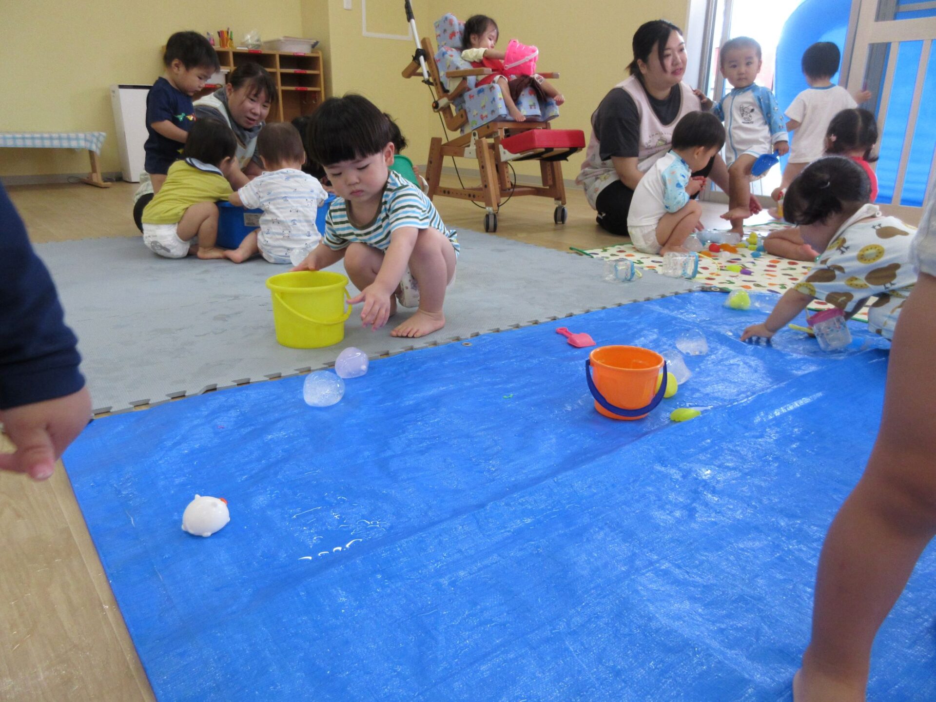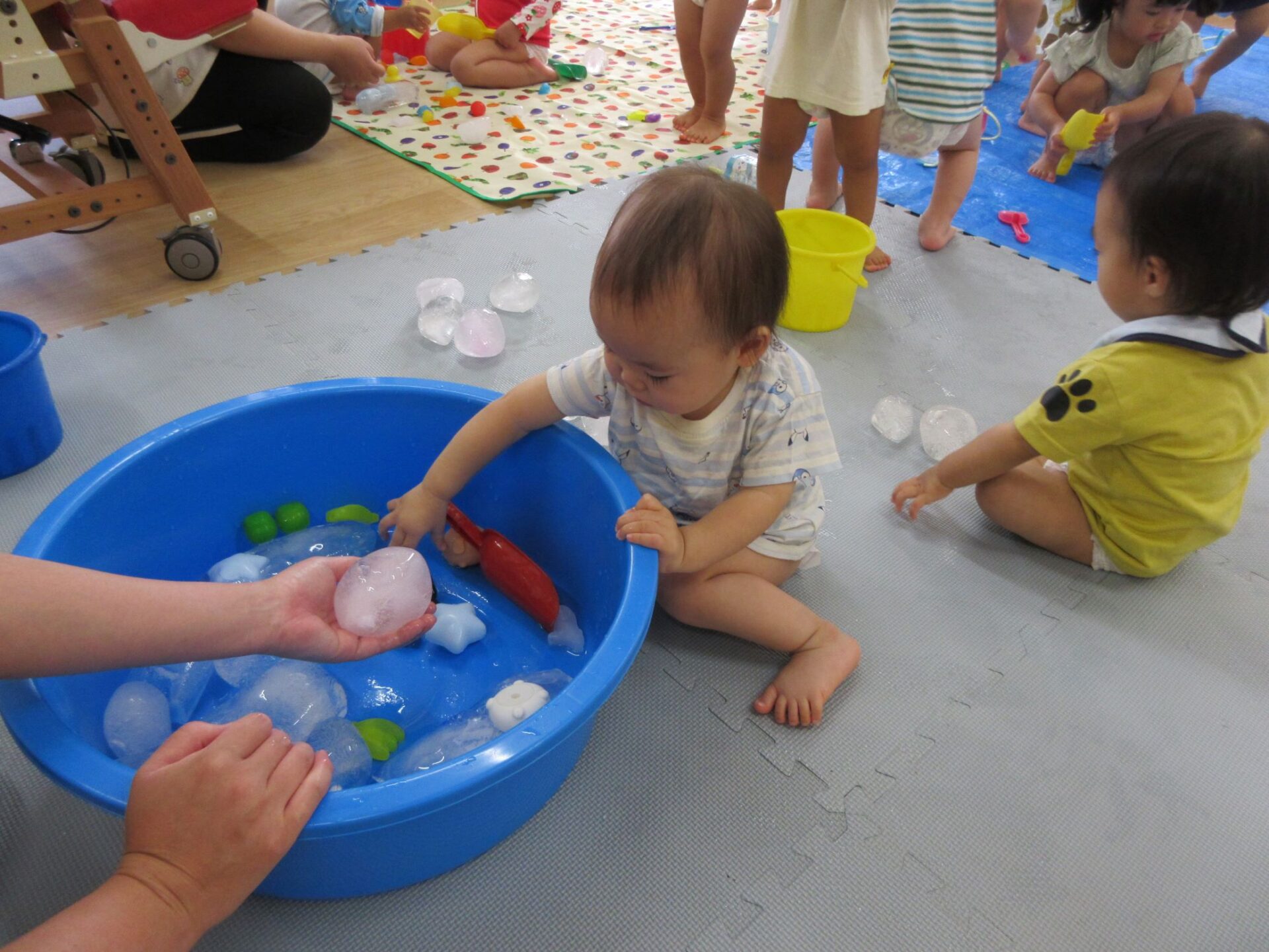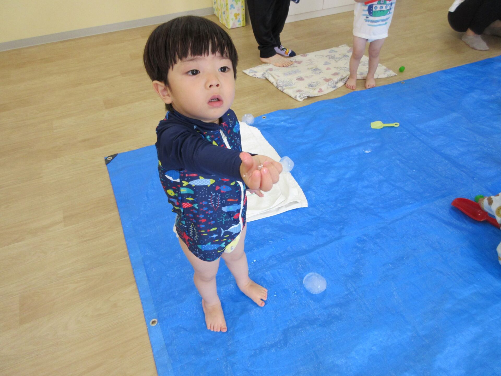 2023.08.25 お知らせ ブログ 氷あそびをしました 8月24日、1歳だいち組は「氷遊び」をしました。先生が、大きな氷を出してくれました。 つるつるしていて、とても冷たくて、気持ちいい。 いろんな形の冷たいおもちゃも出てきました。 楽しそうですね。 「どうぞ」 ひっぱりあっているのかな。 一覧へ戻る