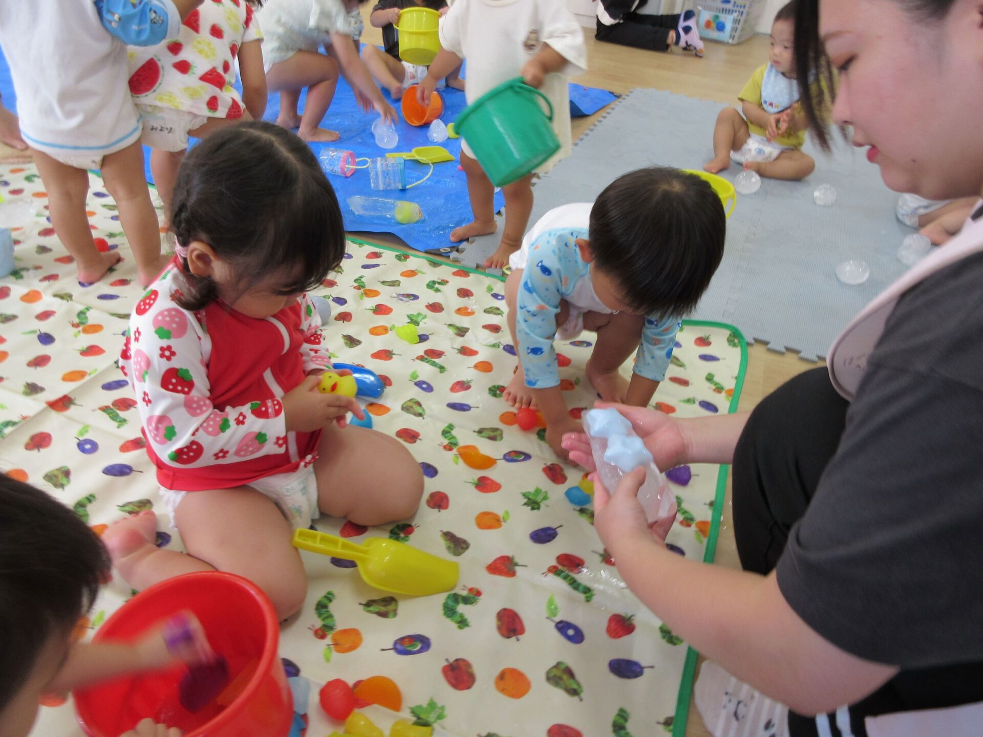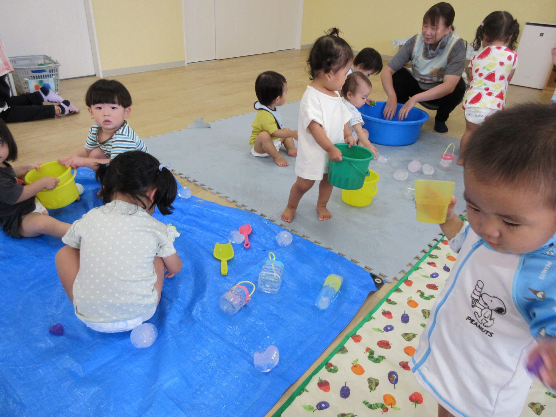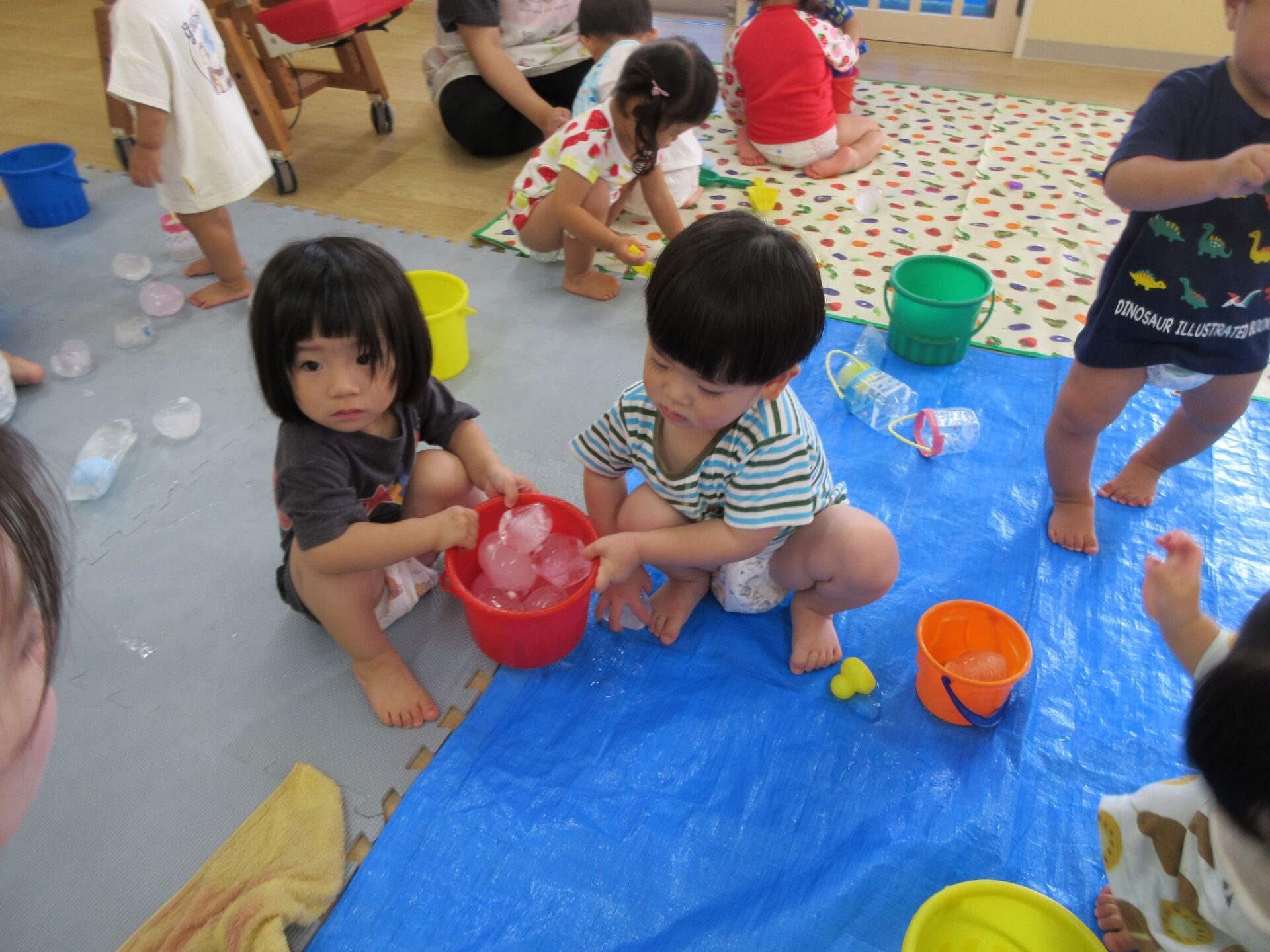 2023.08.25 お知らせ ブログ 氷あそびをしました 8月24日、1歳だいち組は「氷遊び」をしました。先生が、大きな氷を出してくれました。 つるつるしていて、とても冷たくて、気持ちいい。 いろんな形の冷たいおもちゃも出てきました。 楽しそうですね。 「どうぞ」 ひっぱりあっているのかな。 一覧へ戻る