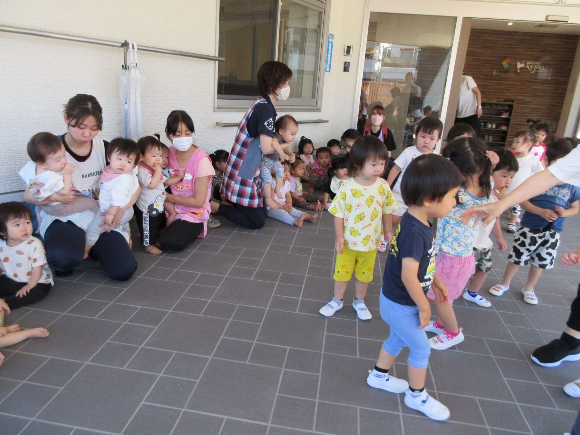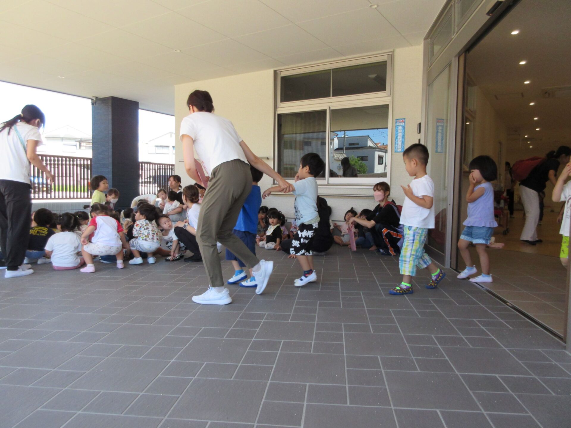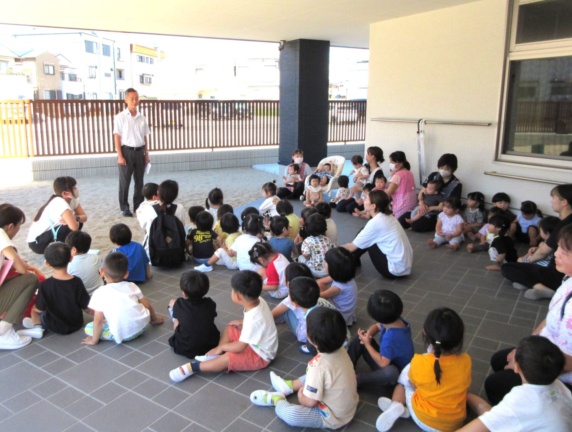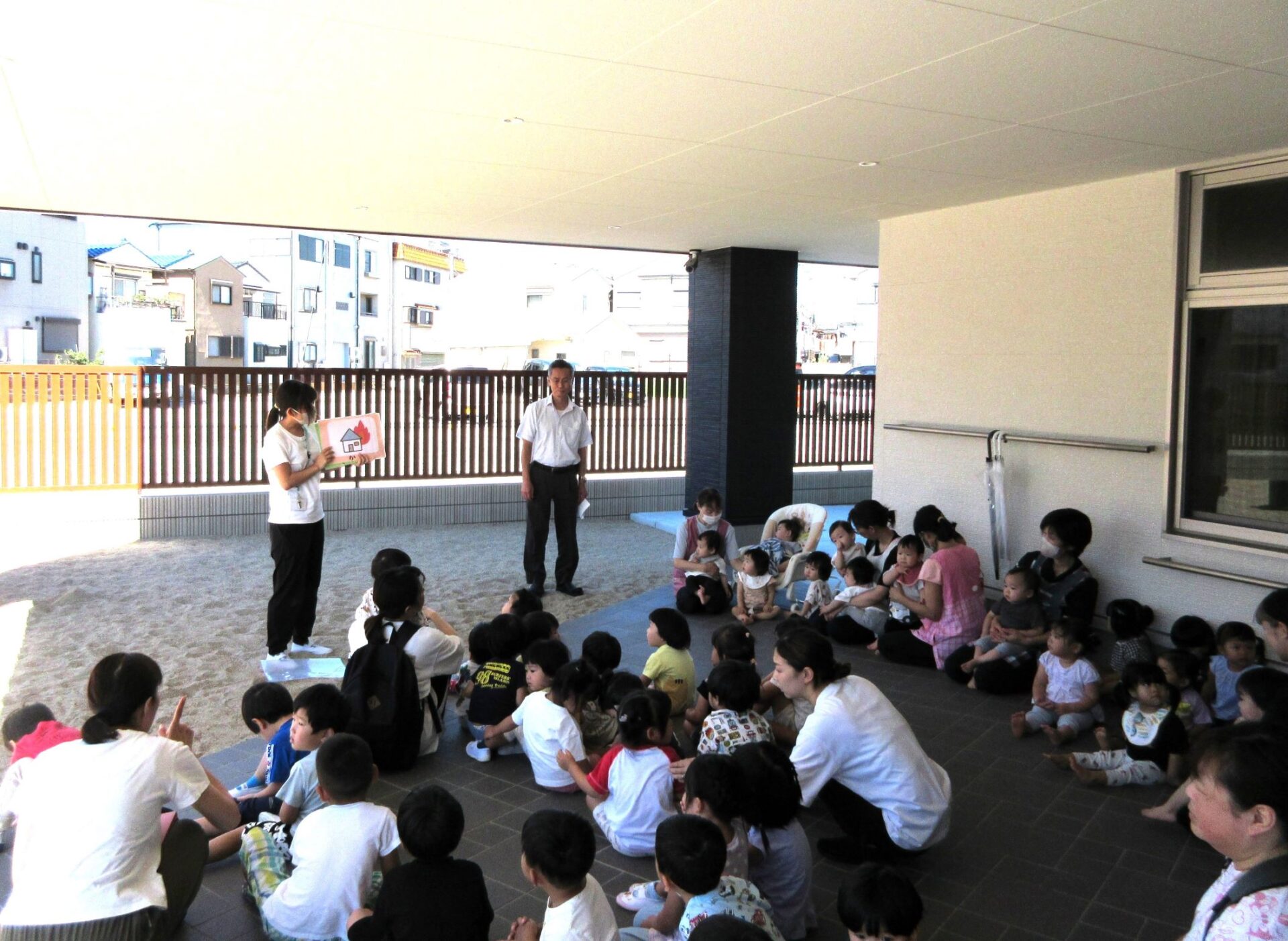 今回の想定は、火災です。暑さ対策のため、集合場所を玄関前の日陰のところにしています。よく遊んでいる砂場の前になります。