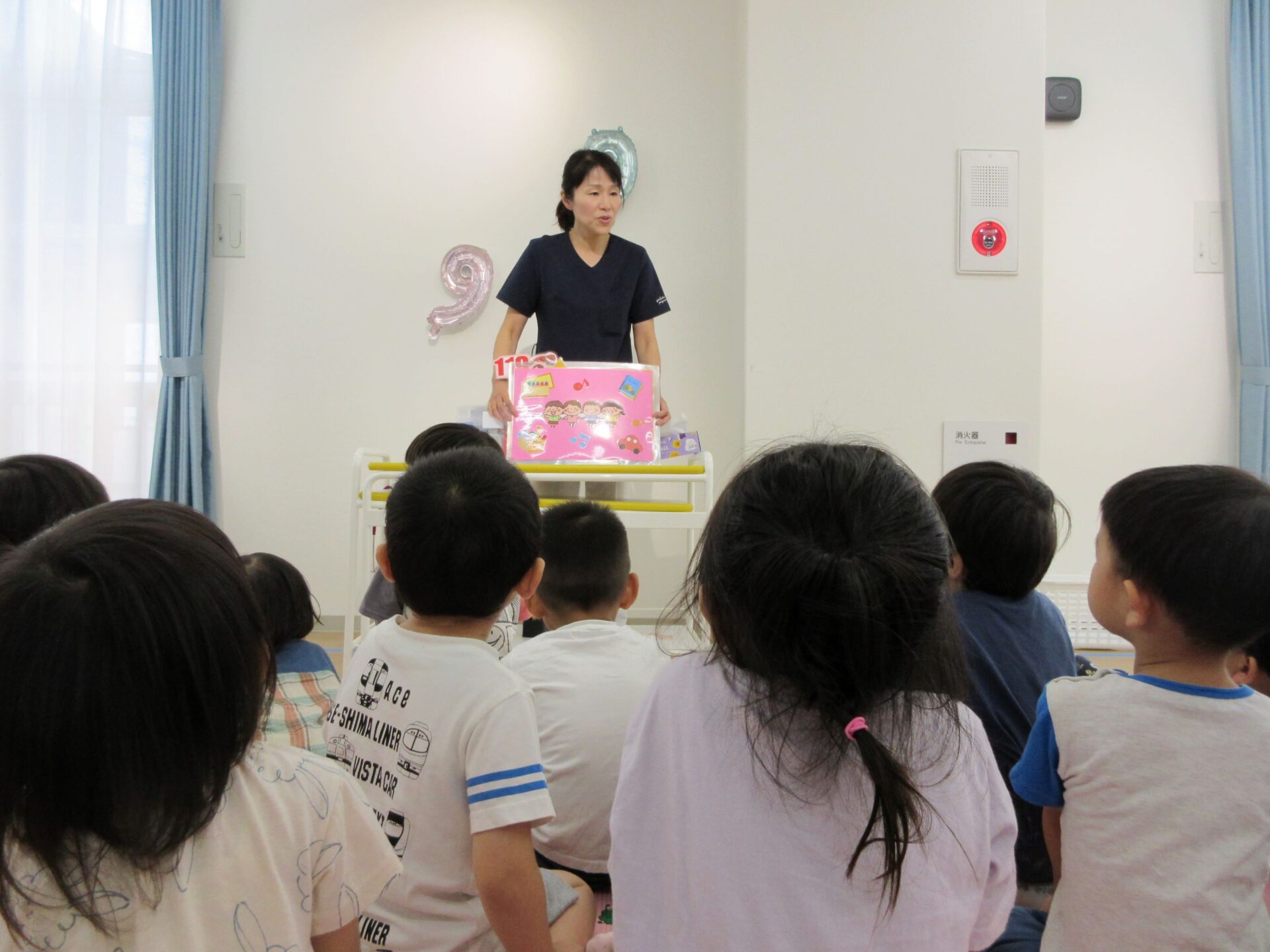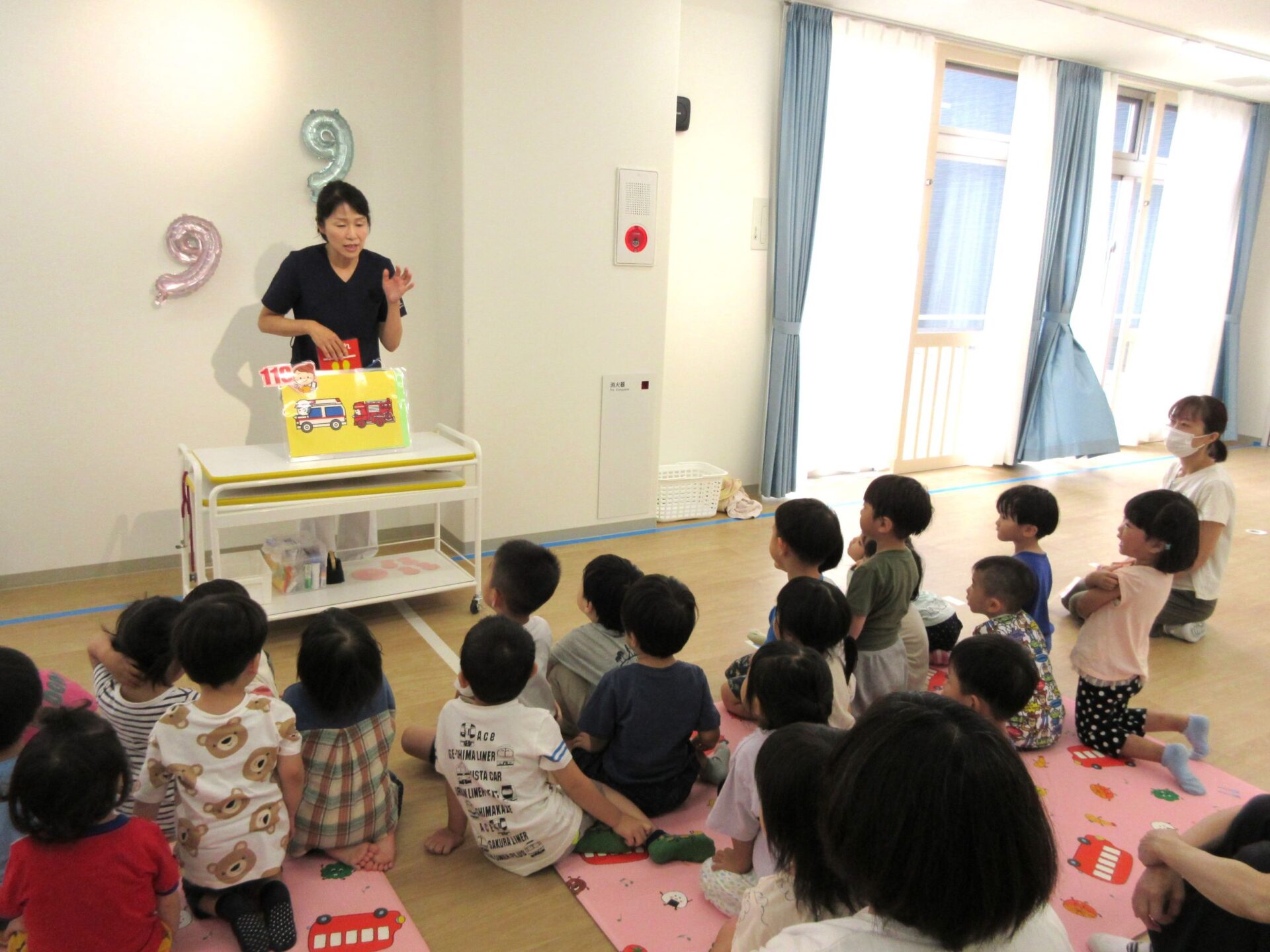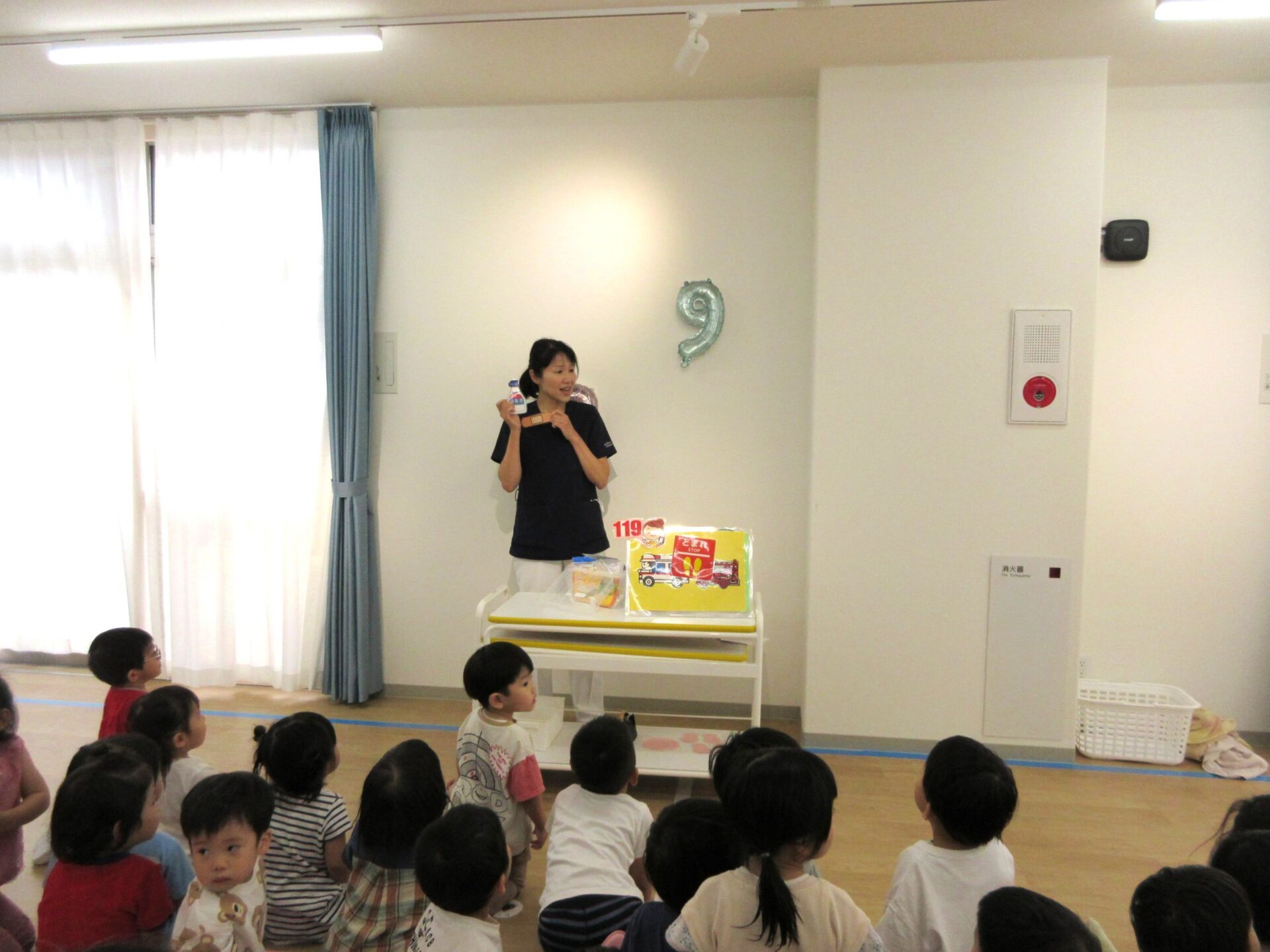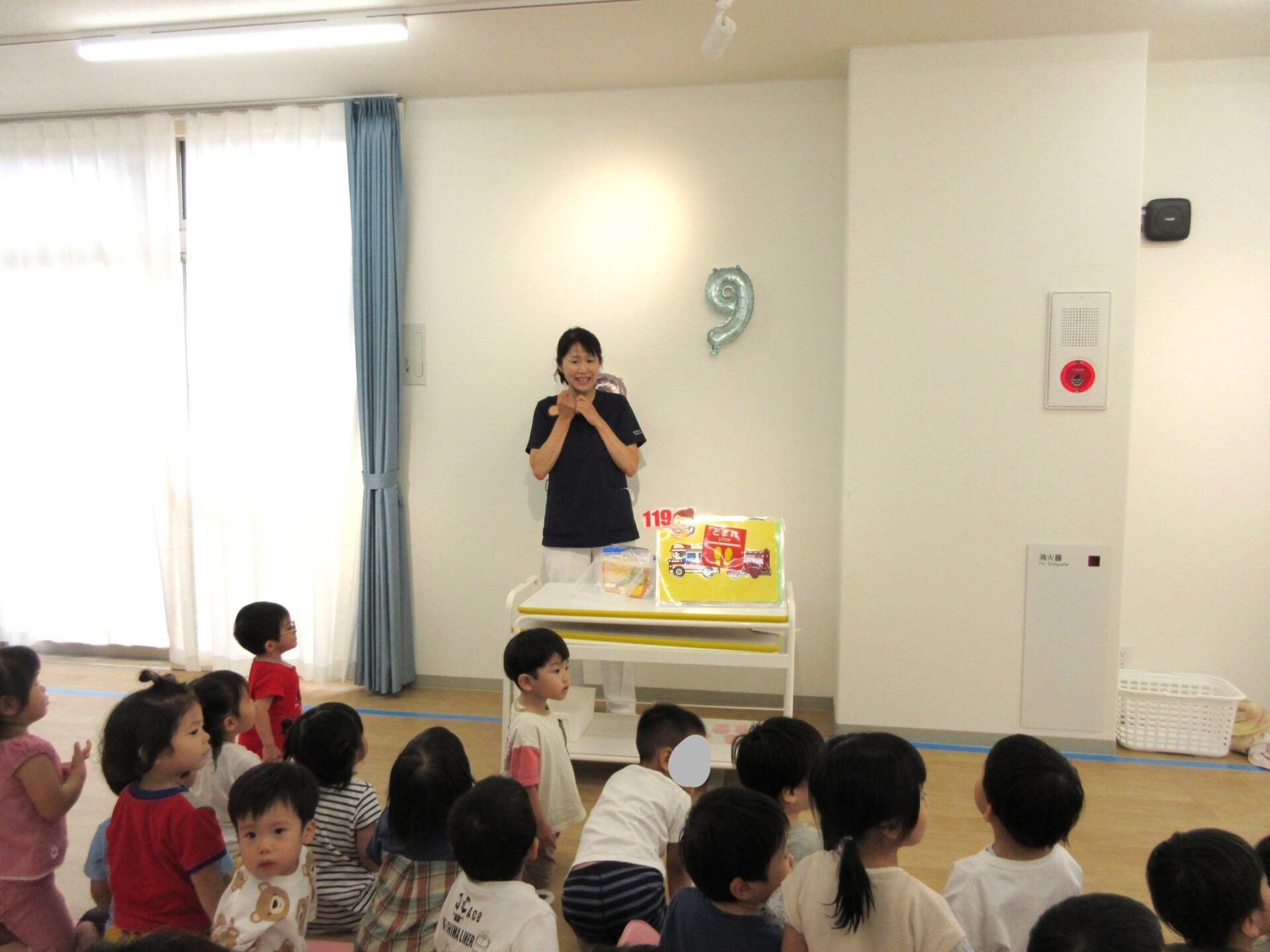 2023.09.08 お知らせ ブログ 救急の日のお話 9月7日、2階のランチルームに2歳あめ組と3歳にじ組が集まり、看護師の金松先生からお話を聞きました。9月9日の救急の日に合わせて、保健のこと、しんどくなった時、けがをした時のお話もしてもらいました。 自称「演技派女優」という金松先生は、豊かな表情とわかりやすい説明、迫真の表現力で、お話しています。 「わっ、ゆきこ先生の指から血が出てる~!」 見ていた先生たちは、「あっ、仕込んでたのか。」(事前に打ち合わせして、シナリオができていたのか。) 「こんな時は、金松先生が手当てしますね。」 しんどくなった人がいるようです。(先生たちは、心の中で、「もう一人、仕込んでたのか・・。」) こどもたちは、すごく集中して聞いています。 (先生が出てきて、壁にぶつかって、こちらを向くと・・。)金松「えつこ先生の鼻から血が出てる~!」 こちらも迫真の演技。 みんな夢中で聞いています。 「みんながしんどくなった時やけがをした時は、金松先生もがんばるぞ!」 終わった後のこどもたちからは、「たのしかった!」、「明日もやってほしい!」という声が聞こえてきました。 一覧へ戻る