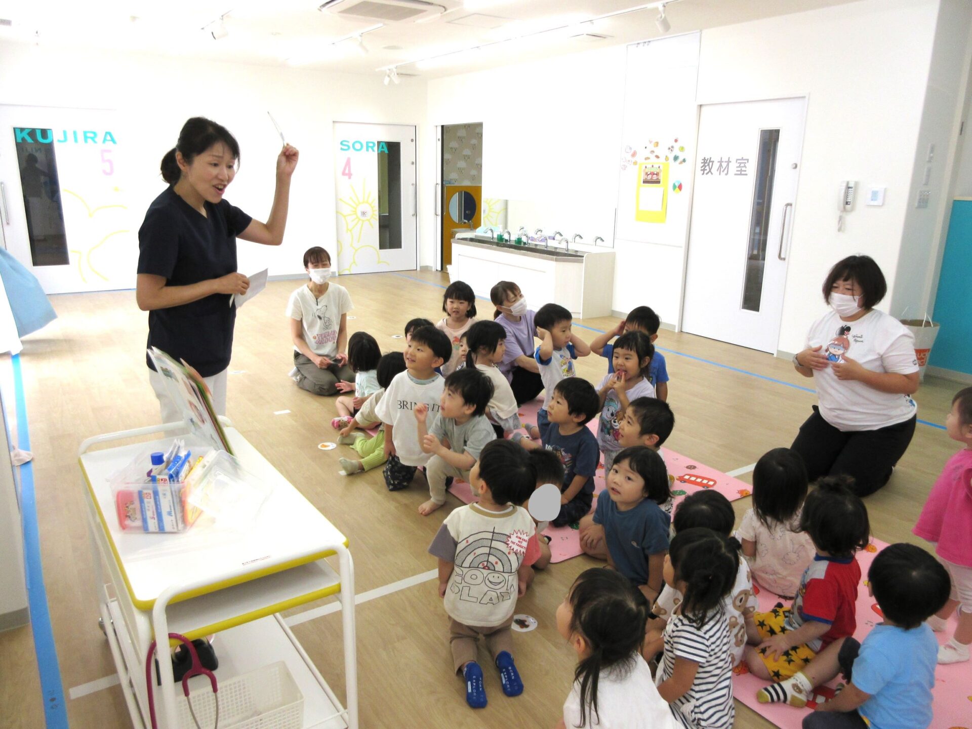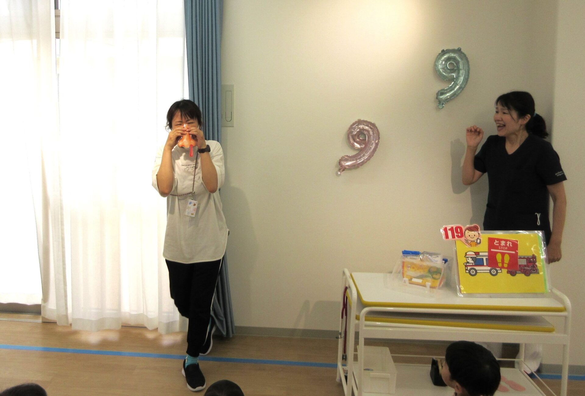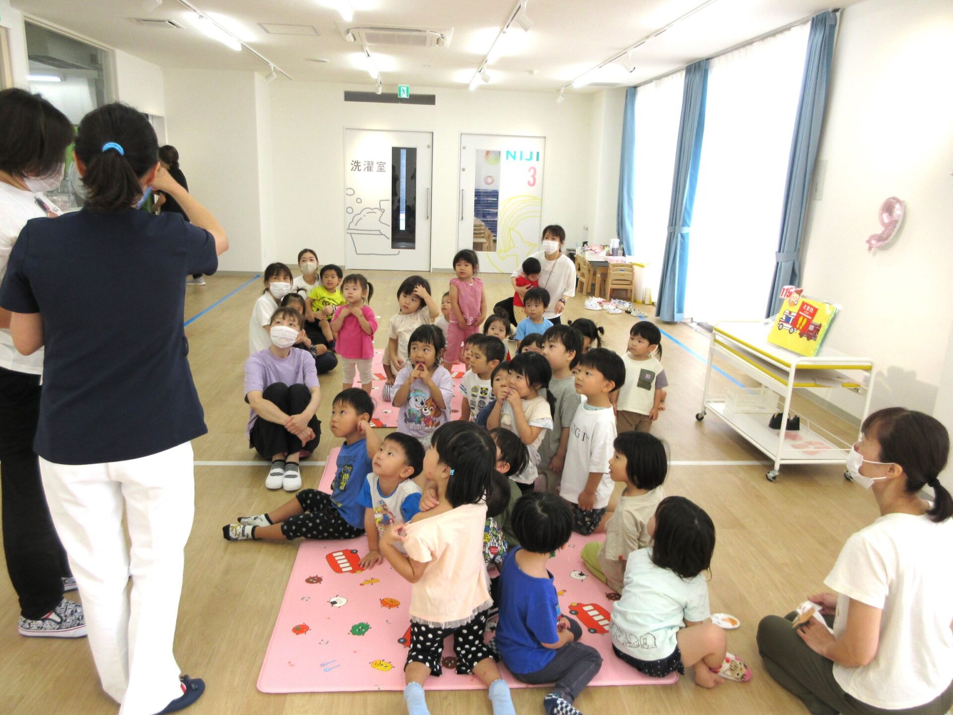 2023.09.08 お知らせ ブログ 救急の日のお話 9月7日、2階のランチルームに2歳あめ組と3歳にじ組が集まり、看護師の金松先生からお話を聞きました。9月9日の救急の日に合わせて、保健のこと、しんどくなった時、けがをした時のお話もしてもらいました。 自称「演技派女優」という金松先生は、豊かな表情とわかりやすい説明、迫真の表現力で、お話しています。 「わっ、ゆきこ先生の指から血が出てる~!」 見ていた先生たちは、「あっ、仕込んでたのか。」(事前に打ち合わせして、シナリオができていたのか。) 「こんな時は、金松先生が手当てしますね。」 しんどくなった人がいるようです。(先生たちは、心の中で、「もう一人、仕込んでたのか・・。」) こどもたちは、すごく集中して聞いています。 (先生が出てきて、壁にぶつかって、こちらを向くと・・。)金松「えつこ先生の鼻から血が出てる~!」 こちらも迫真の演技。 みんな夢中で聞いています。 「みんながしんどくなった時やけがをした時は、金松先生もがんばるぞ!」 終わった後のこどもたちからは、「たのしかった!」、「明日もやってほしい!」という声が聞こえてきました。 一覧へ戻る