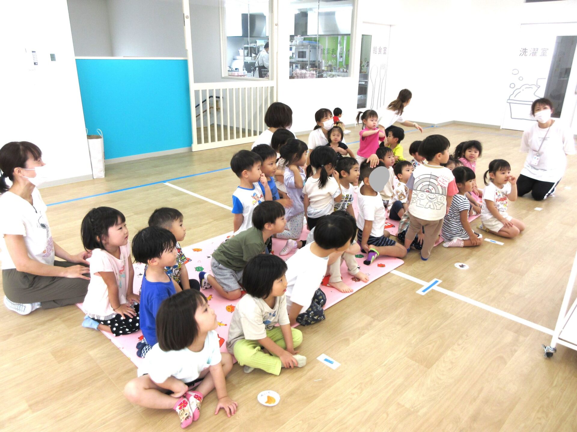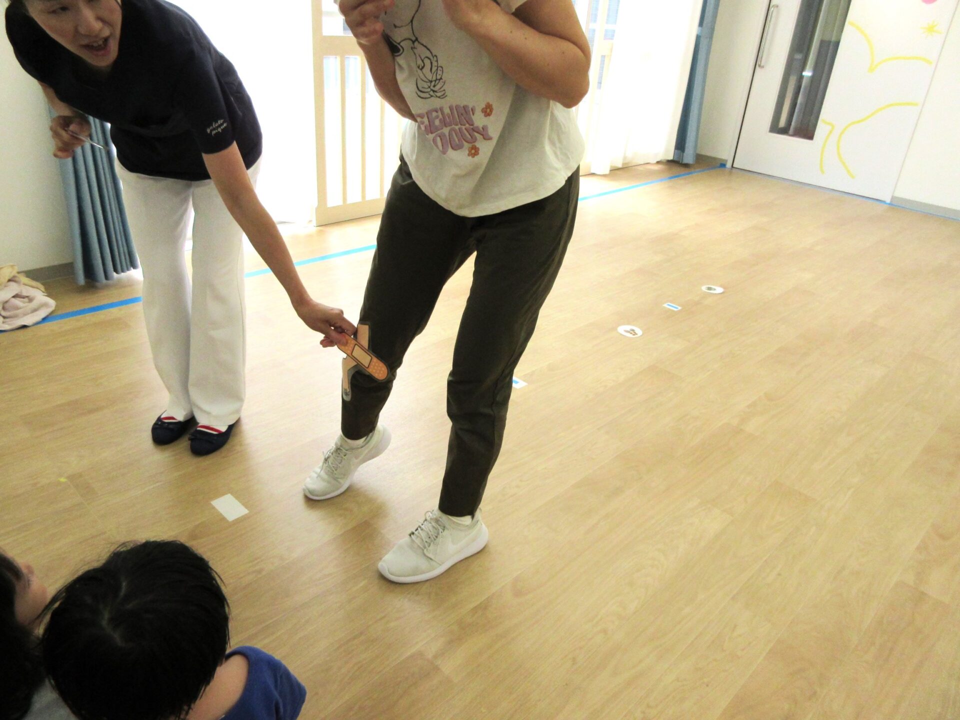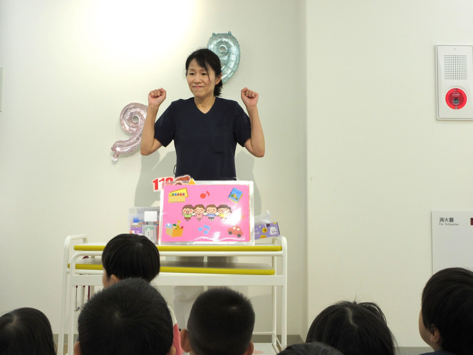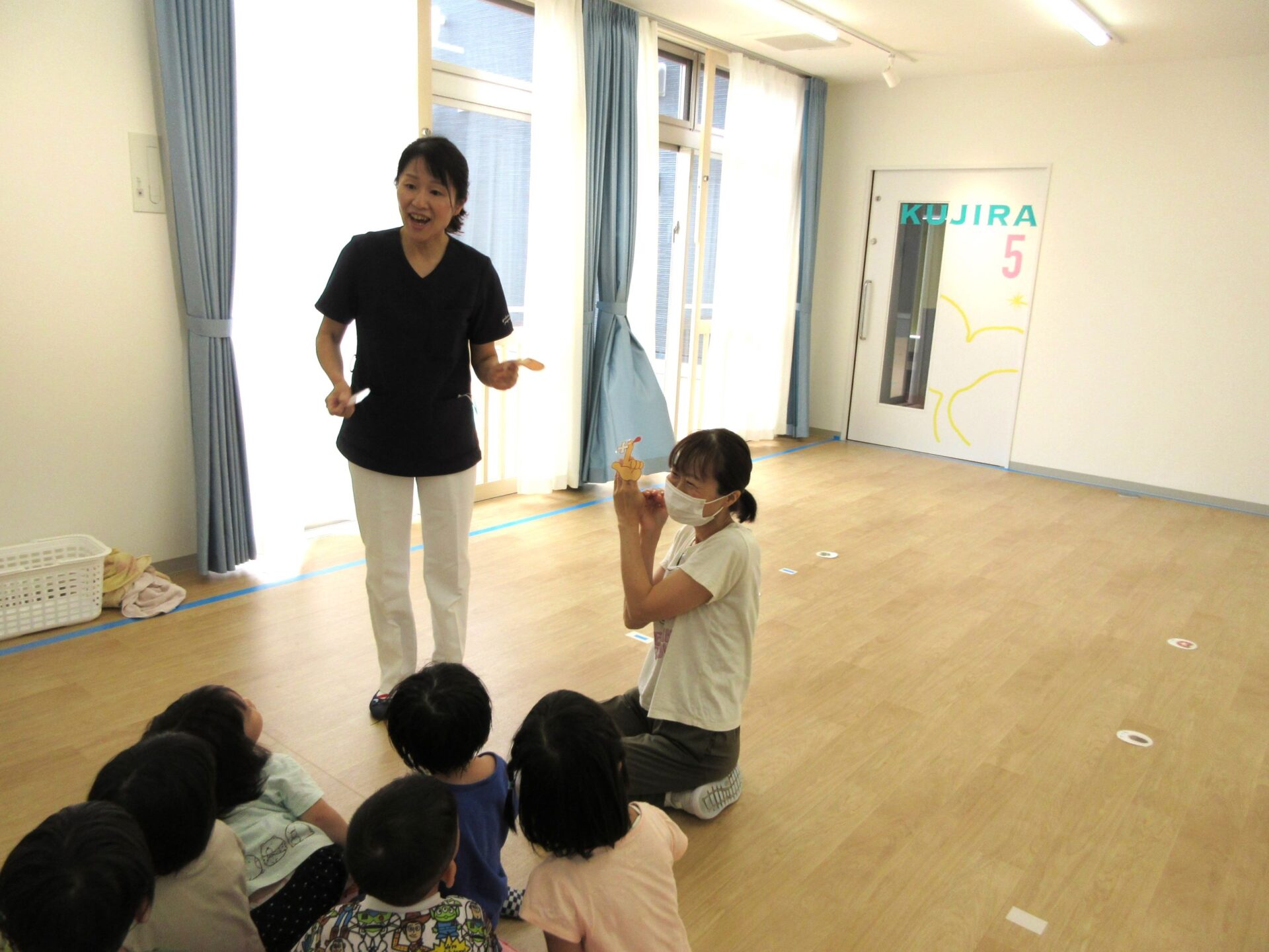 2023.09.08 お知らせ ブログ 救急の日のお話 9月7日、2階のランチルームに2歳あめ組と3歳にじ組が集まり、看護師の金松先生からお話を聞きました。9月9日の救急の日に合わせて、保健のこと、しんどくなった時、けがをした時のお話もしてもらいました。 自称「演技派女優」という金松先生は、豊かな表情とわかりやすい説明、迫真の表現力で、お話しています。 「わっ、ゆきこ先生の指から血が出てる~!」 見ていた先生たちは、「あっ、仕込んでたのか。」(事前に打ち合わせして、シナリオができていたのか。) 「こんな時は、金松先生が手当てしますね。」 しんどくなった人がいるようです。(先生たちは、心の中で、「もう一人、仕込んでたのか・・。」) こどもたちは、すごく集中して聞いています。 (先生が出てきて、壁にぶつかって、こちらを向くと・・。)金松「えつこ先生の鼻から血が出てる~!」 こちらも迫真の演技。 みんな夢中で聞いています。 「みんながしんどくなった時やけがをした時は、金松先生もがんばるぞ!」 終わった後のこどもたちからは、「たのしかった!」、「明日もやってほしい!」という声が聞こえてきました。 一覧へ戻る