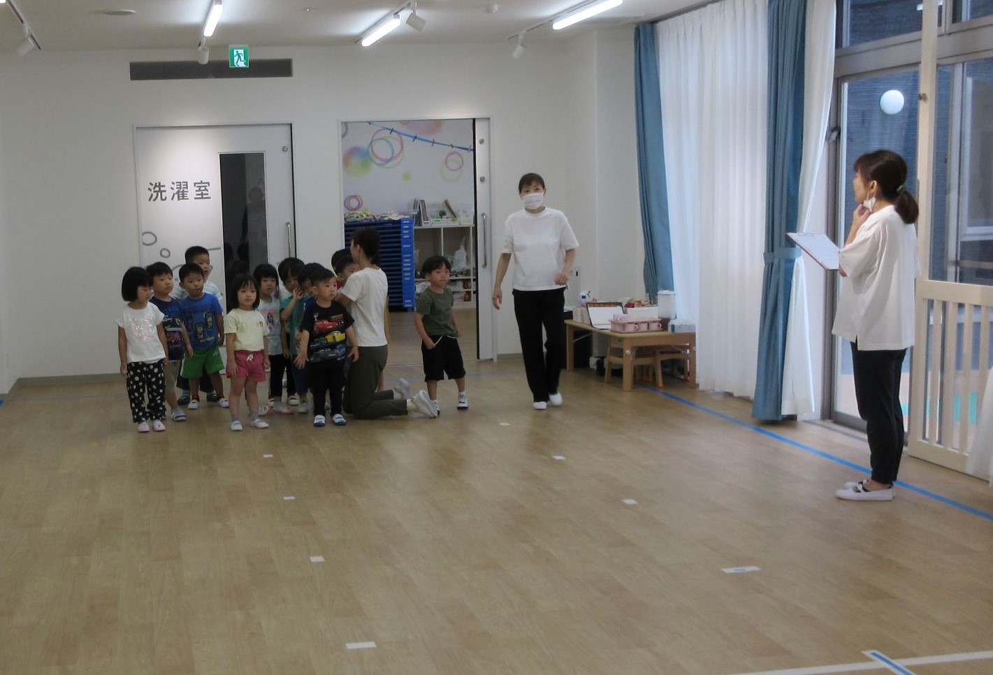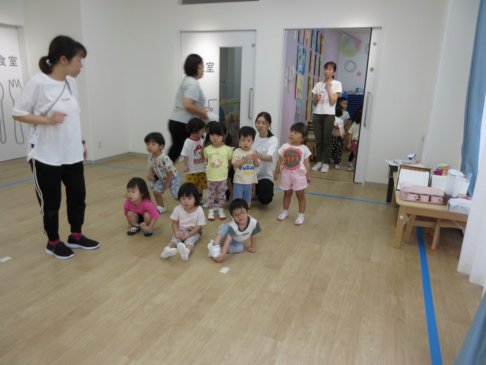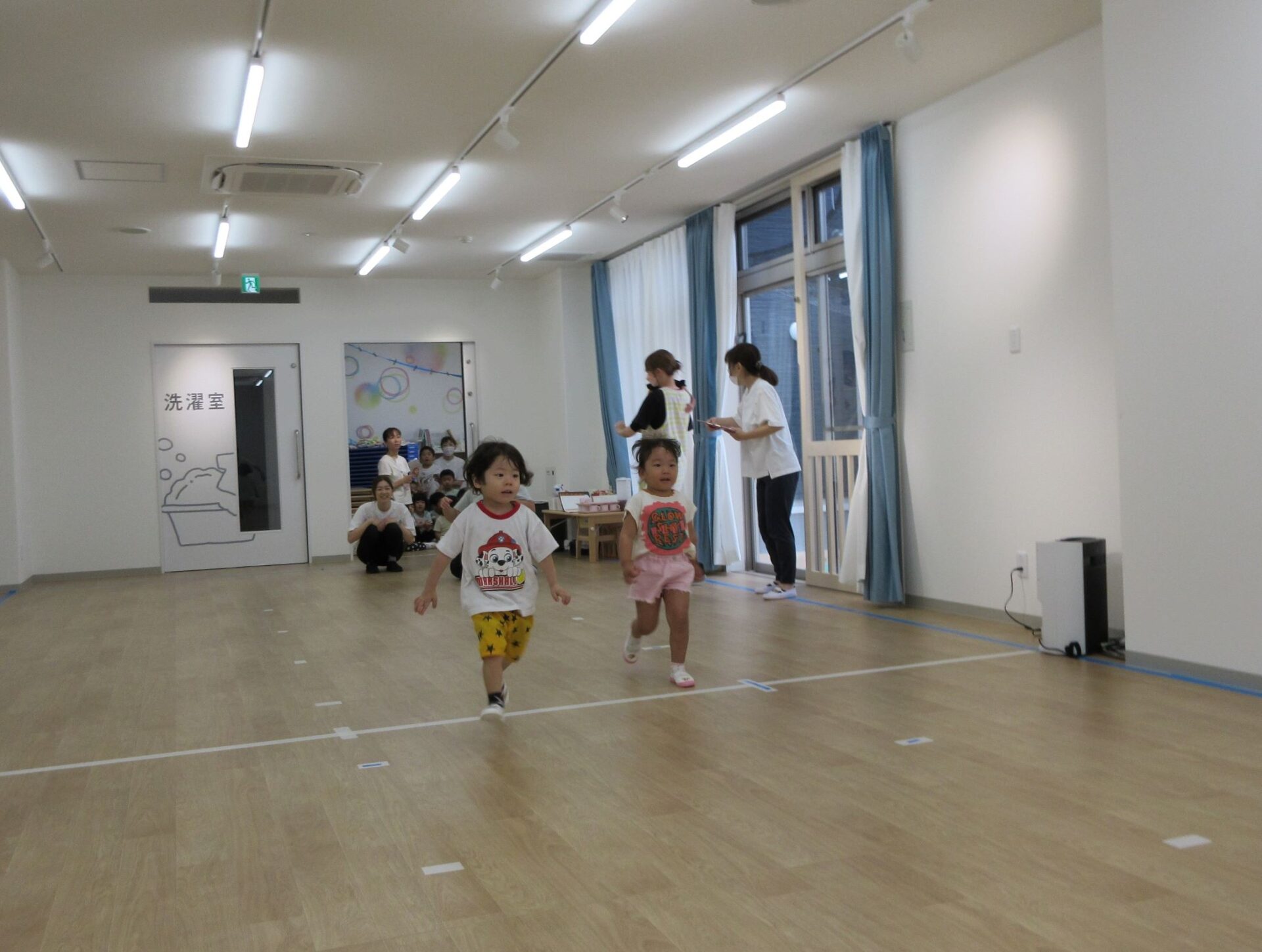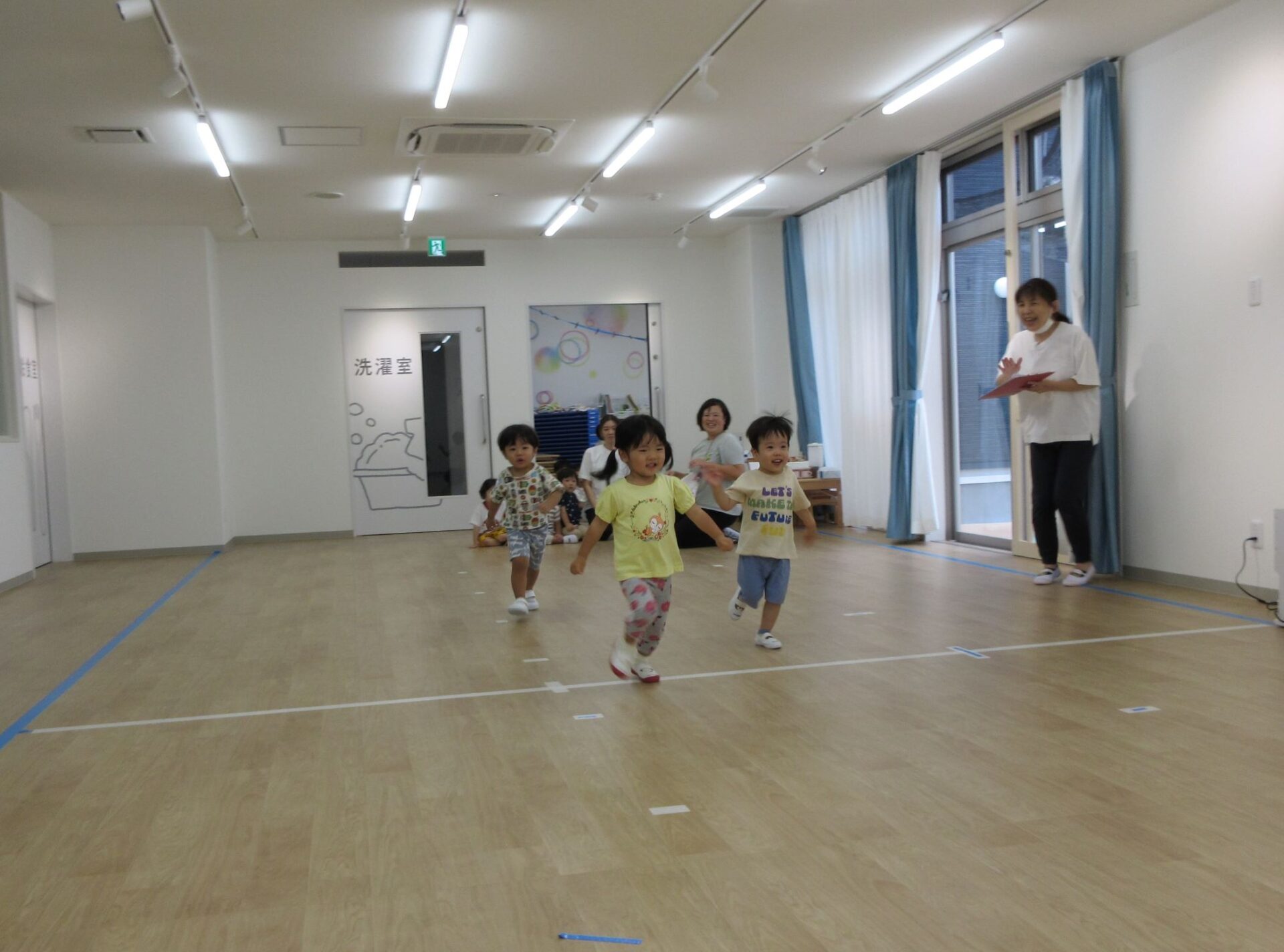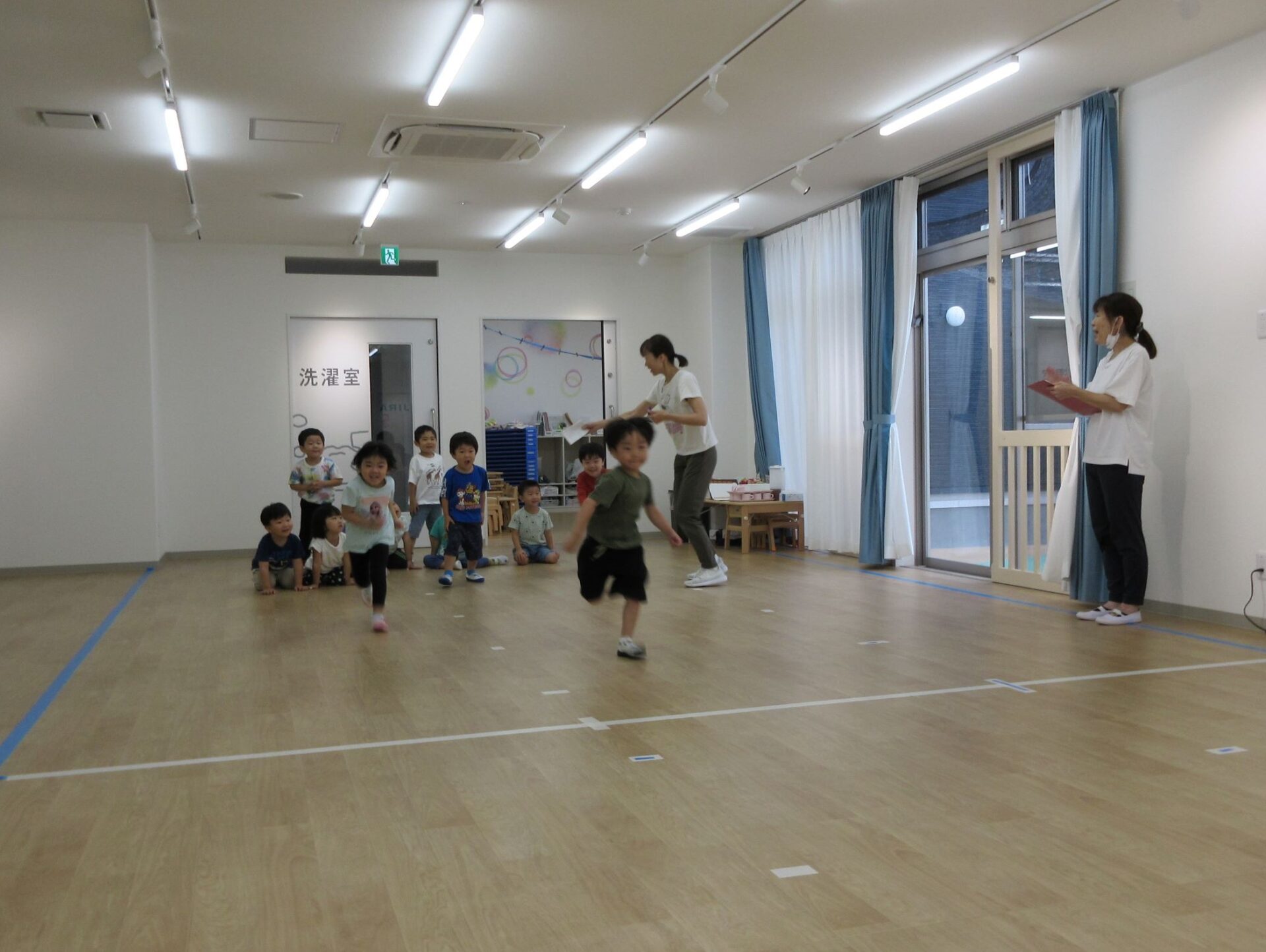 2023.09.13 お知らせ ブログ かけっこ 9月11日、運動会の練習で「かけっこ」をしました。練習場所は、2階のランチルーム。まず、2歳あめ組のスタート前です。 「位置について」、「よーい」、「ピッ」。笛の合図でスタートします。 はじめは、合図に合わせてスタートするのも難しいです。 次は、3歳にじ組がスタート位置に集合しました。 一生懸命、がんばっています。 運動会まで限られた期間ですが、楽しく練習します。 一覧へ戻る