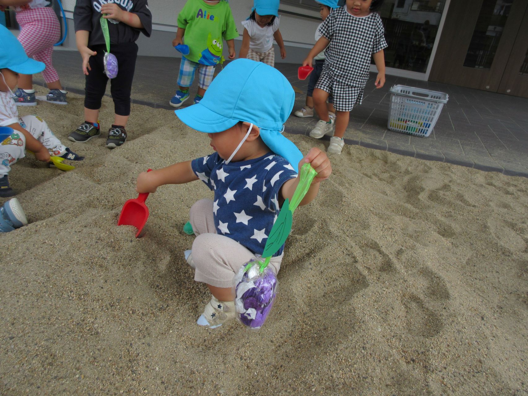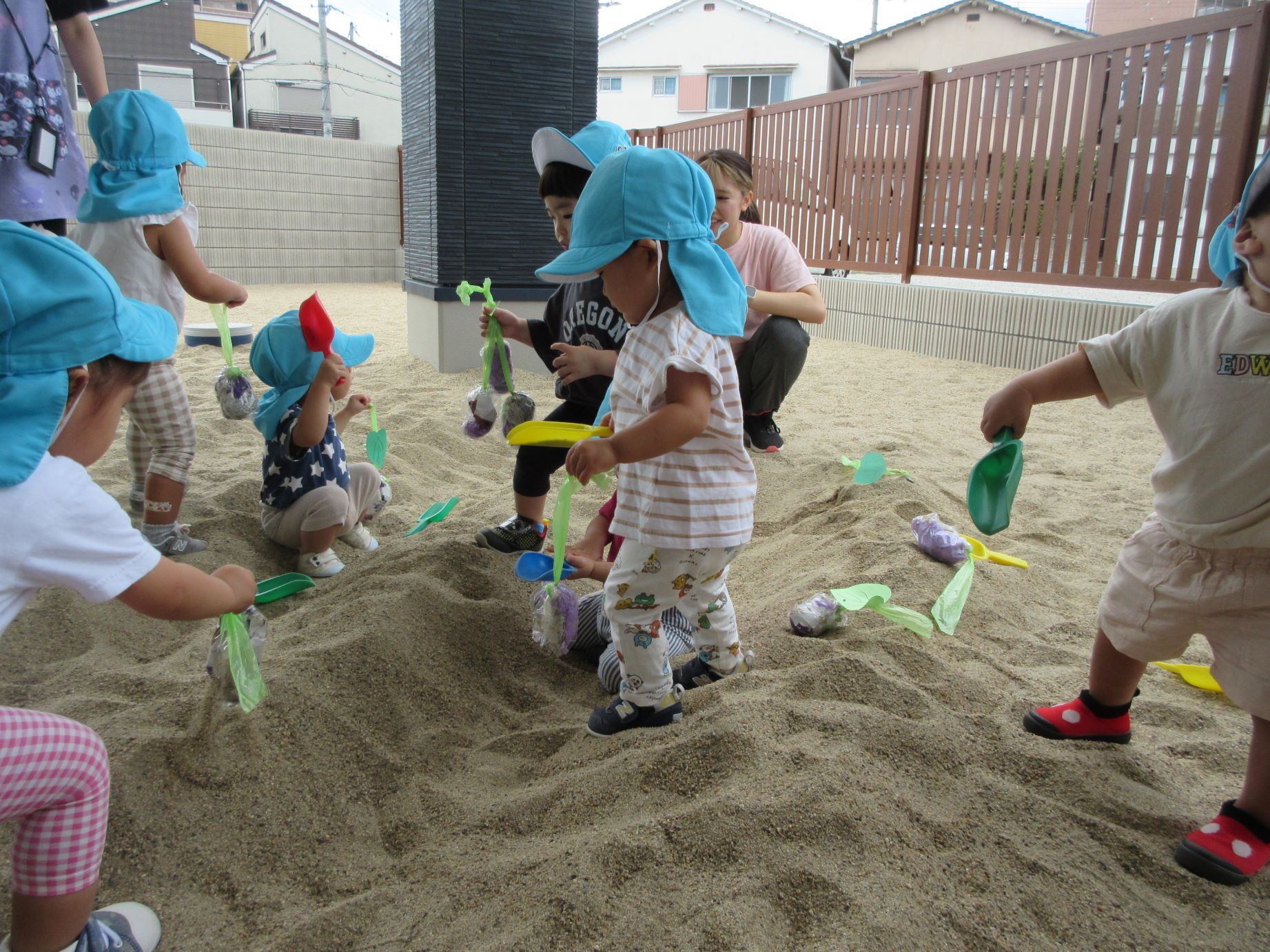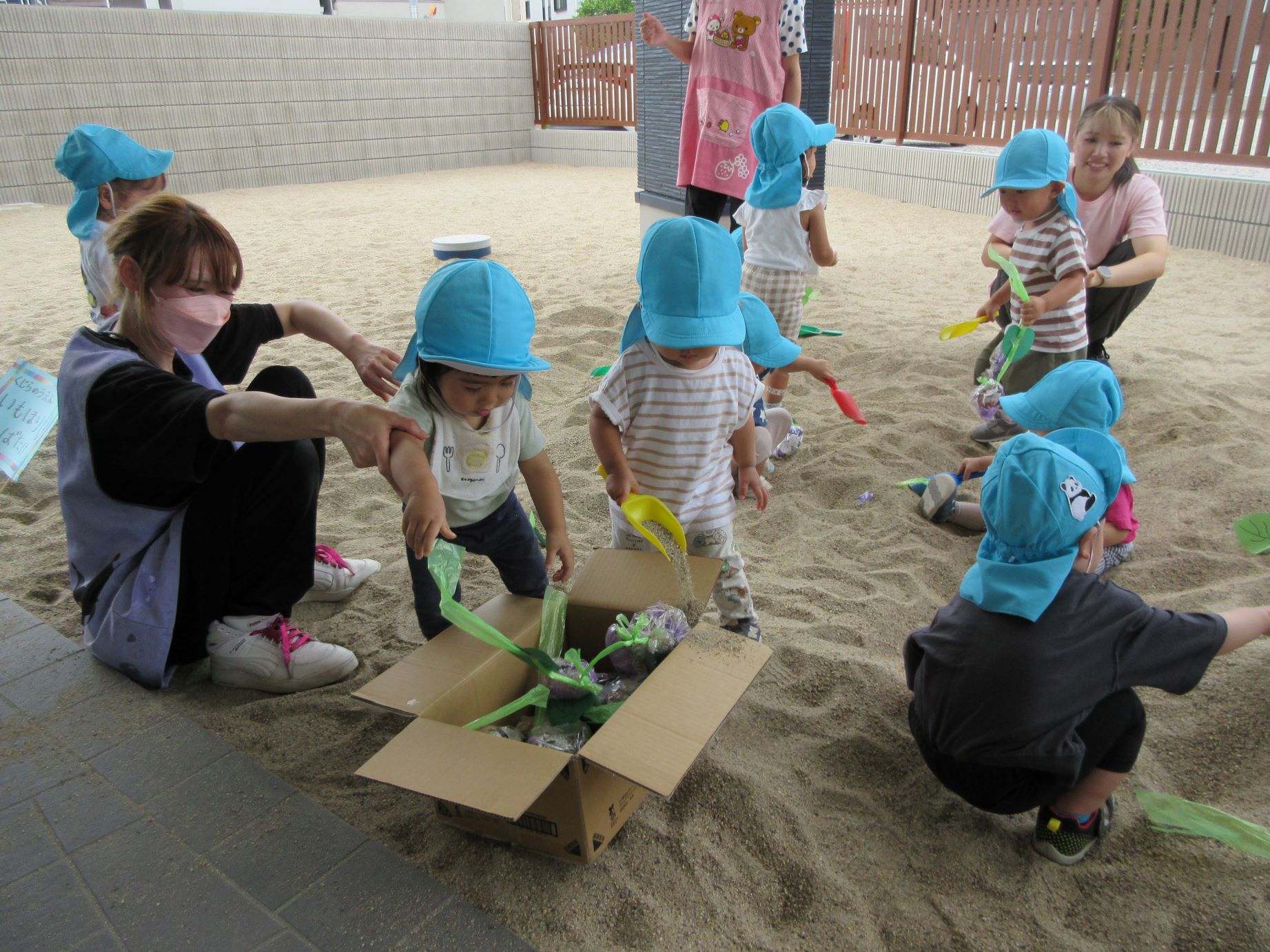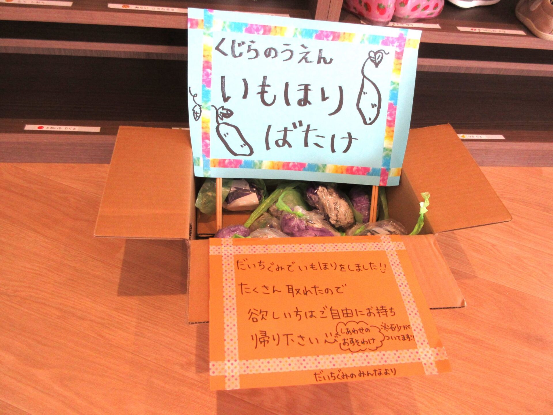 2023.09.14 お知らせ ブログ いもほり(だいち組) 9月14日、園の出入り口を出たところにある砂場に、畑ができていました。「まだ、うちの園には畑がないので、芋ほりができない。」と、1歳だいち組の先生が、砂場に畑を作っていました。 少し前に自分たちが作ったさつまいもを、みんなで掘りました。 つるを引っ張ると、葉っぱもついていました。 たくさんとったよ。 これがお芋か・・。 みんな、たくさん収穫していますね。 掘っています。 ひっぱっています。 とったぞ~。 収穫したお芋が集まってきました。 楽しいお芋ほりになりました。 お昼過ぎの玄関に置いてありました。おすそわけ。 一覧へ戻る
