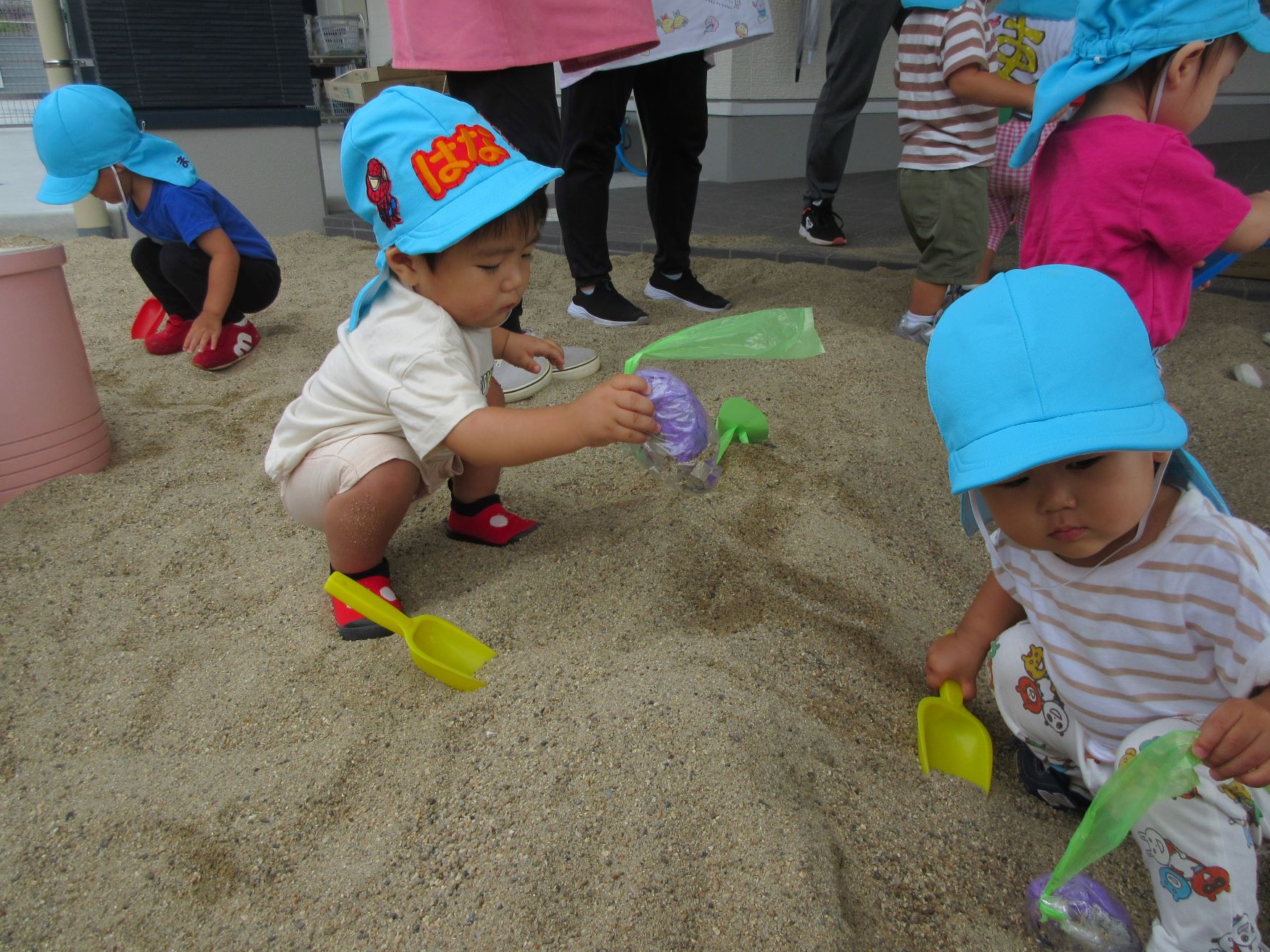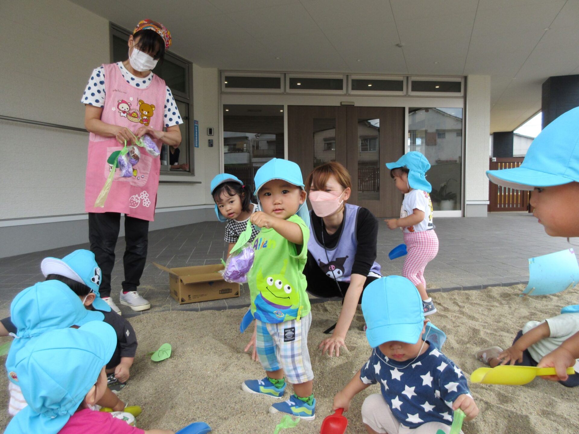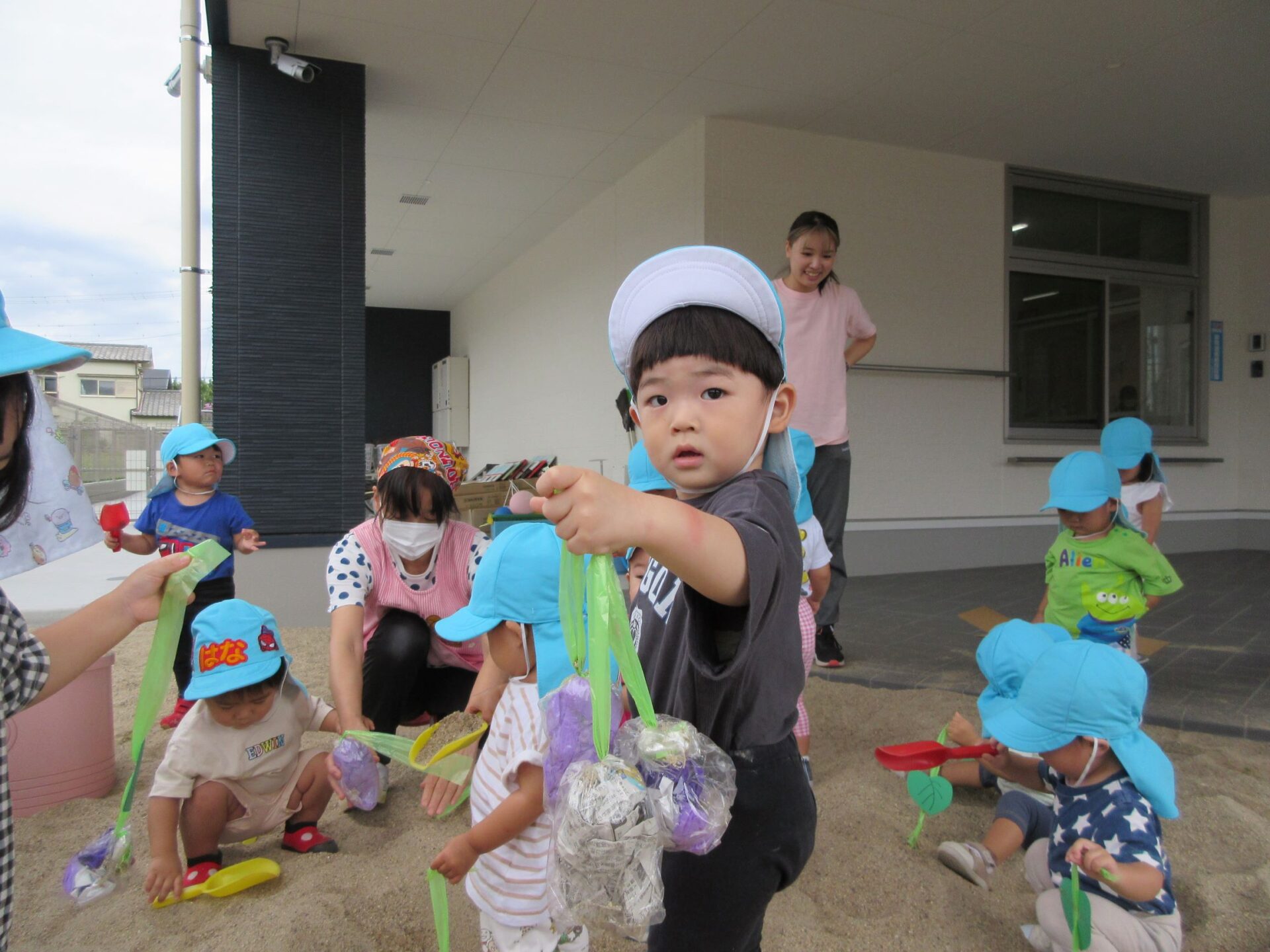 2023.09.14 お知らせ ブログ いもほり(だいち組) 9月14日、園の出入り口を出たところにある砂場に、畑ができていました。「まだ、うちの園には畑がないので、芋ほりができない。」と、1歳だいち組の先生が、砂場に畑を作っていました。 少し前に自分たちが作ったさつまいもを、みんなで掘りました。 つるを引っ張ると、葉っぱもついていました。 たくさんとったよ。 これがお芋か・・。 みんな、たくさん収穫していますね。 掘っています。 ひっぱっています。 とったぞ~。 収穫したお芋が集まってきました。 楽しいお芋ほりになりました。 お昼過ぎの玄関に置いてありました。おすそわけ。 一覧へ戻る