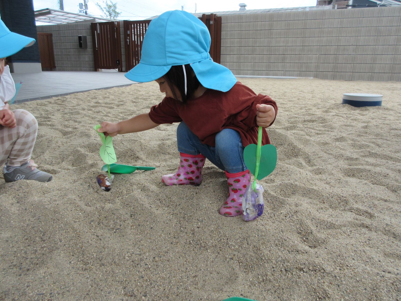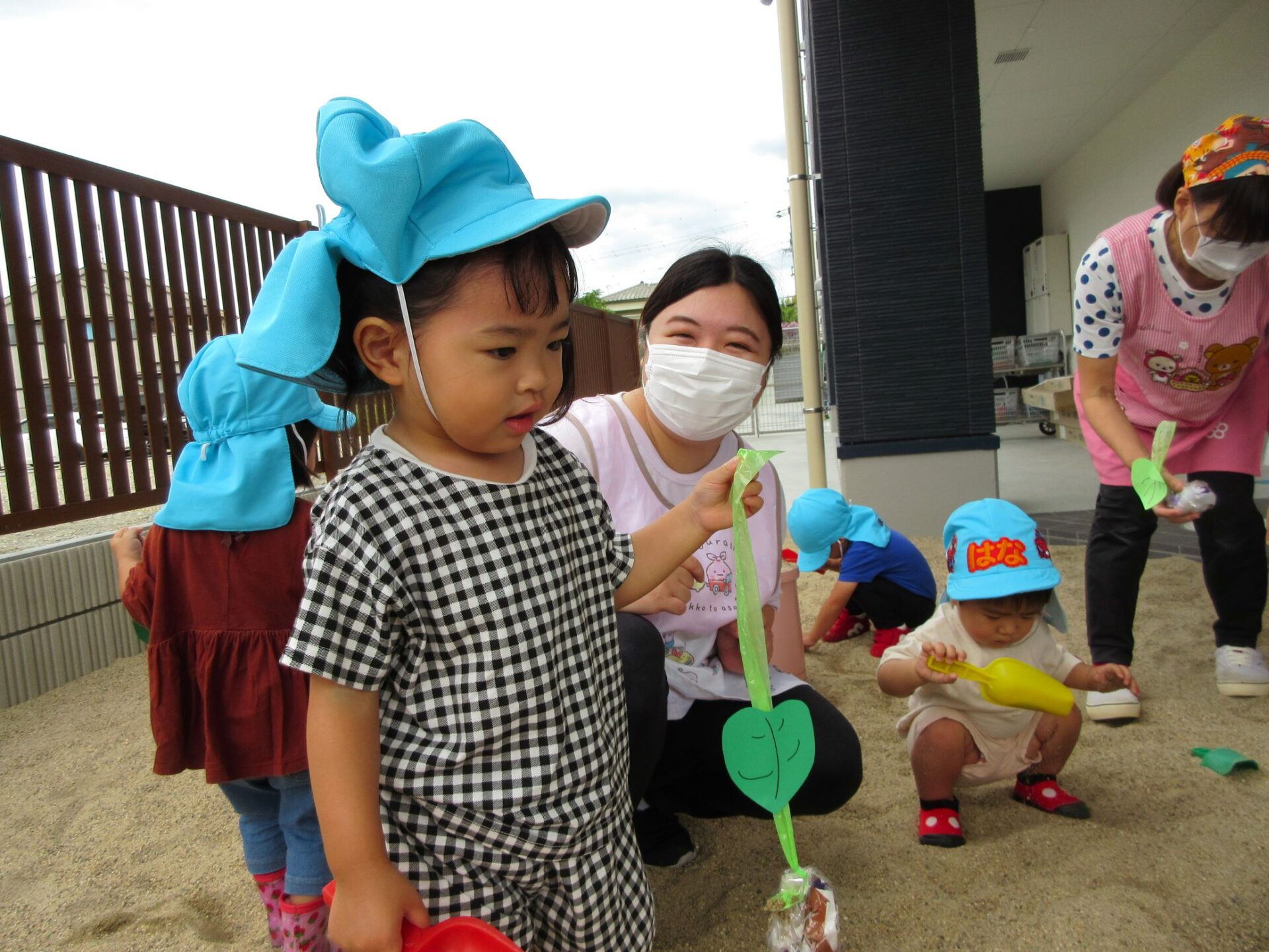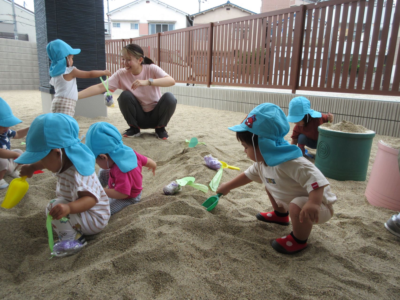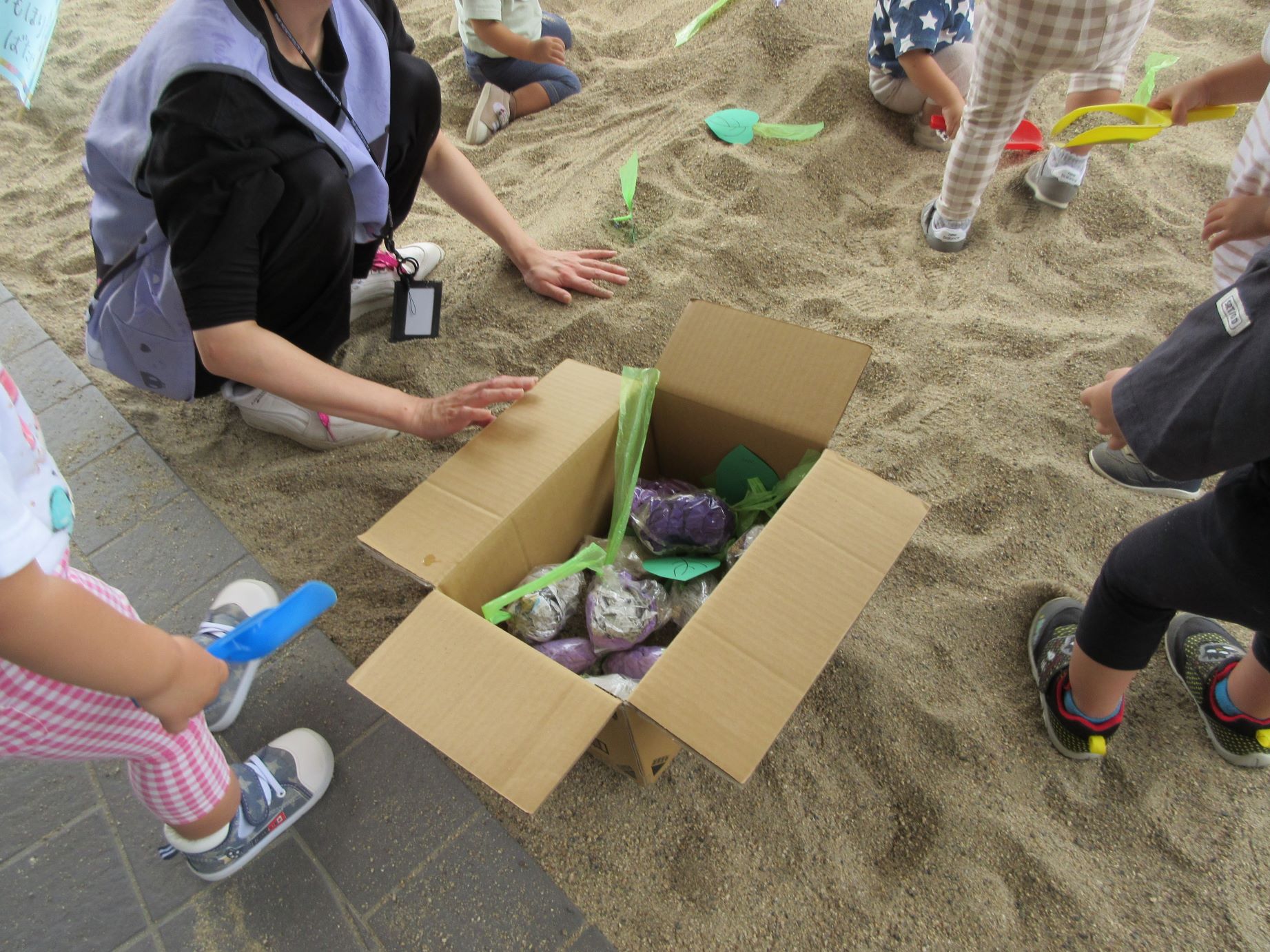 2023.09.14 お知らせ ブログ いもほり(だいち組) 9月14日、園の出入り口を出たところにある砂場に、畑ができていました。「まだ、うちの園には畑がないので、芋ほりができない。」と、1歳だいち組の先生が、砂場に畑を作っていました。 少し前に自分たちが作ったさつまいもを、みんなで掘りました。 つるを引っ張ると、葉っぱもついていました。 たくさんとったよ。 これがお芋か・・。 みんな、たくさん収穫していますね。 掘っています。 ひっぱっています。 とったぞ~。 収穫したお芋が集まってきました。 楽しいお芋ほりになりました。 お昼過ぎの玄関に置いてありました。おすそわけ。 一覧へ戻る