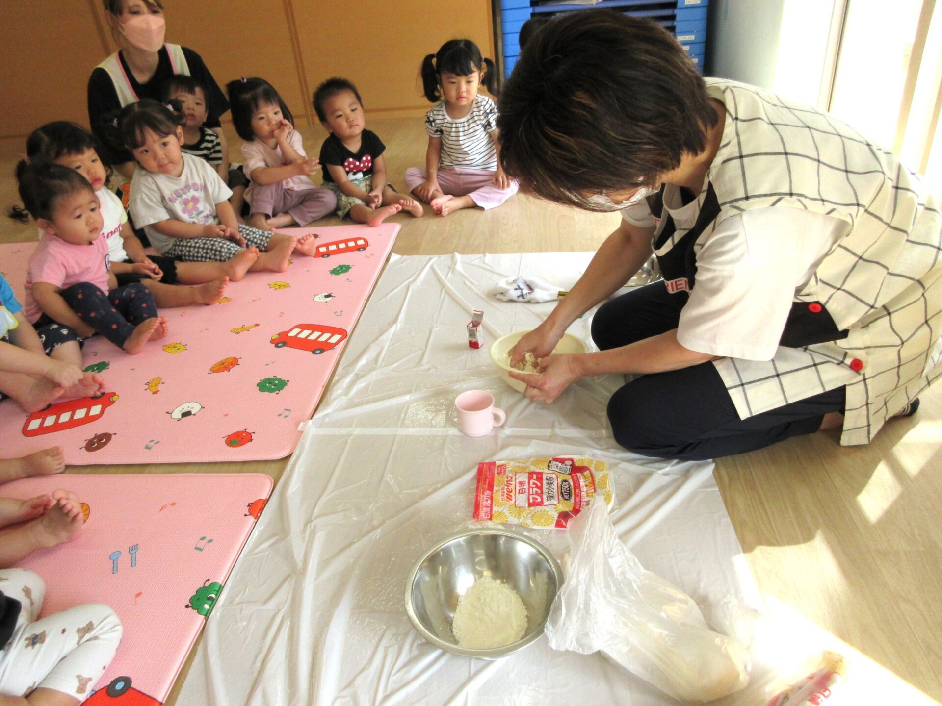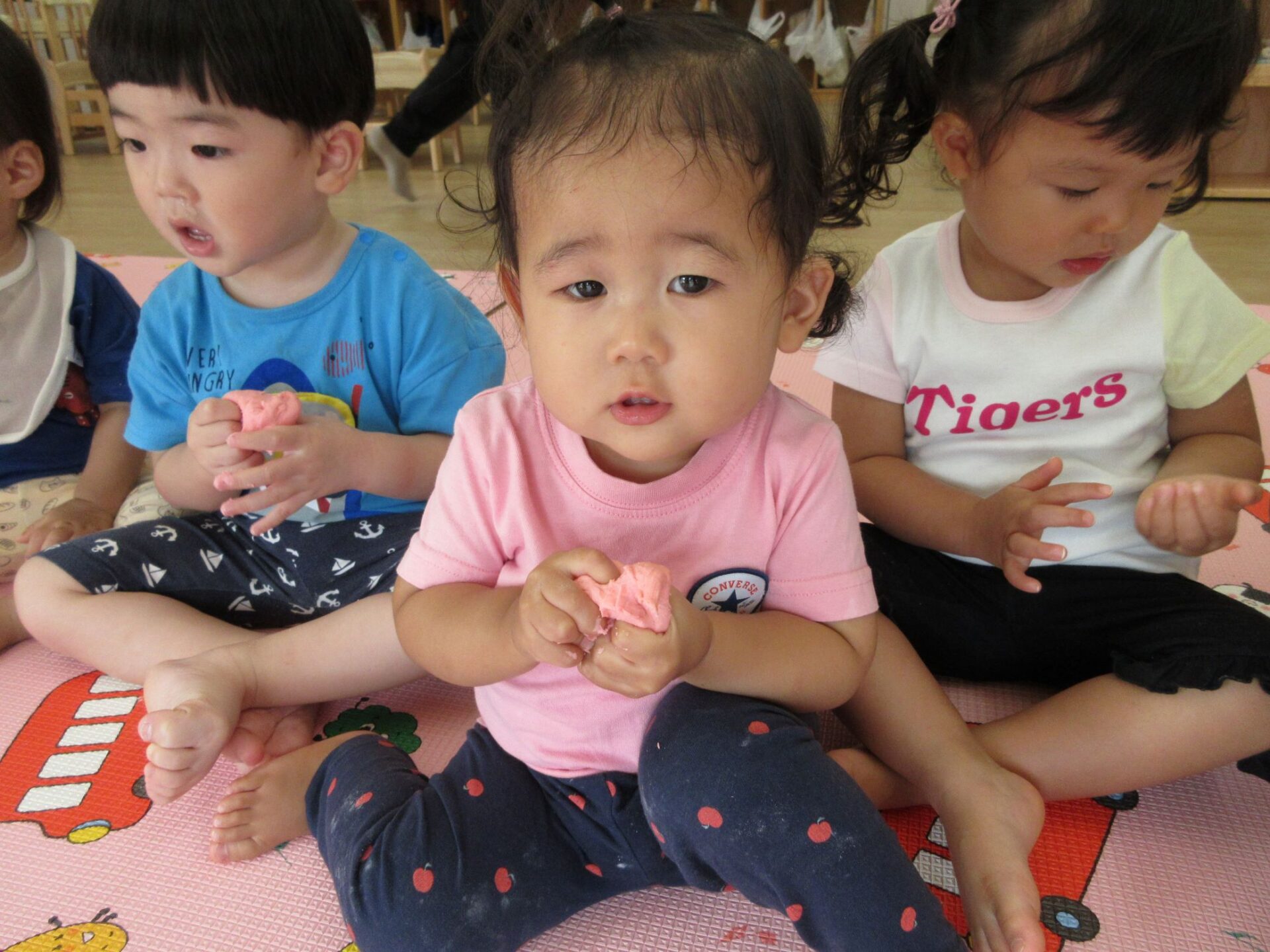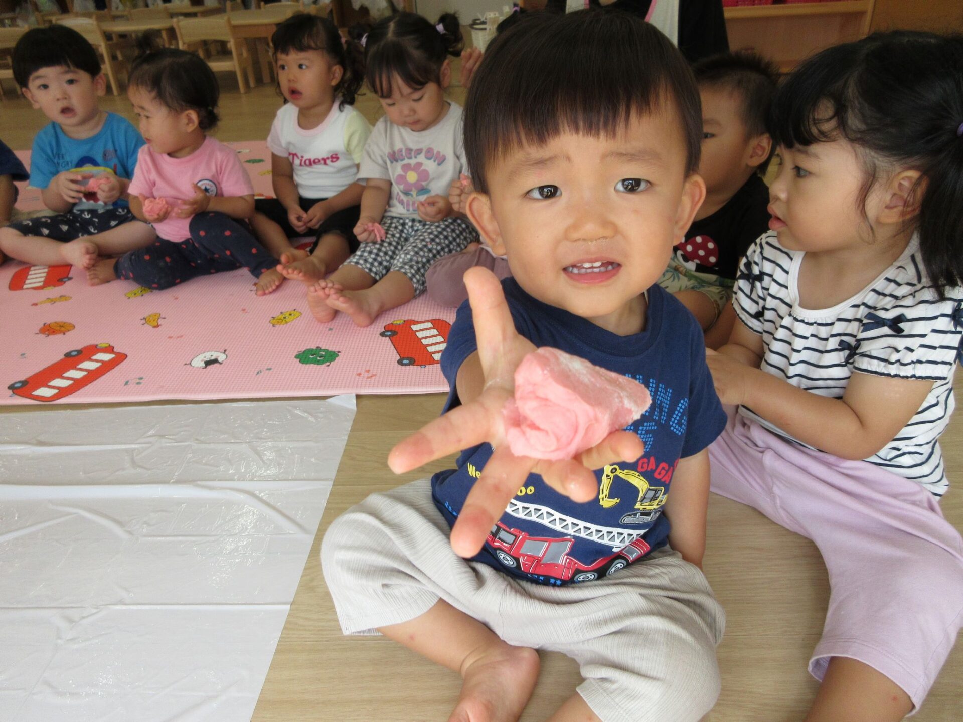 2023.09.19 お知らせ ブログ 小麦粉ねんど遊び 9月15日(金)、1歳だいち組では、小麦粉ねんど遊びをしました。はじめは、先生から説明してもらっています。「興味津々‥」 ねんどの感触を楽しんでいます。 順番にねんどを渡してもらっているんですね。 どんな感じなのかな? 別の色のねんども作ってもらって。 テーブルに移動して、しっかり遊びました。 丸めたり、ちぎったり。楽しく遊べたかな。 一覧へ戻る