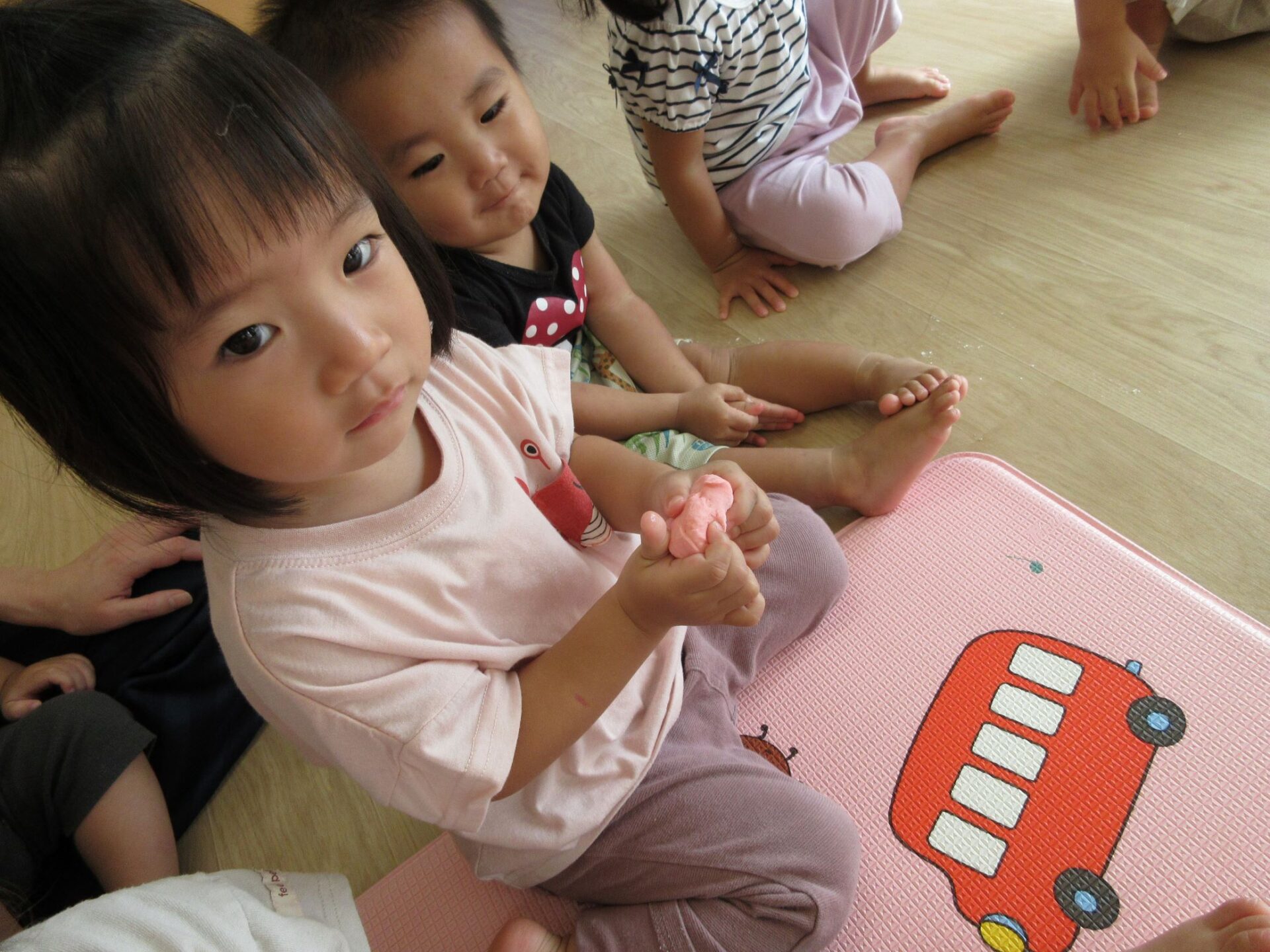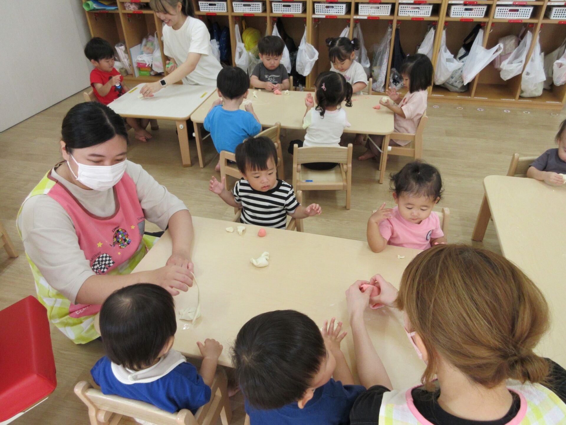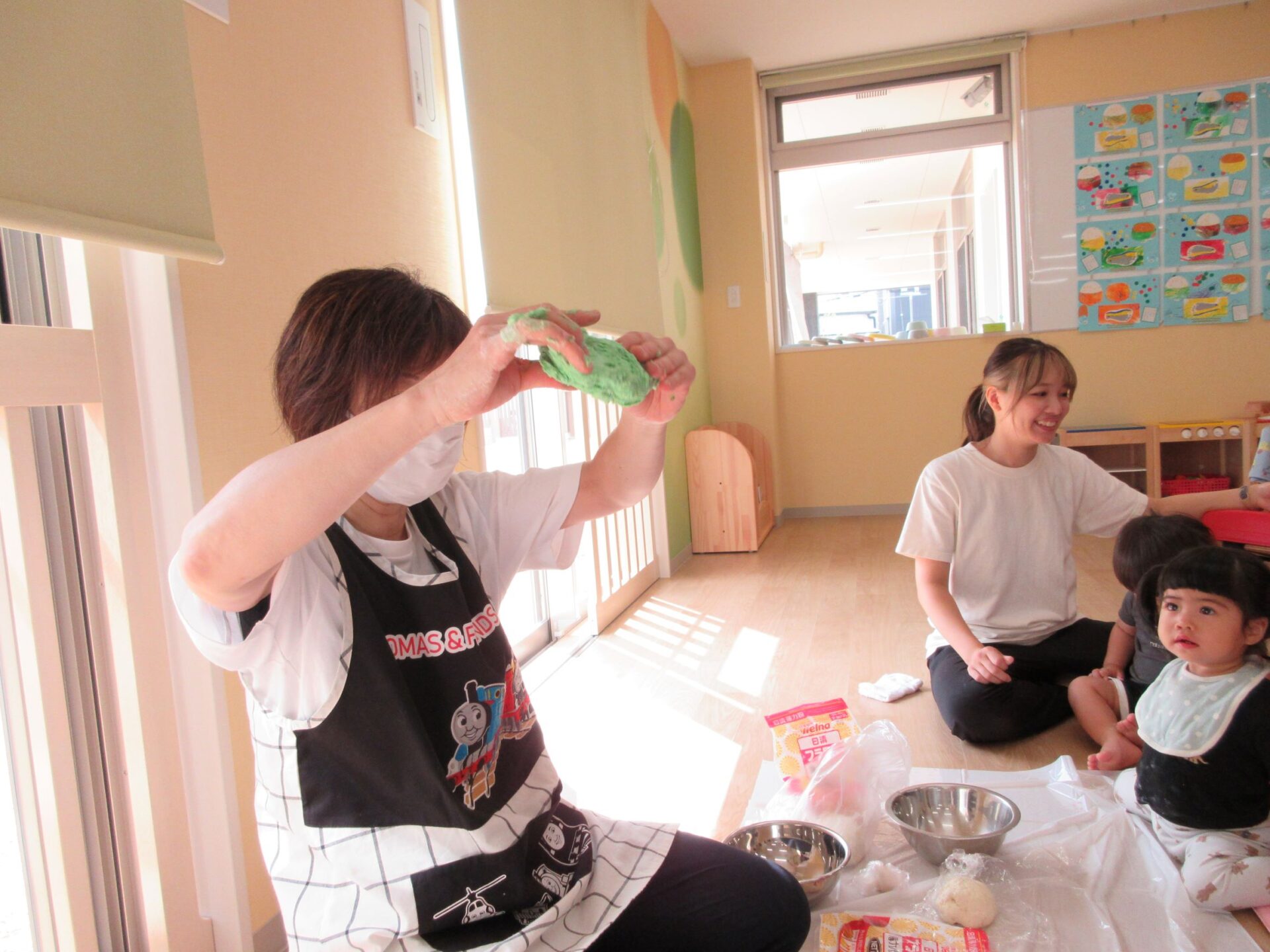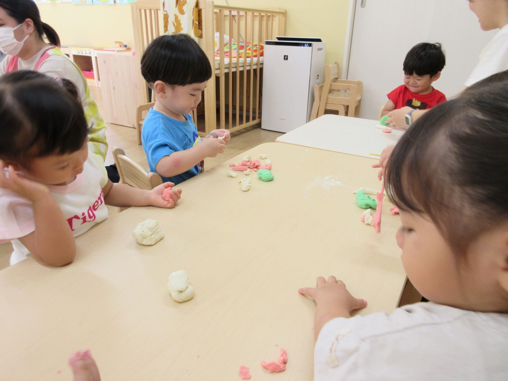 2023.09.19 お知らせ ブログ 小麦粉ねんど遊び 9月15日(金)、1歳だいち組では、小麦粉ねんど遊びをしました。はじめは、先生から説明してもらっています。「興味津々‥」 ねんどの感触を楽しんでいます。 順番にねんどを渡してもらっているんですね。 どんな感じなのかな? 別の色のねんども作ってもらって。 テーブルに移動して、しっかり遊びました。 丸めたり、ちぎったり。楽しく遊べたかな。 一覧へ戻る