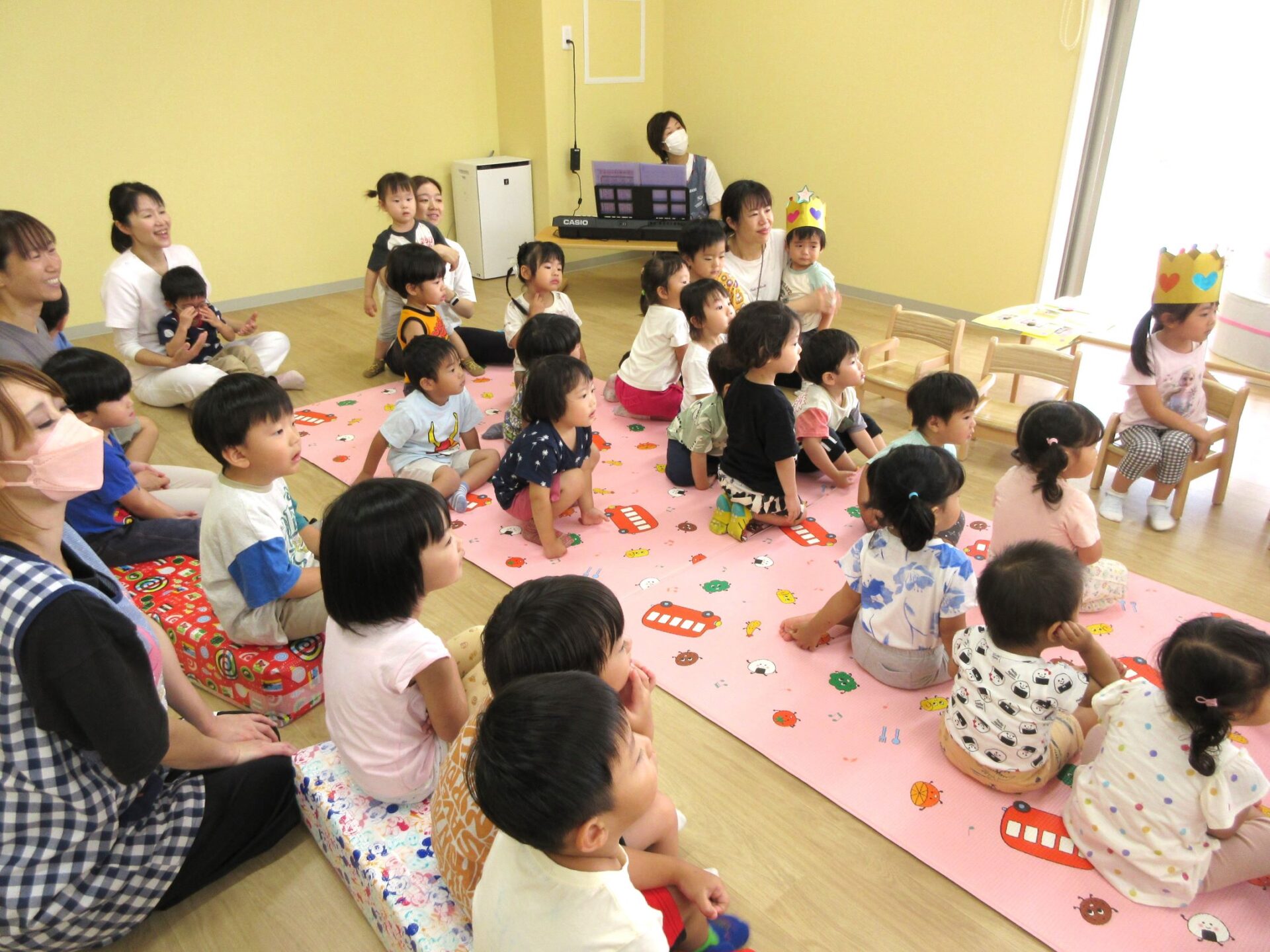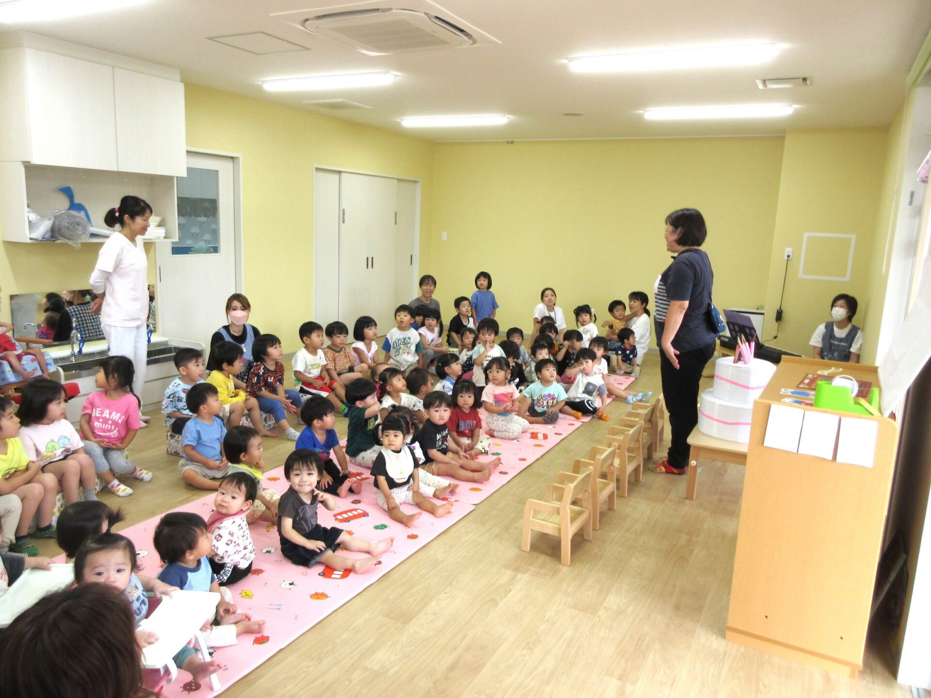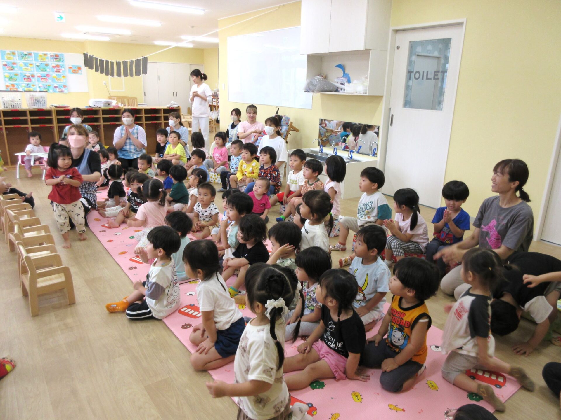今日、9日(水)は9月生まれの誕生会の日。10時に、1階の1歳だいち組の横のフロアに全クラスが集合しました。