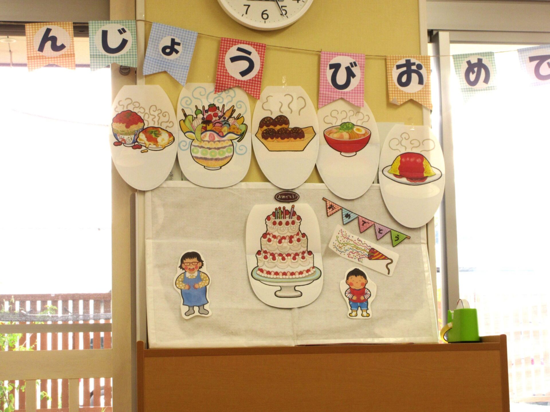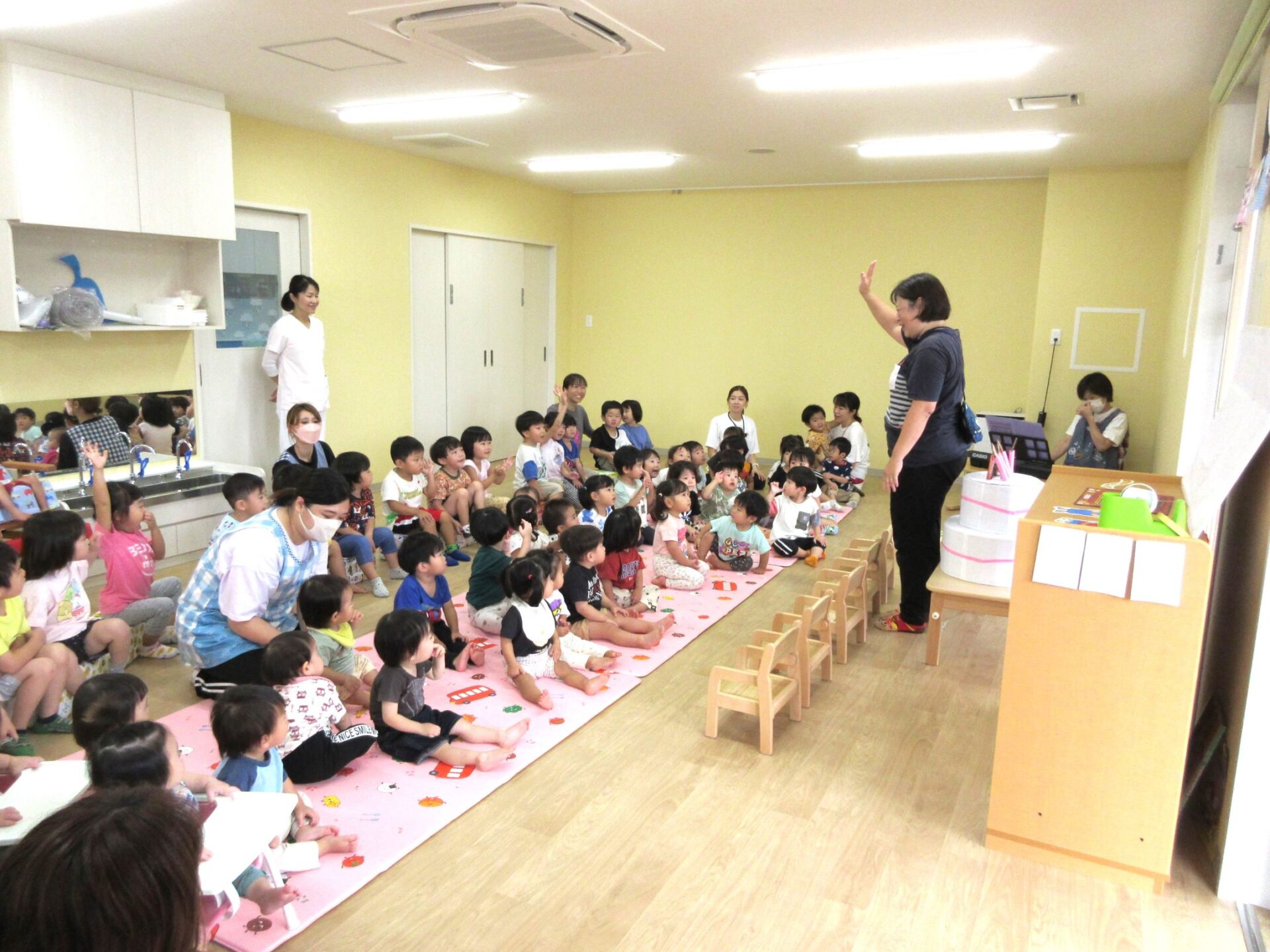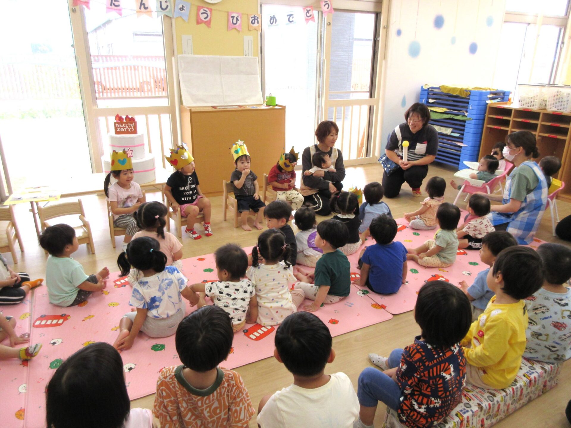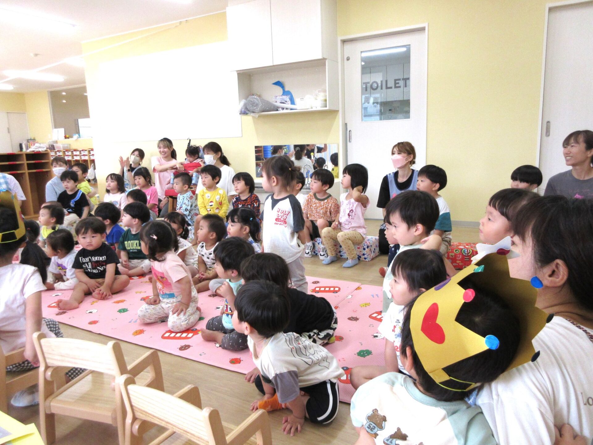 今日、9日(水)は9月生まれの誕生会の日。10時に、1階の1歳だいち組の横のフロアに全クラスが集合しました。