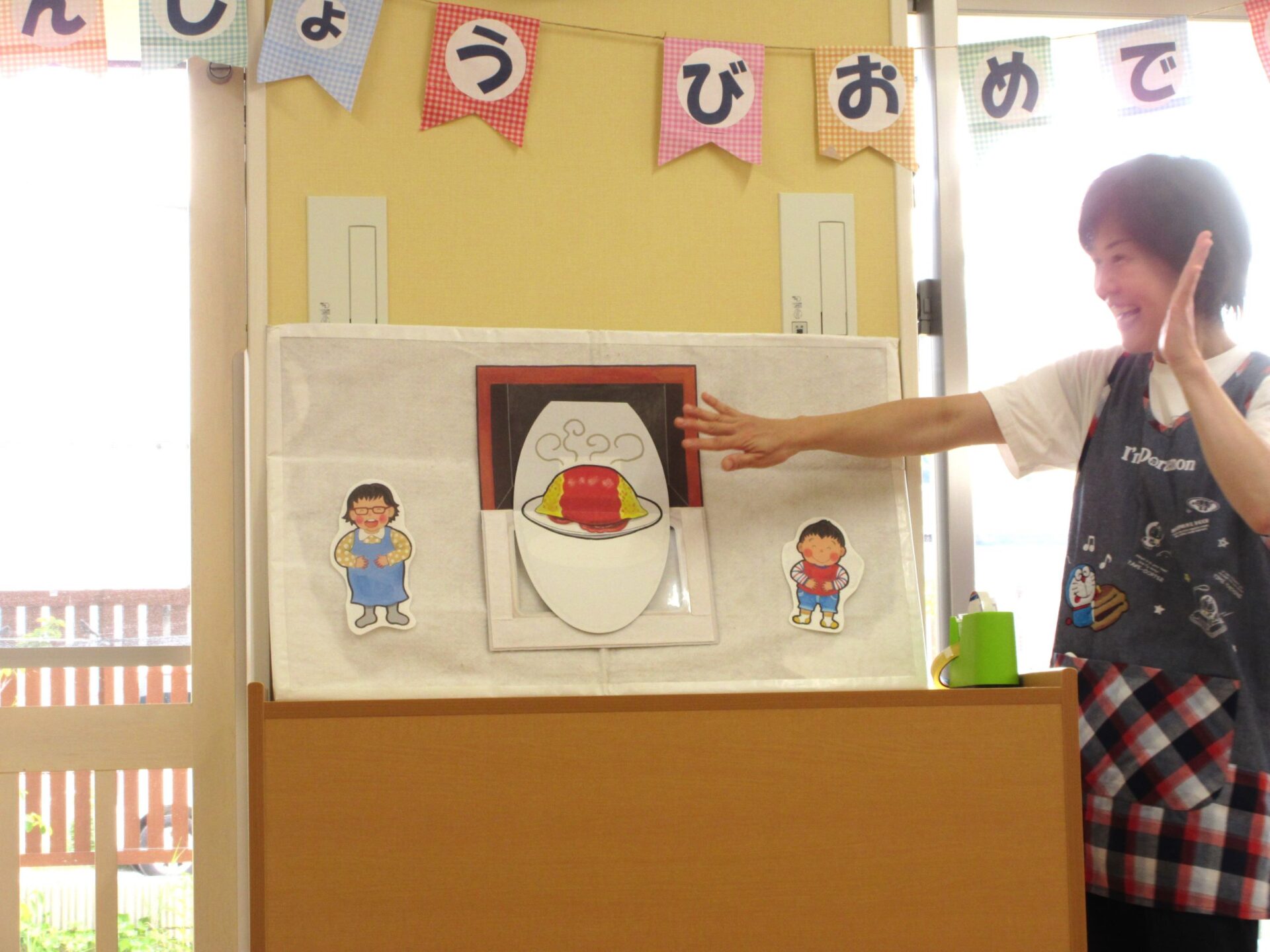 それから、みんなのお楽しみの出し物。今回は、「魔法の電子レンジ」。お皿を電子レンジに入れて、みんなで歌をうたうと、なんと!お料理が出てきます。